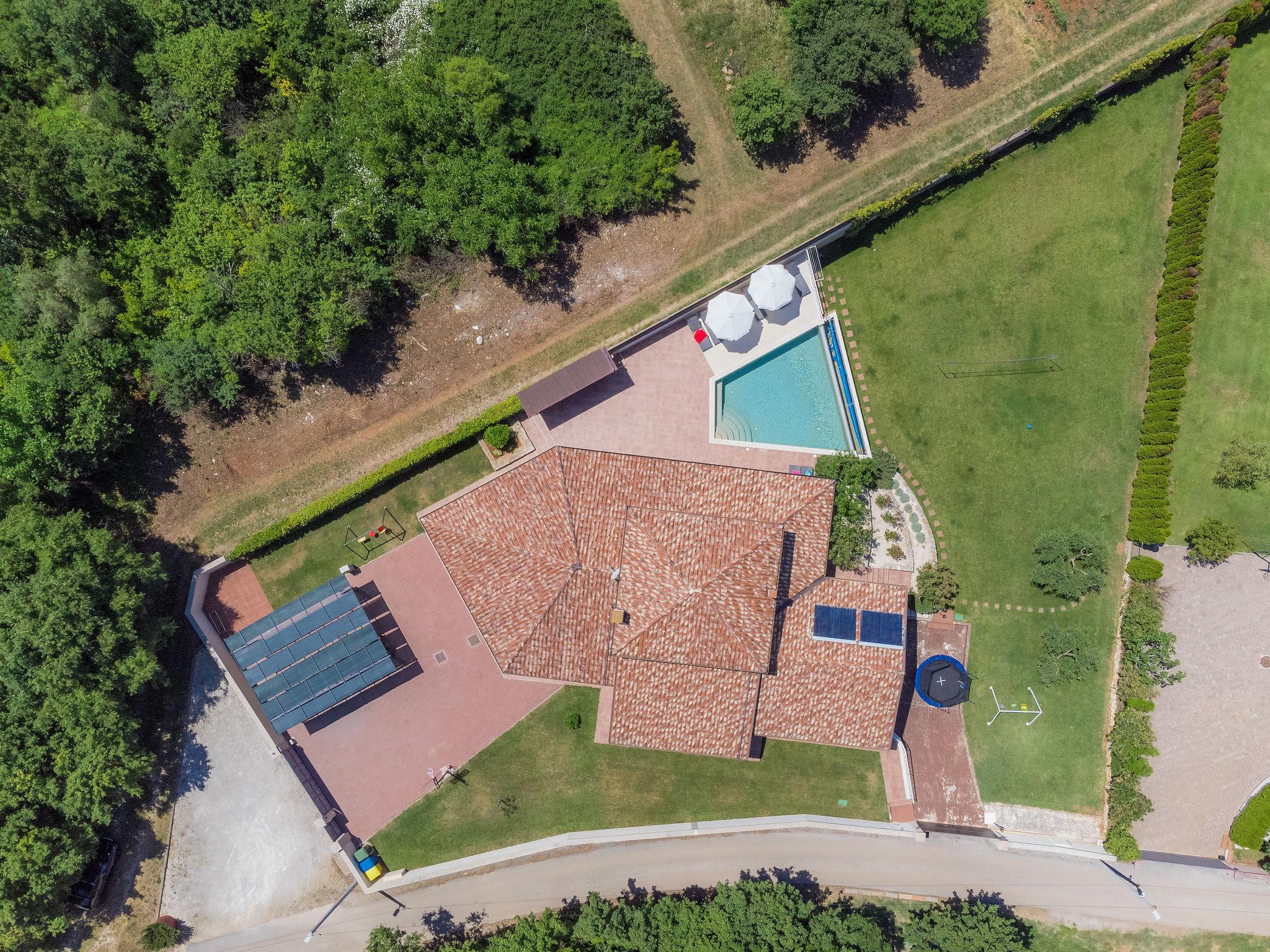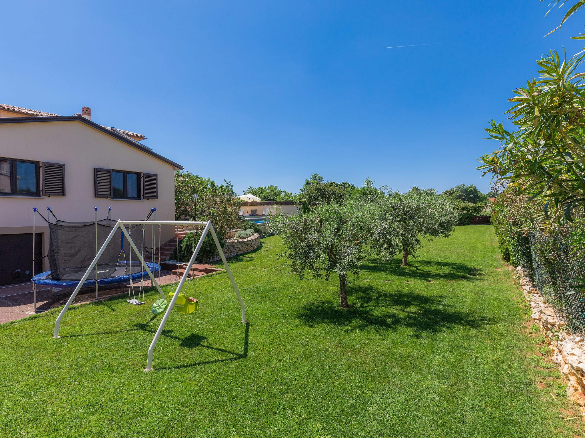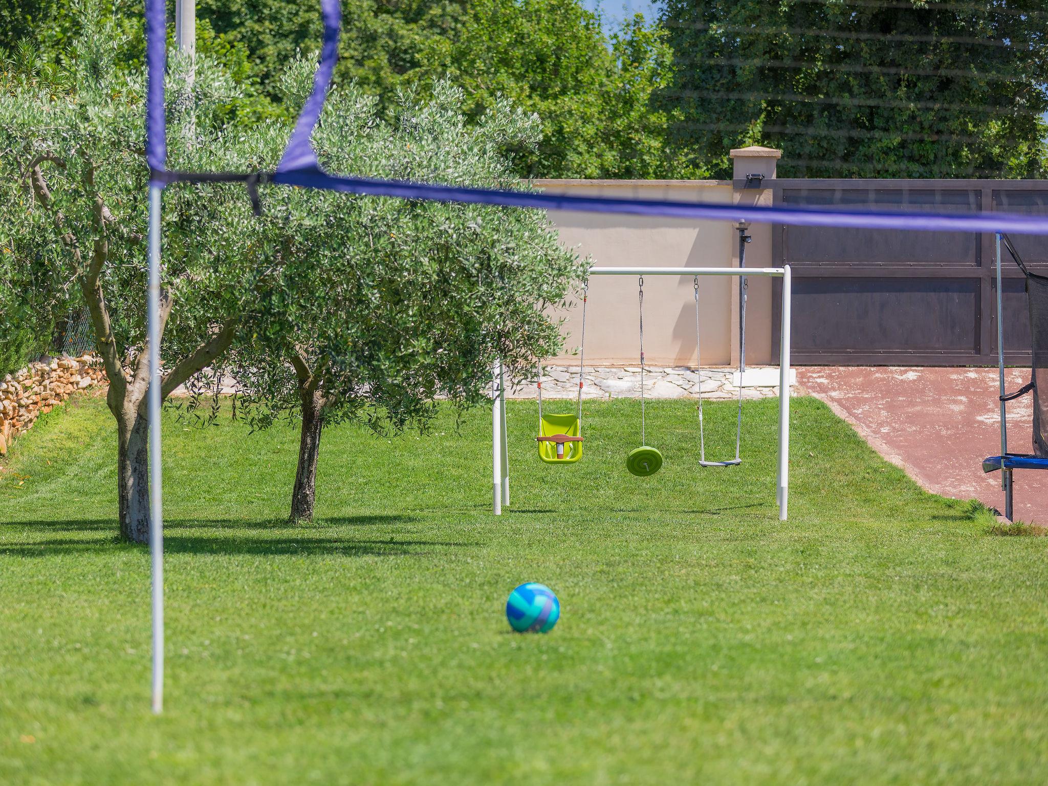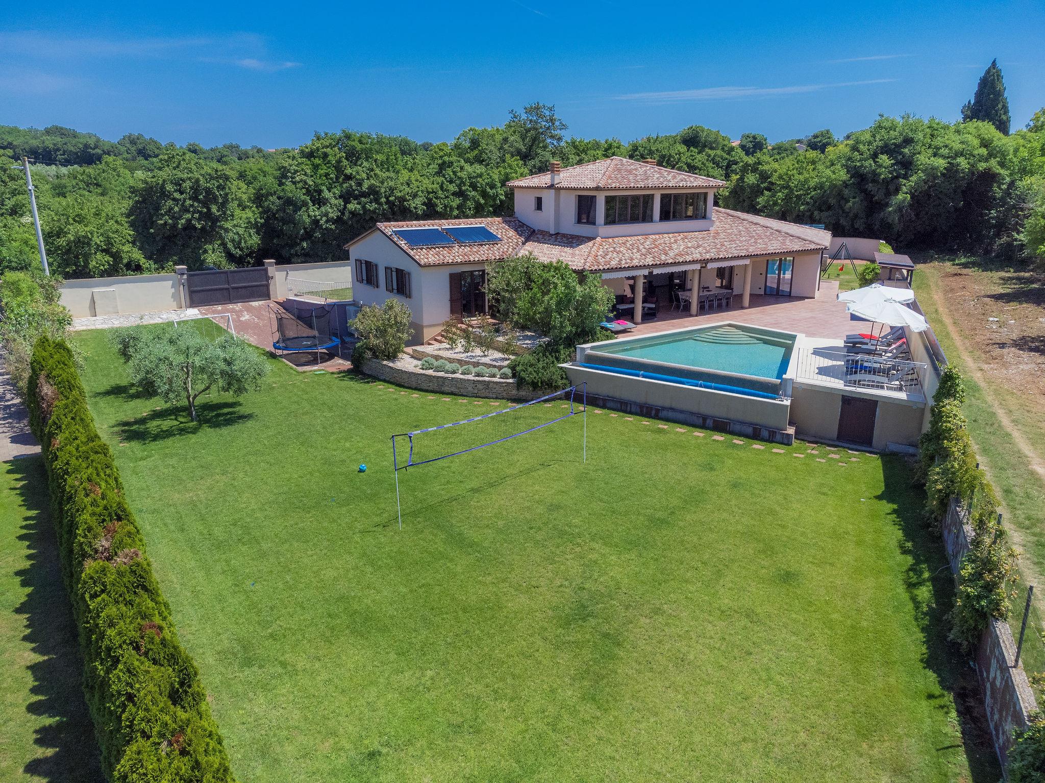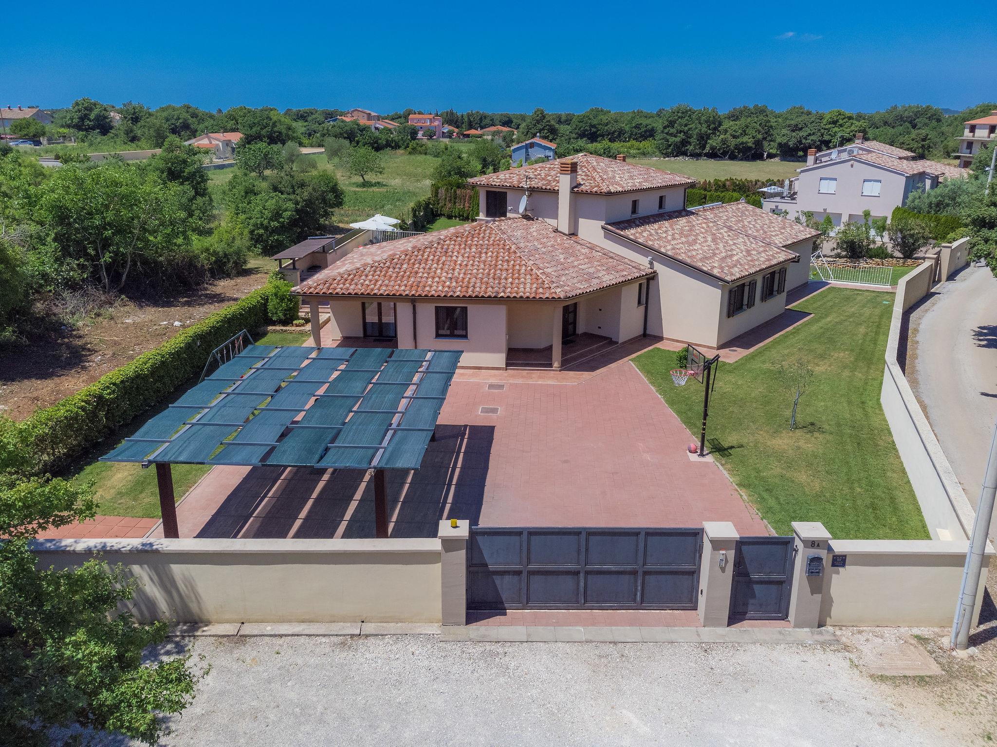 Single-family house "Andrea", 2 storeys. 300 m from the centre of Šišan, 4 km from the centre of Medulin, 7 km from the centre of Pula, 4 km from the sea, 4 km from the beach. Private: property 1'700 m2 with lawn and wildlife garden, swimming pool heated (59 m2, depth 125 cm, seasonal availability: 01.May. - 05.Nov.) with internal staircase. Unconventional pool shape. Outdoor shower, basketball, volleyball, badminton, terrace, garden furniture, barbecue (slide, swing). In the house: internet access, trampoline, burglar alarm system, washing machine. Parking (for 3 cars) on the premises. Shop, restaurant 300 m, bus stop 350 m, pebble beach 4 km, rocky beach 4 km. Please note: airfield 10 km from the property. Swimming pool heated (extra). Private: outdoor kitchen (4 gas rings).
