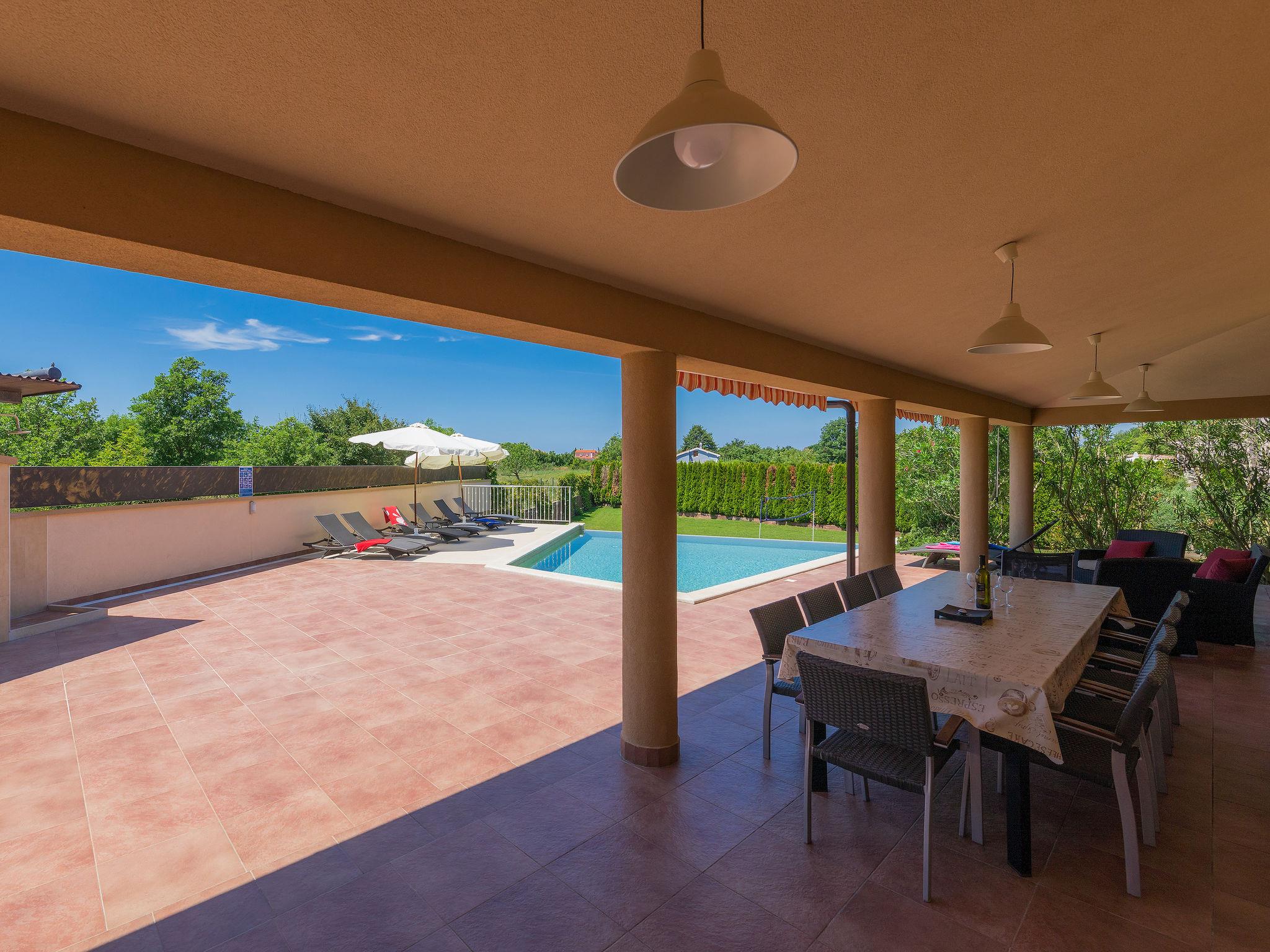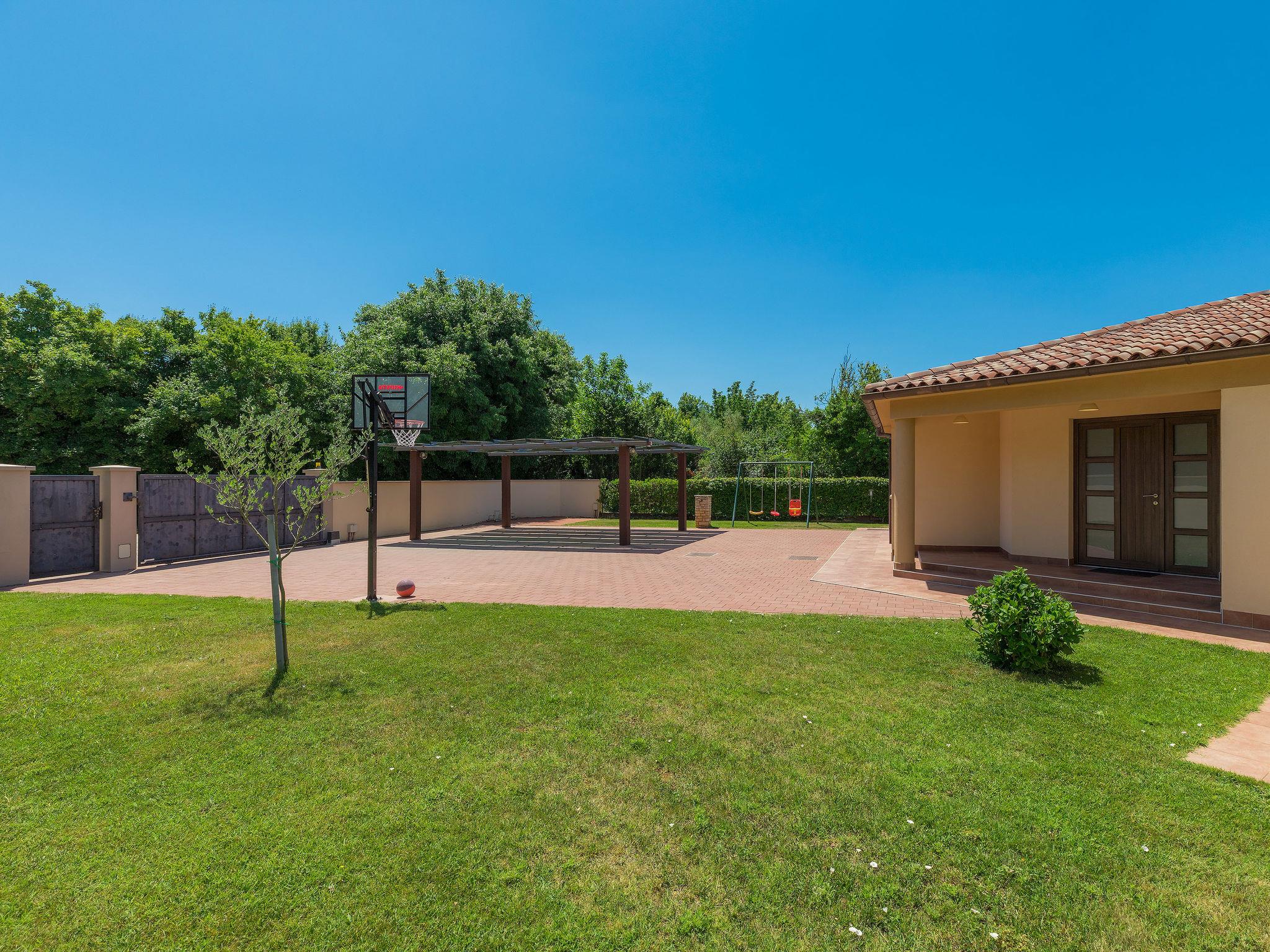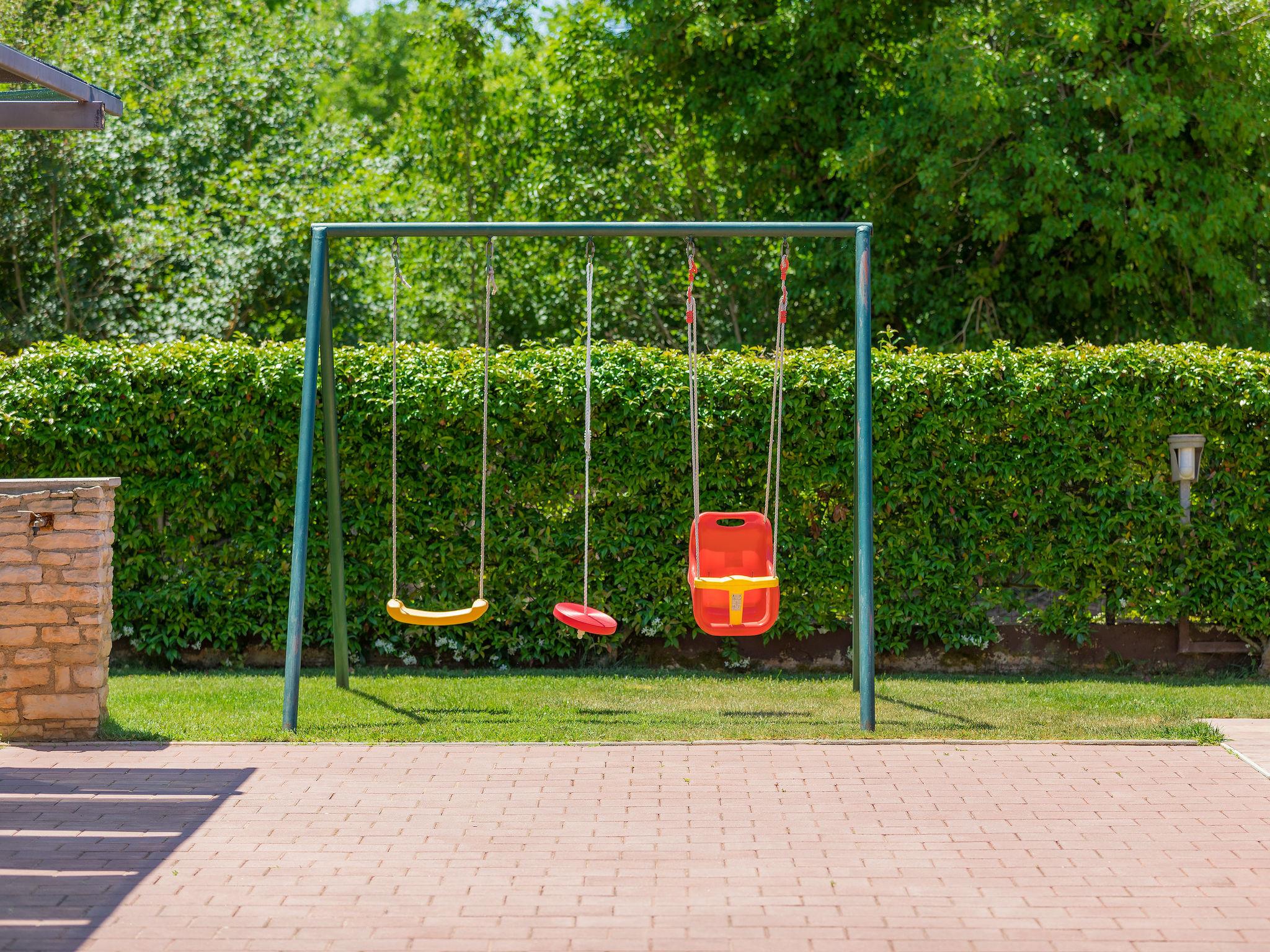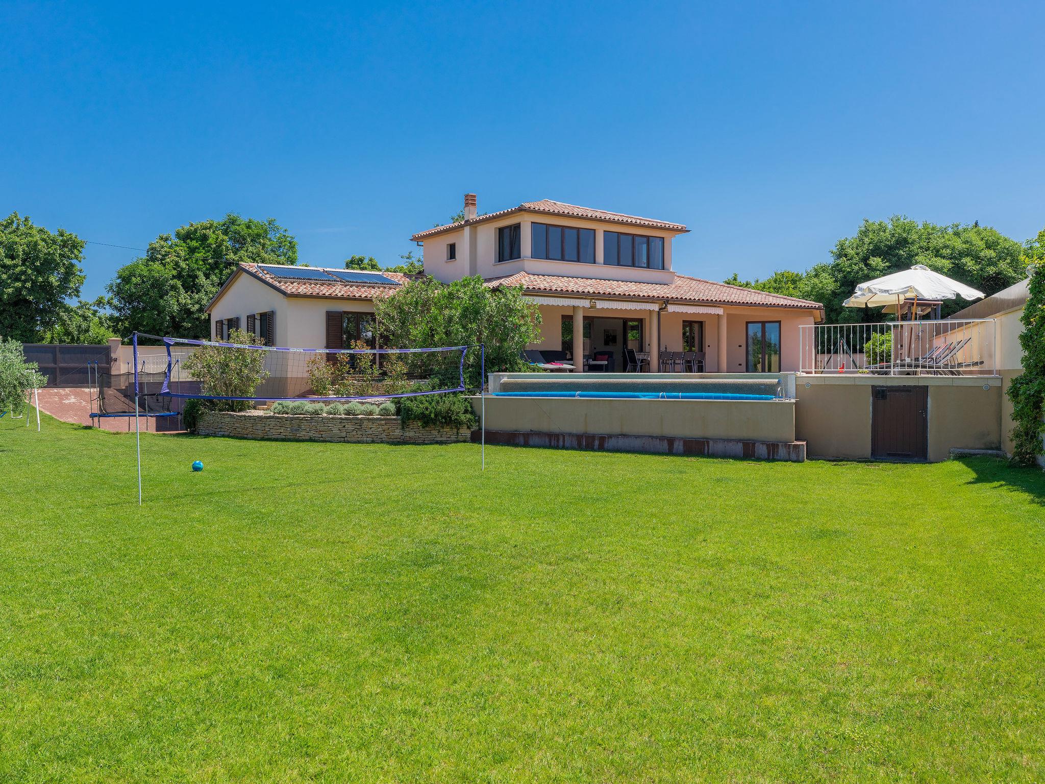 Single-family house "Andrea", 2 storeys. 300 m from the centre of Šišan, 4 km from the centre of Medulin, 7 km from the centre of Pula, 4 km from the sea, 4 km from the beach. Private: property 1'700 m2 with lawn and wildlife garden, swimming pool heated (59 m2, depth 125 cm, seasonal availability: 01.May. - 05.Nov.) with internal staircase. Unconventional pool shape. Outdoor shower, basketball, volleyball, badminton, terrace, garden furniture, barbecue (slide, swing). In the house: internet access, trampoline, burglar alarm system, washing machine. Parking (for 3 cars) on the premises. Shop, restaurant 300 m, bus stop 350 m, pebble beach 4 km, rocky beach 4 km. Please note: airfield 10 km from the property. Swimming pool heated (extra). Private: outdoor kitchen (4 gas rings).