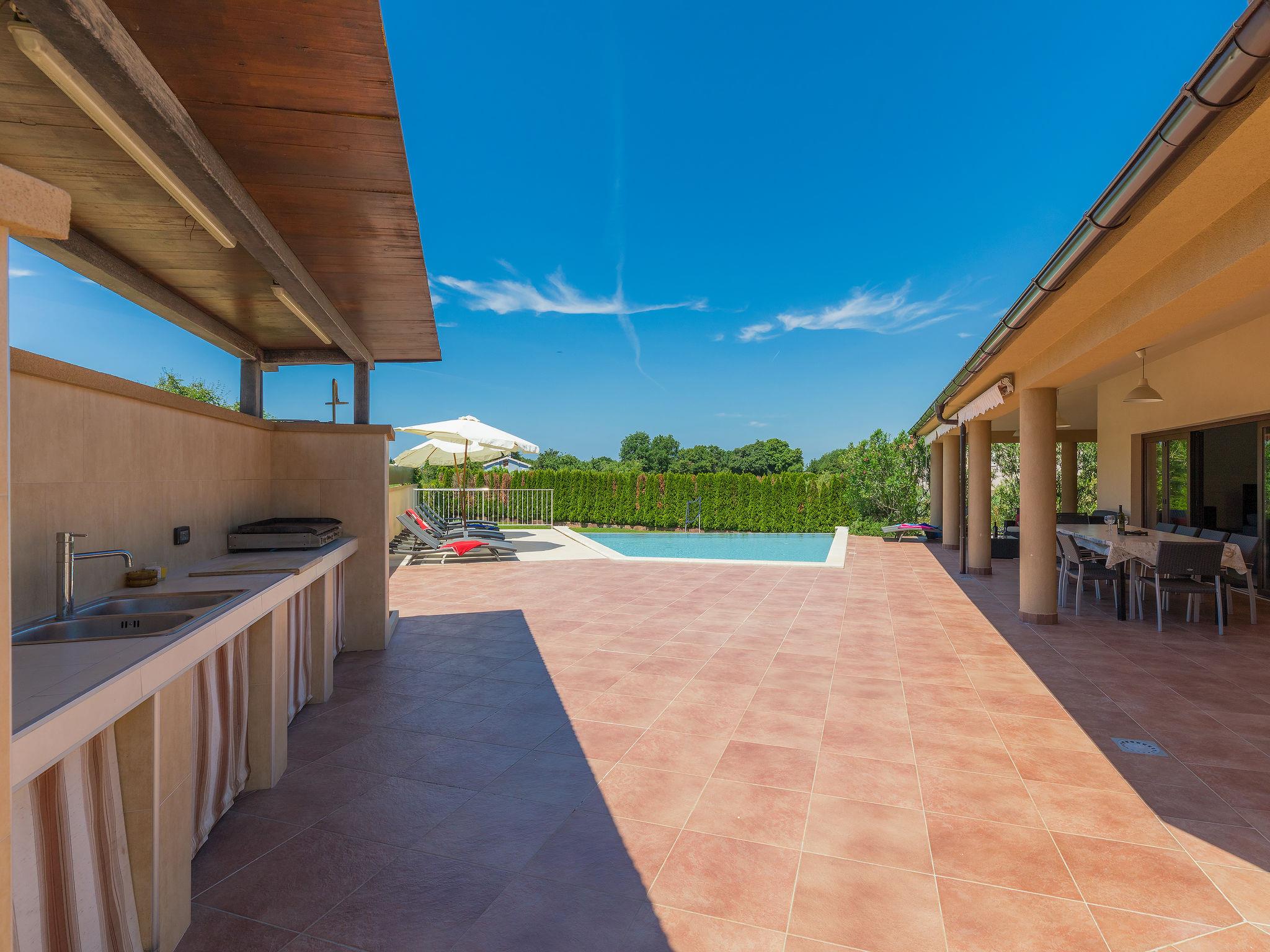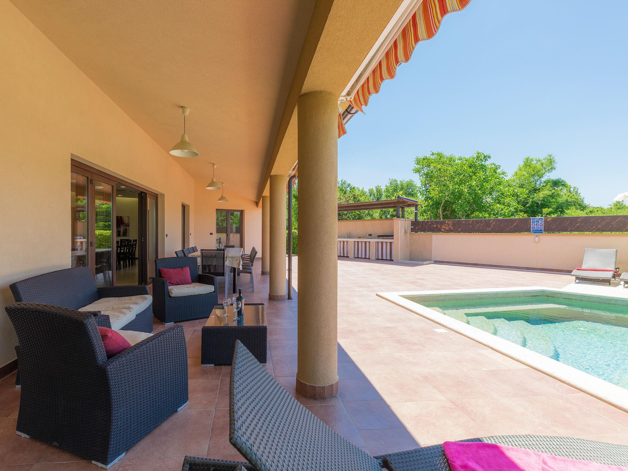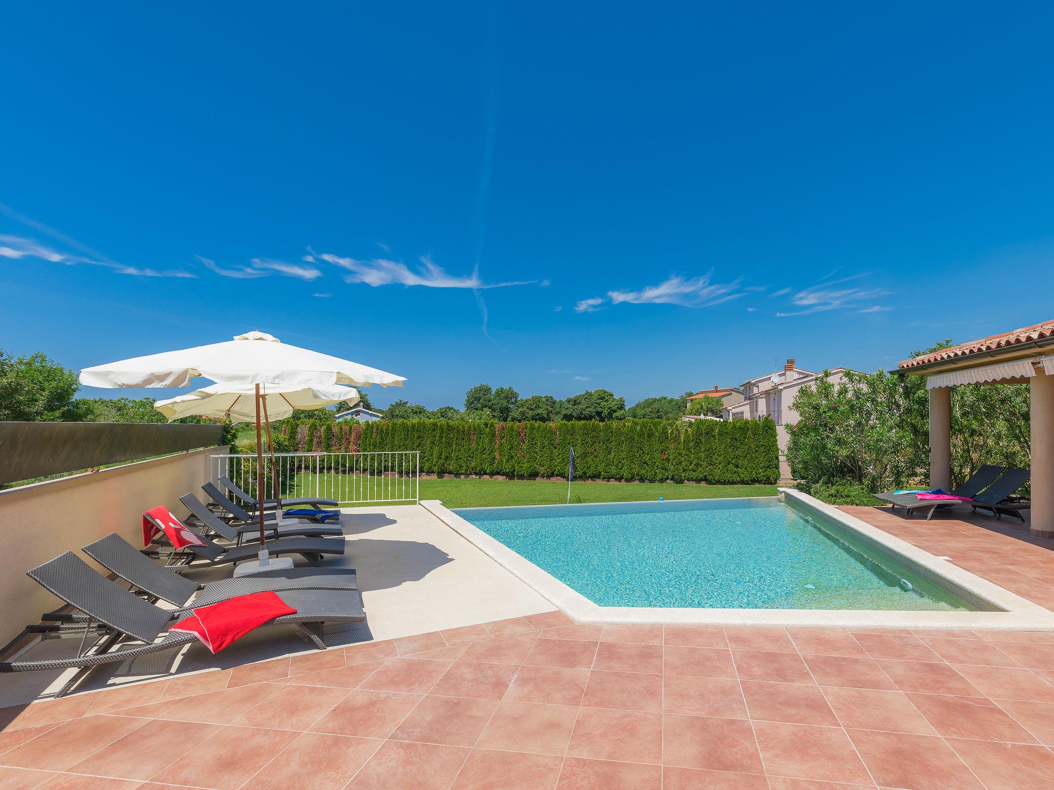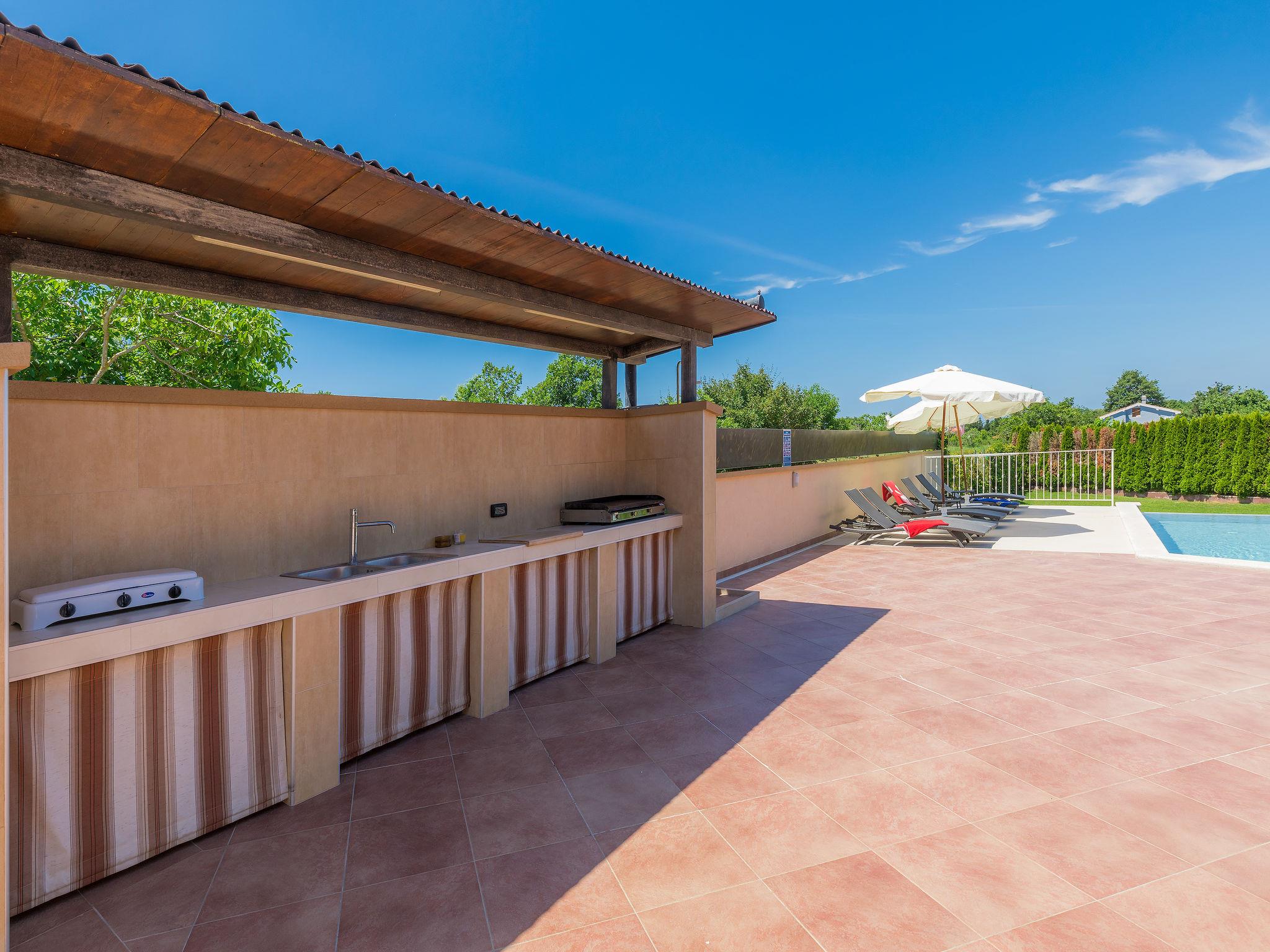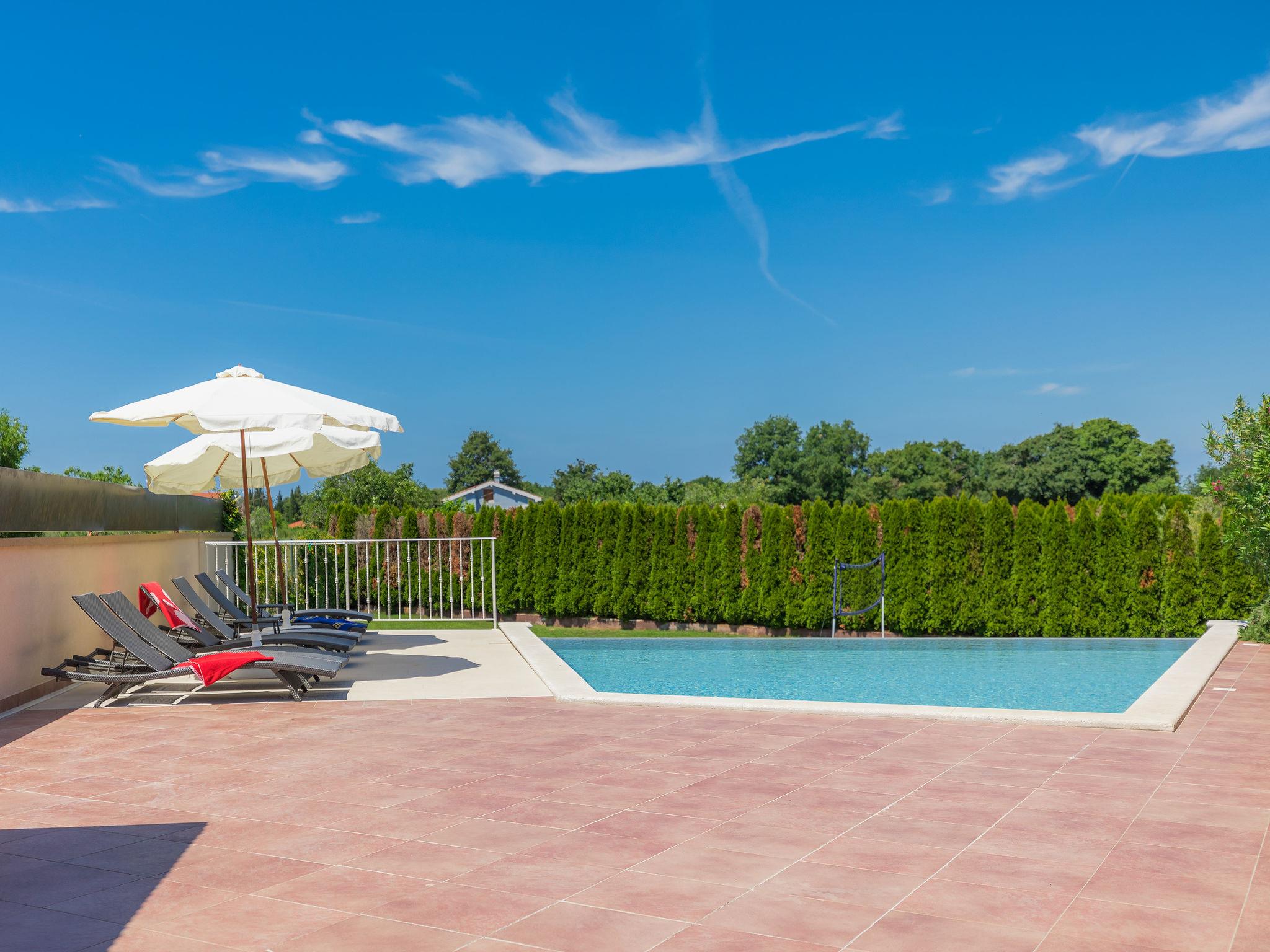 Single-family house "Andrea", 2 storeys. 300 m from the centre of Šišan, 4 km from the centre of Medulin, 7 km from the centre of Pula, 4 km from the sea, 4 km from the beach. Private: property 1'700 m2 with lawn and wildlife garden, swimming pool heated (59 m2, depth 125 cm, seasonal availability: 01.May. - 05.Nov.) with internal staircase. Unconventional pool shape. Outdoor shower, basketball, volleyball, badminton, terrace, garden furniture, barbecue (slide, swing). In the house: internet access, trampoline, burglar alarm system, washing machine. Parking (for 3 cars) on the premises. Shop, restaurant 300 m, bus stop 350 m, pebble beach 4 km, rocky beach 4 km. Please note: airfield 10 km from the property. Swimming pool heated (extra). Private: outdoor kitchen (4 gas rings).