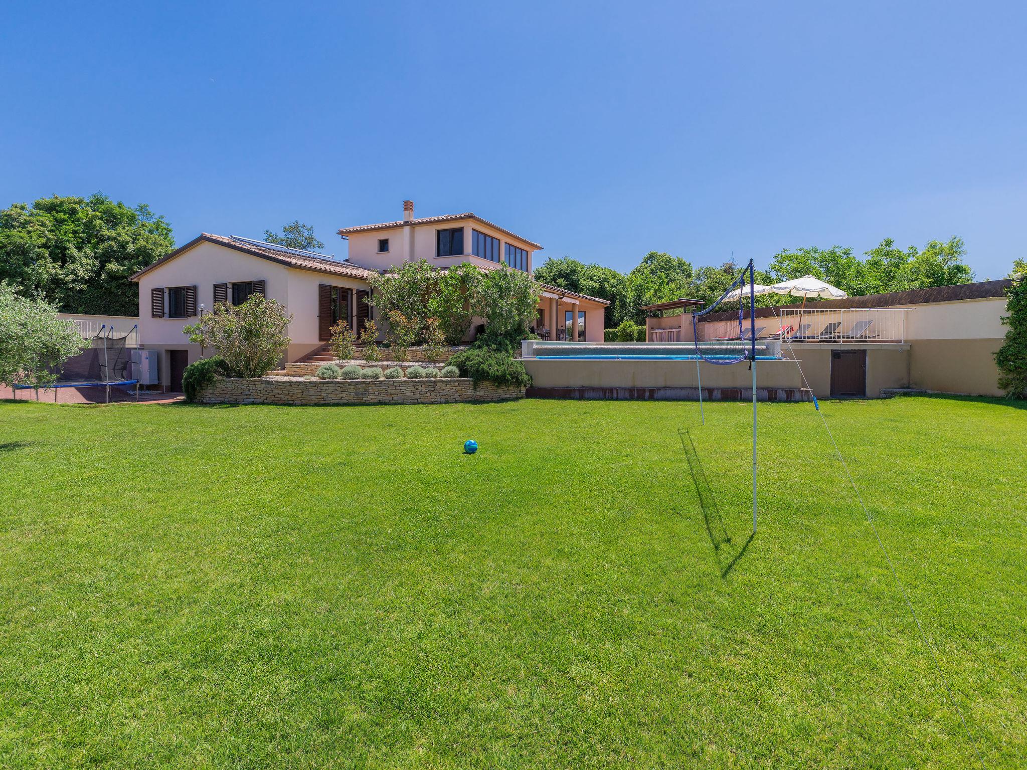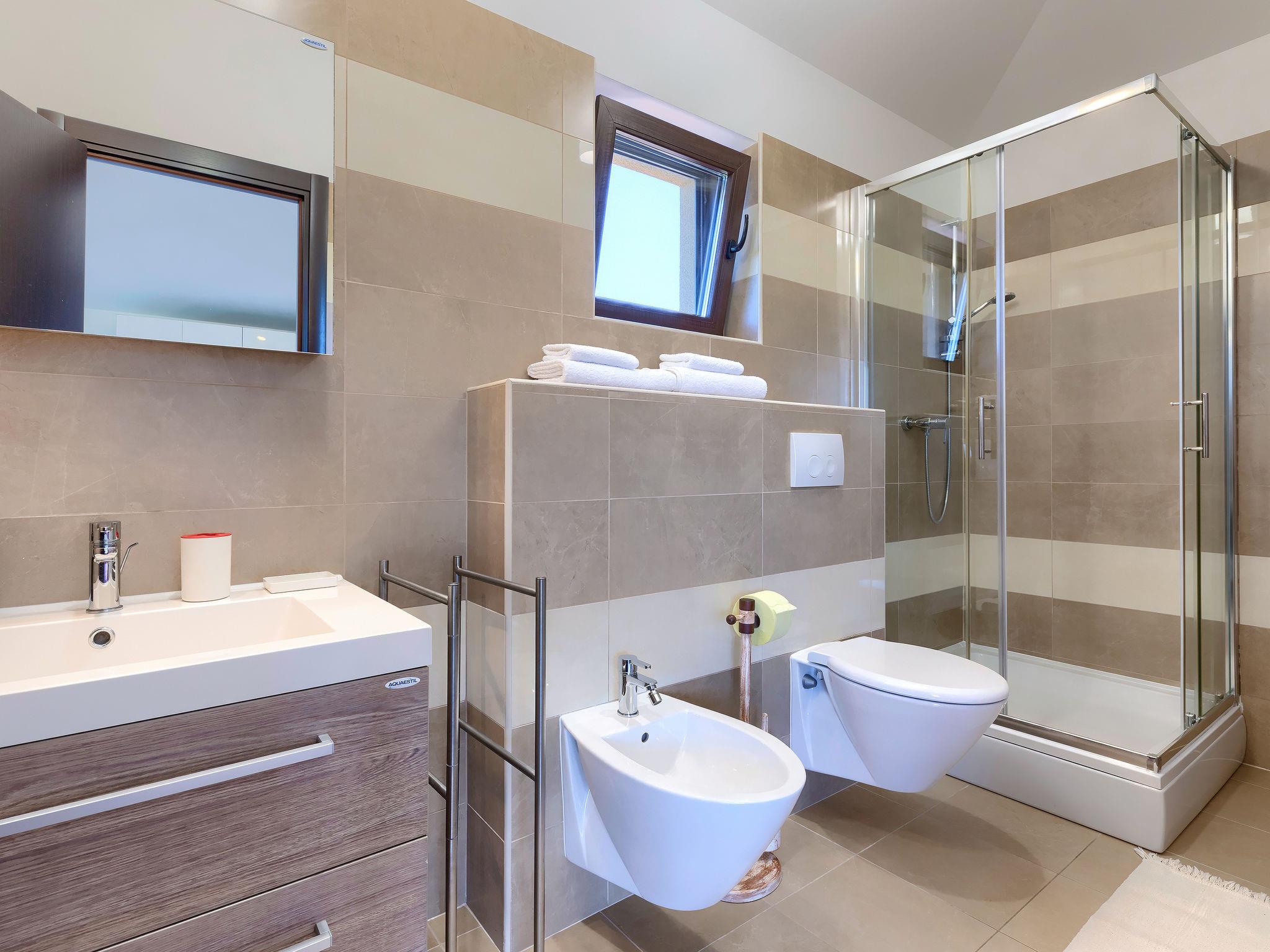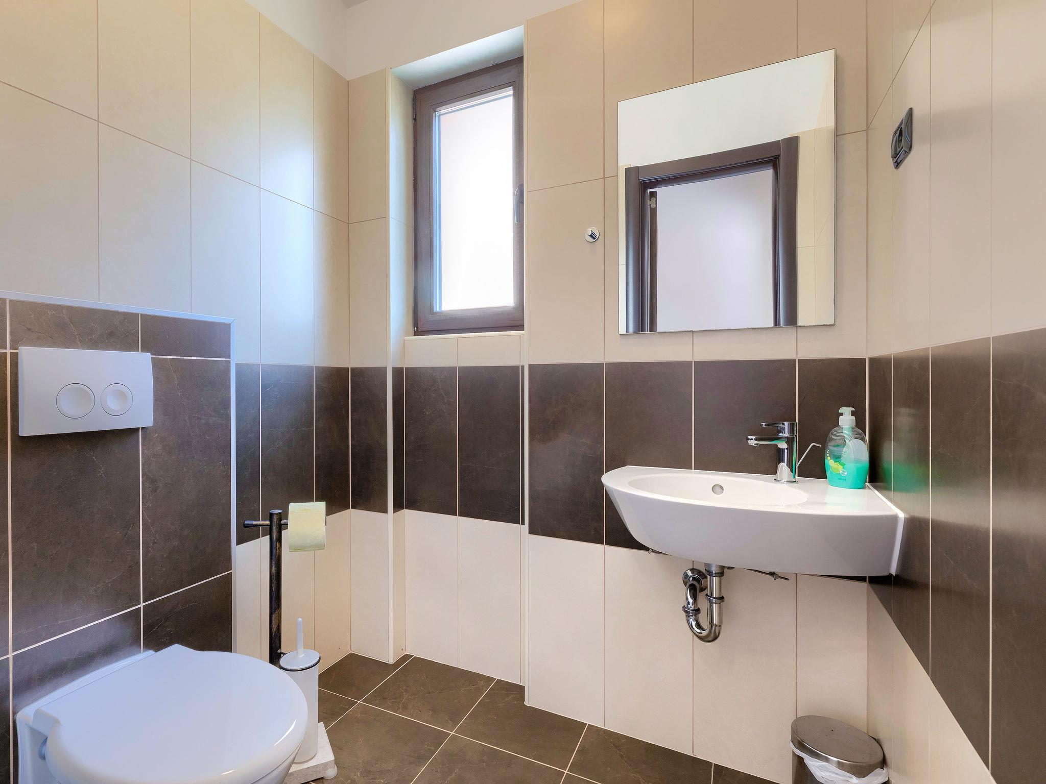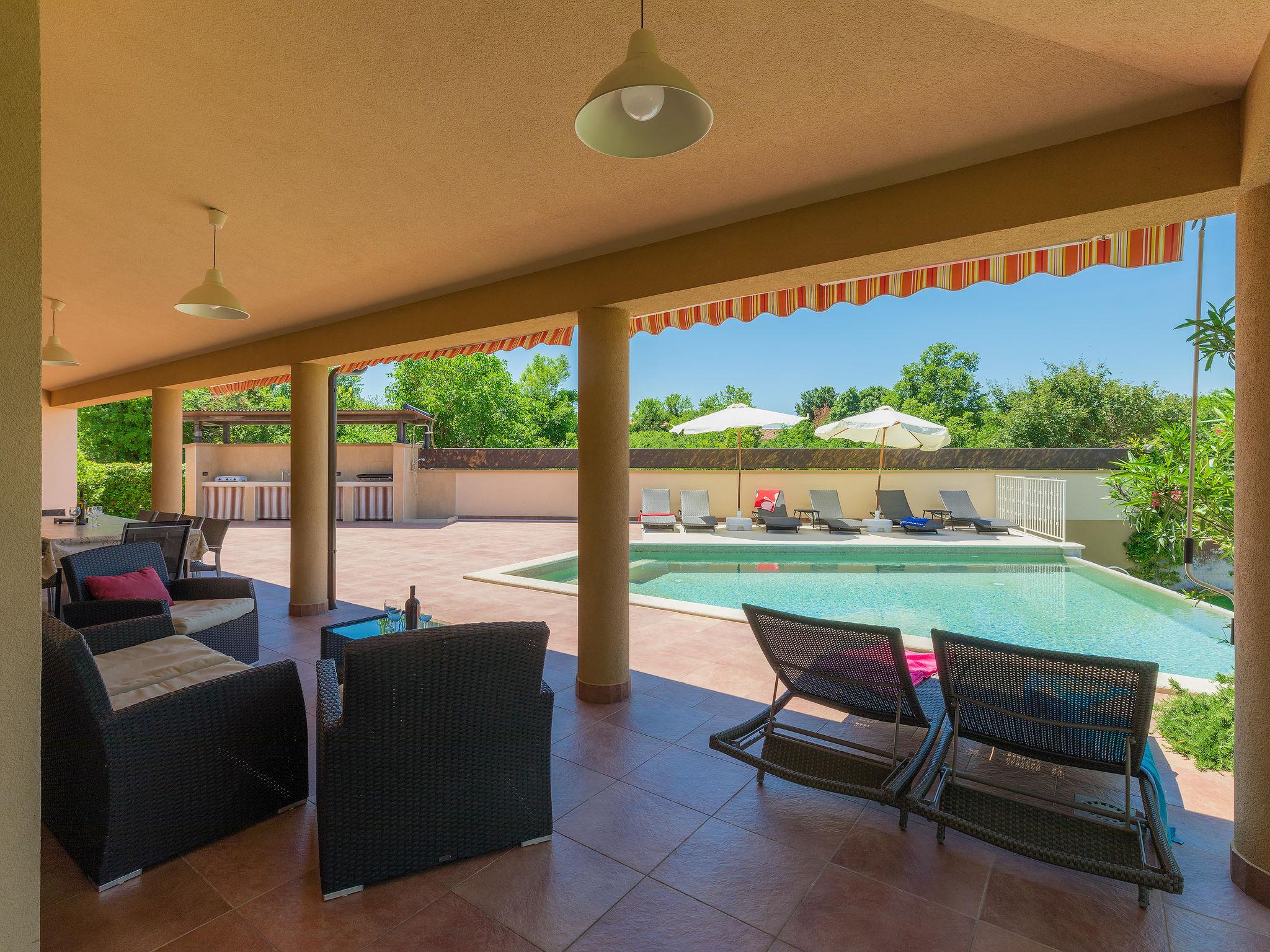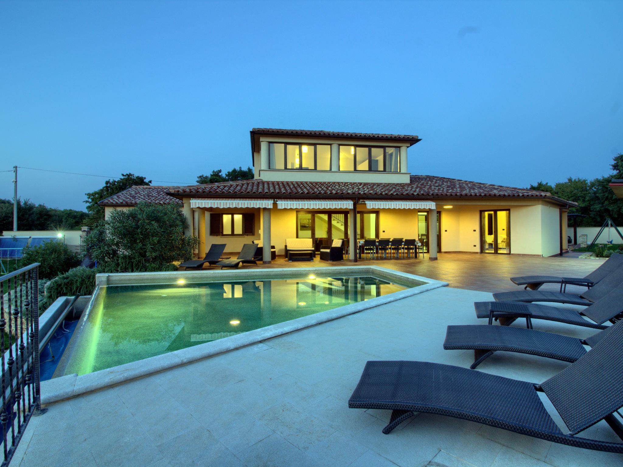 Single-family house "Andrea", 2 storeys. 300 m from the centre of Šišan, 4 km from the centre of Medulin, 7 km from the centre of Pula, 4 km from the sea, 4 km from the beach. Private: property 1'700 m2 with lawn and wildlife garden, swimming pool heated (59 m2, depth 125 cm, seasonal availability: 01.May. - 05.Nov.) with internal staircase. Unconventional pool shape. Outdoor shower, basketball, volleyball, badminton, terrace, garden furniture, barbecue (slide, swing). In the house: internet access, trampoline, burglar alarm system, washing machine. Parking (for 3 cars) on the premises. Shop, restaurant 300 m, bus stop 350 m, pebble beach 4 km, rocky beach 4 km. Please note: airfield 10 km from the property. Swimming pool heated (extra). Private: outdoor kitchen (4 gas rings).