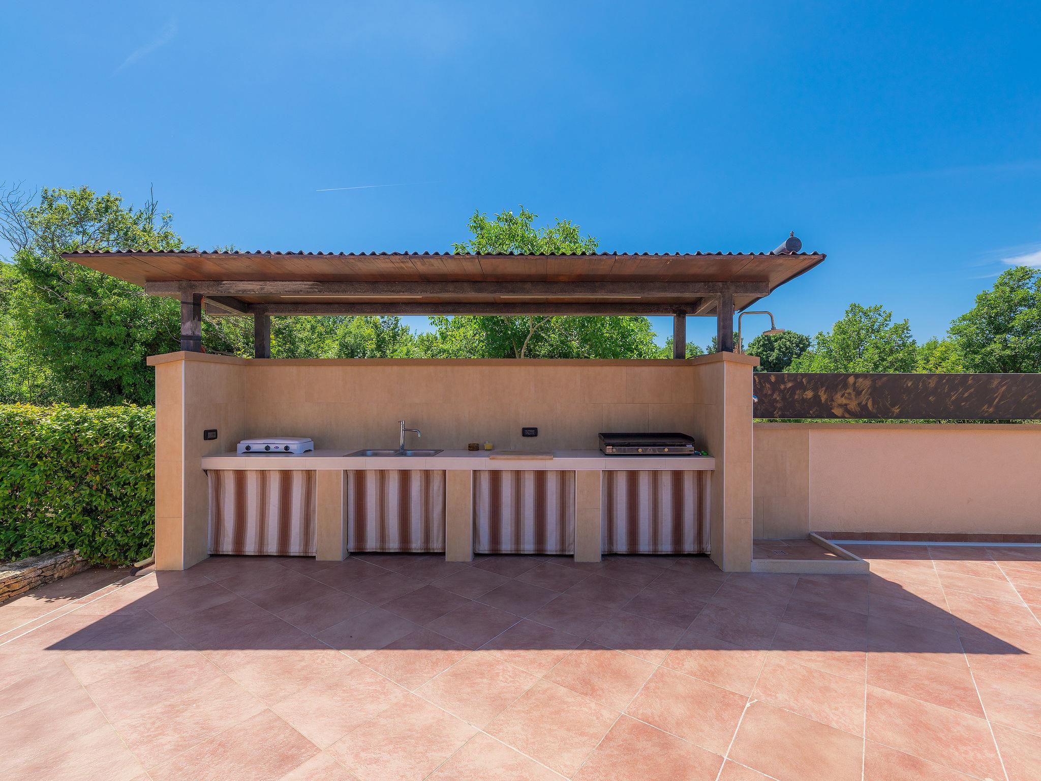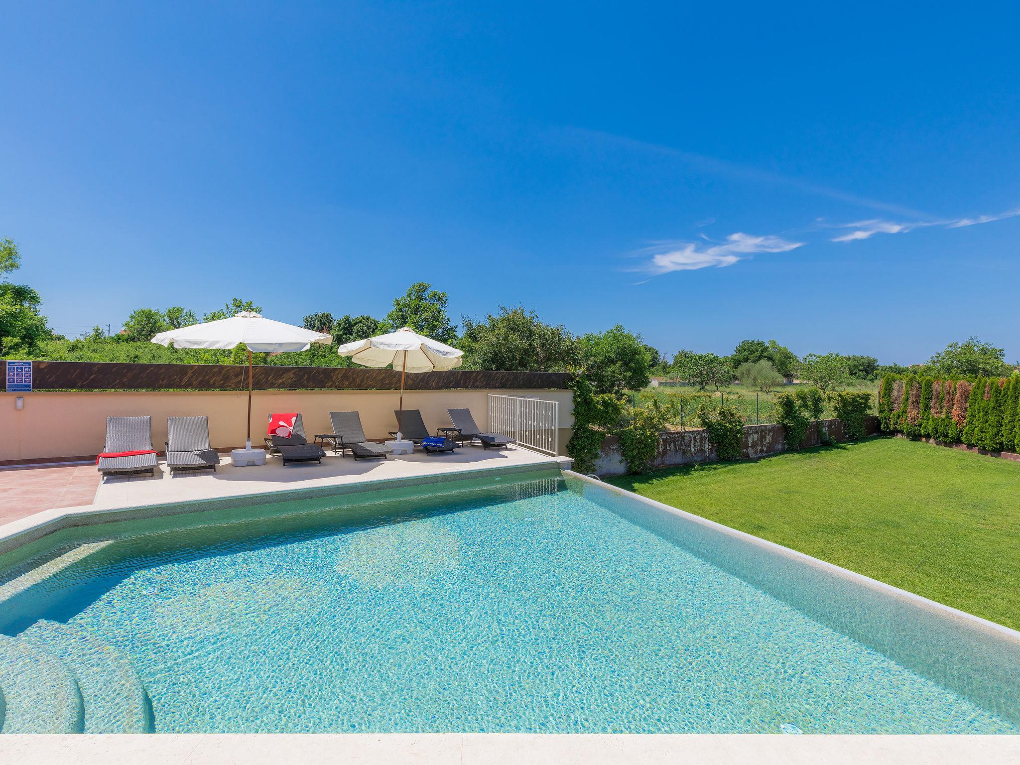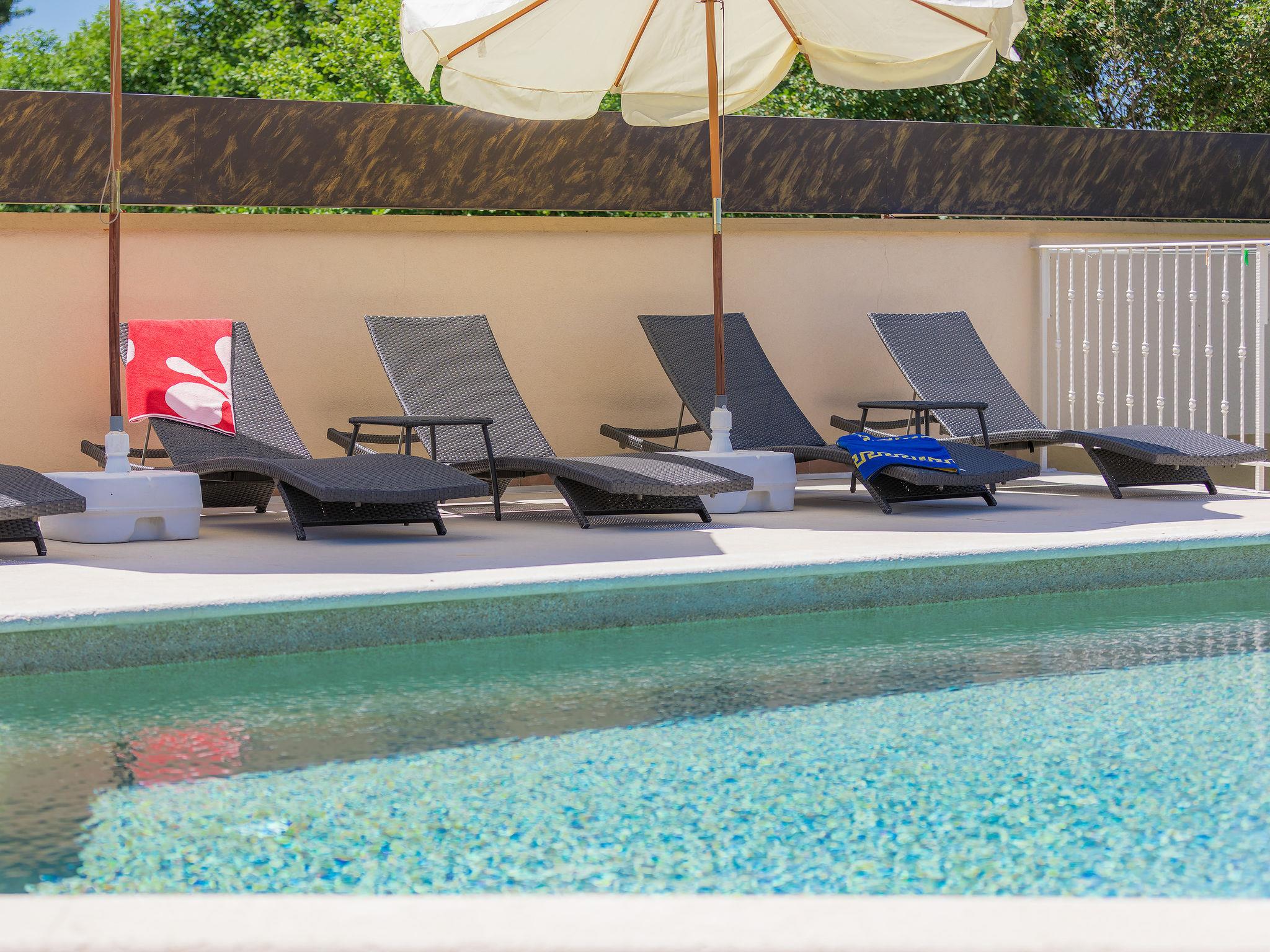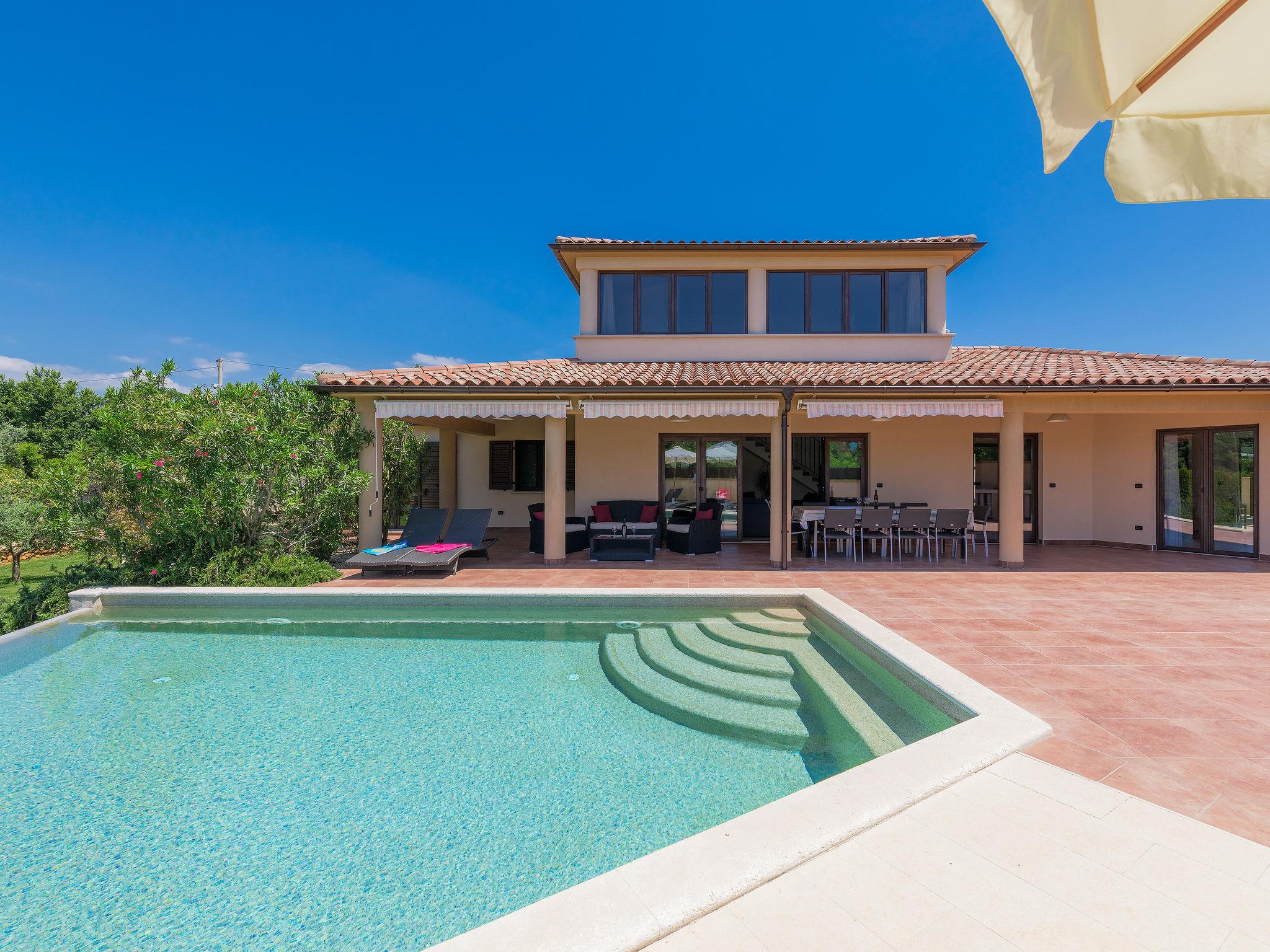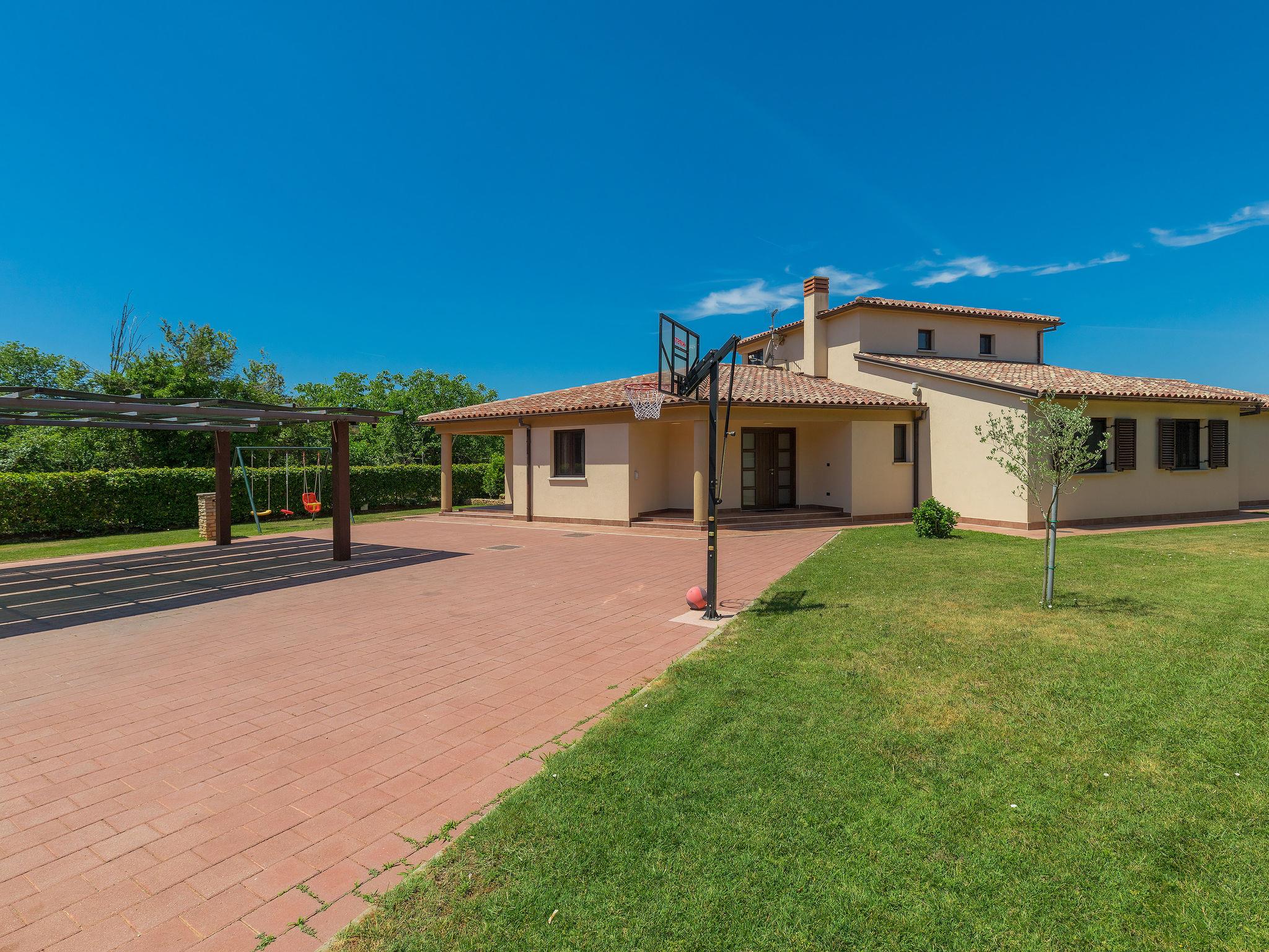 Single-family house "Andrea", 2 storeys. 300 m from the centre of Šišan, 4 km from the centre of Medulin, 7 km from the centre of Pula, 4 km from the sea, 4 km from the beach. Private: property 1'700 m2 with lawn and wildlife garden, swimming pool heated (59 m2, depth 125 cm, seasonal availability: 01.May. - 05.Nov.) with internal staircase. Unconventional pool shape. Outdoor shower, basketball, volleyball, badminton, terrace, garden furniture, barbecue (slide, swing). In the house: internet access, trampoline, burglar alarm system, washing machine. Parking (for 3 cars) on the premises. Shop, restaurant 300 m, bus stop 350 m, pebble beach 4 km, rocky beach 4 km. Please note: airfield 10 km from the property. Swimming pool heated (extra). Private: outdoor kitchen (4 gas rings).