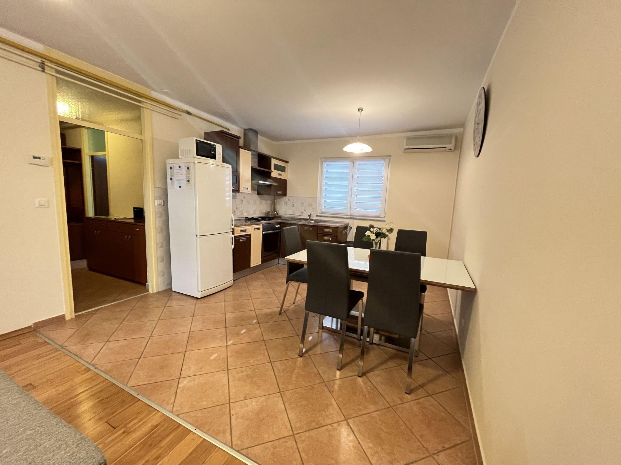 The spacious 60m² apartment is on the ground floor of a four-storey apartment building with a total of eight apartments and consists of a light living and dining room with an integrated, open kitchen, two bedrooms and a very modern bathroom. The air-conditioned (cool/warm) living room has a new couch with a bed for one person, a coffee table, satellite TV and a dining table with four chairs. Right next to it there is the built-in kitchen with a three-zone gas stove with an elegant extractor fan made of stainless steel, an electric oven, a fridge with a freezer compartment, a microwave, a kettle, a toaster and plenty of crockery and cutlery. The two bedrooms provide a double bed (180 x 200cm) and a single bed (80 x 200cm) respectively, with bedside tables and reading lamps, and big built-in cupboards with plenty of storage space for your clothing and luggage. One of the sofas in the living room can be converted into an additional double bed (140 x 180cm) for an adult or two children. The bathroom with a new tiles has a bath with a shower attachment, a washbasin with a cupboard underneath and a wall mirror, a toilet and a washing and drying machine. Plenty of towels and bed linen are provided and the reliable wireless Internet connection can be used free of charge.