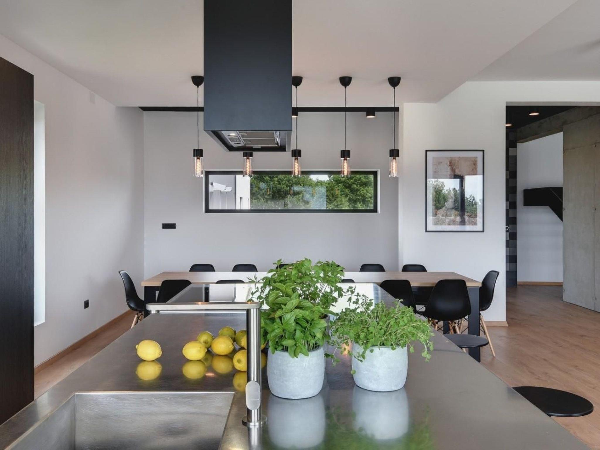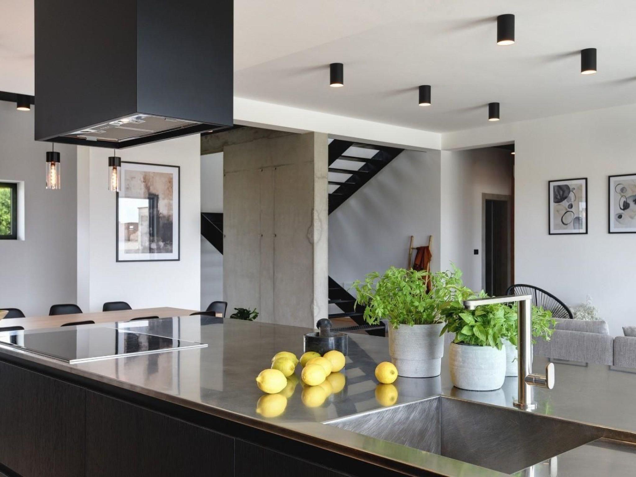 The exterior of the villa is dominated by a 52 m2 swimming pool. The yard is completely fenced, so you can carelessly go out and catch a tan on the loungers. For those who like to enjoy the food in the fresh air, there is an outdoor kitchen and outdoor dining area, as well as a barbecue. Furthermore, a carefully tended garden, orchard, outdoor shower, and table football await you.