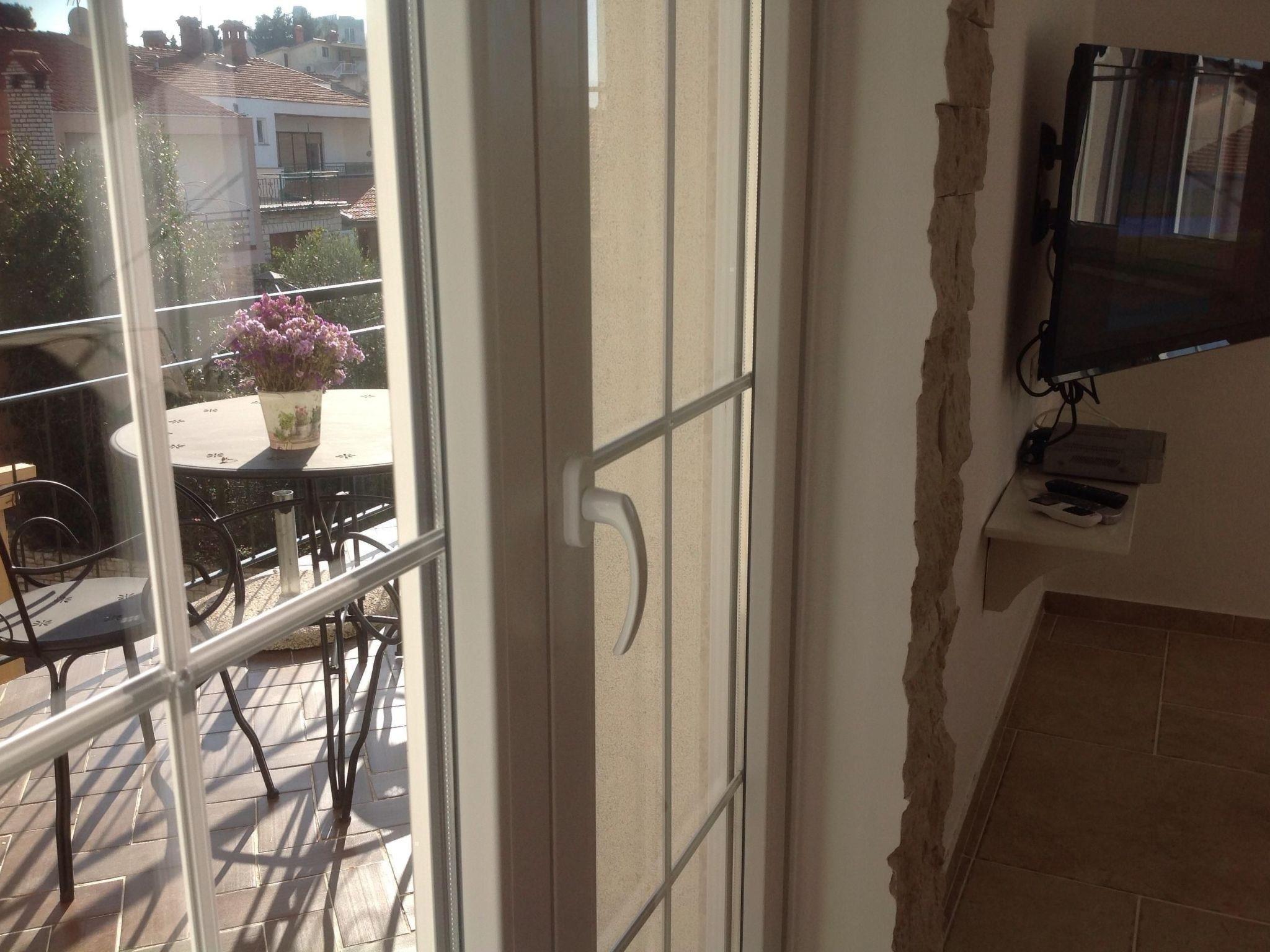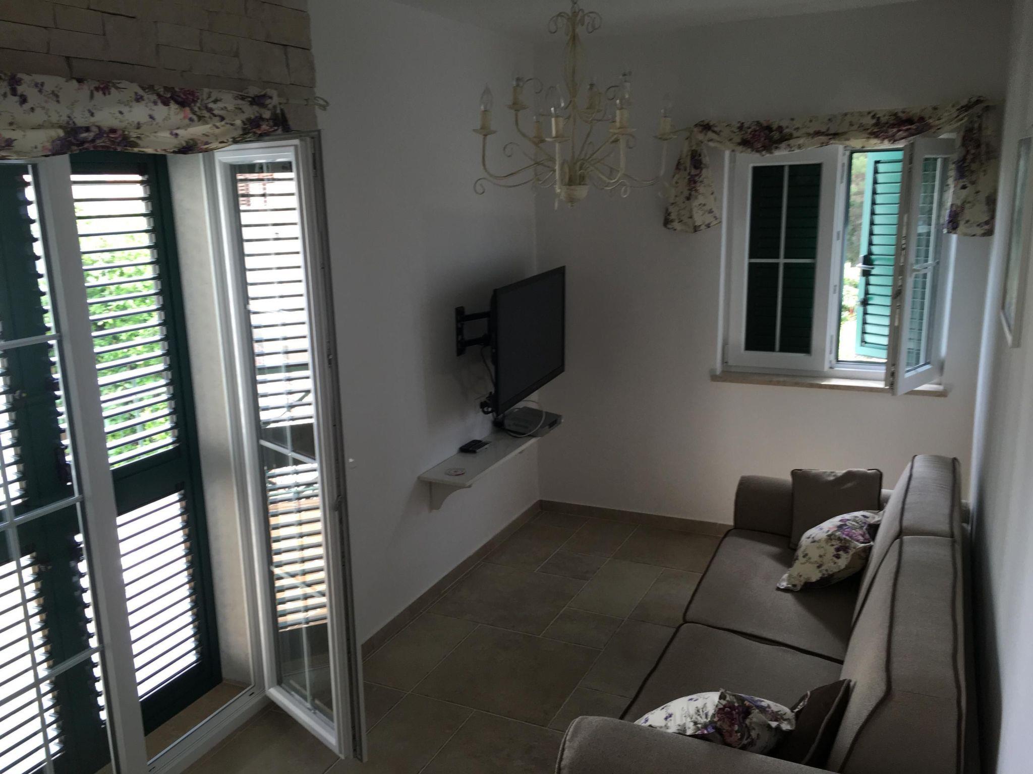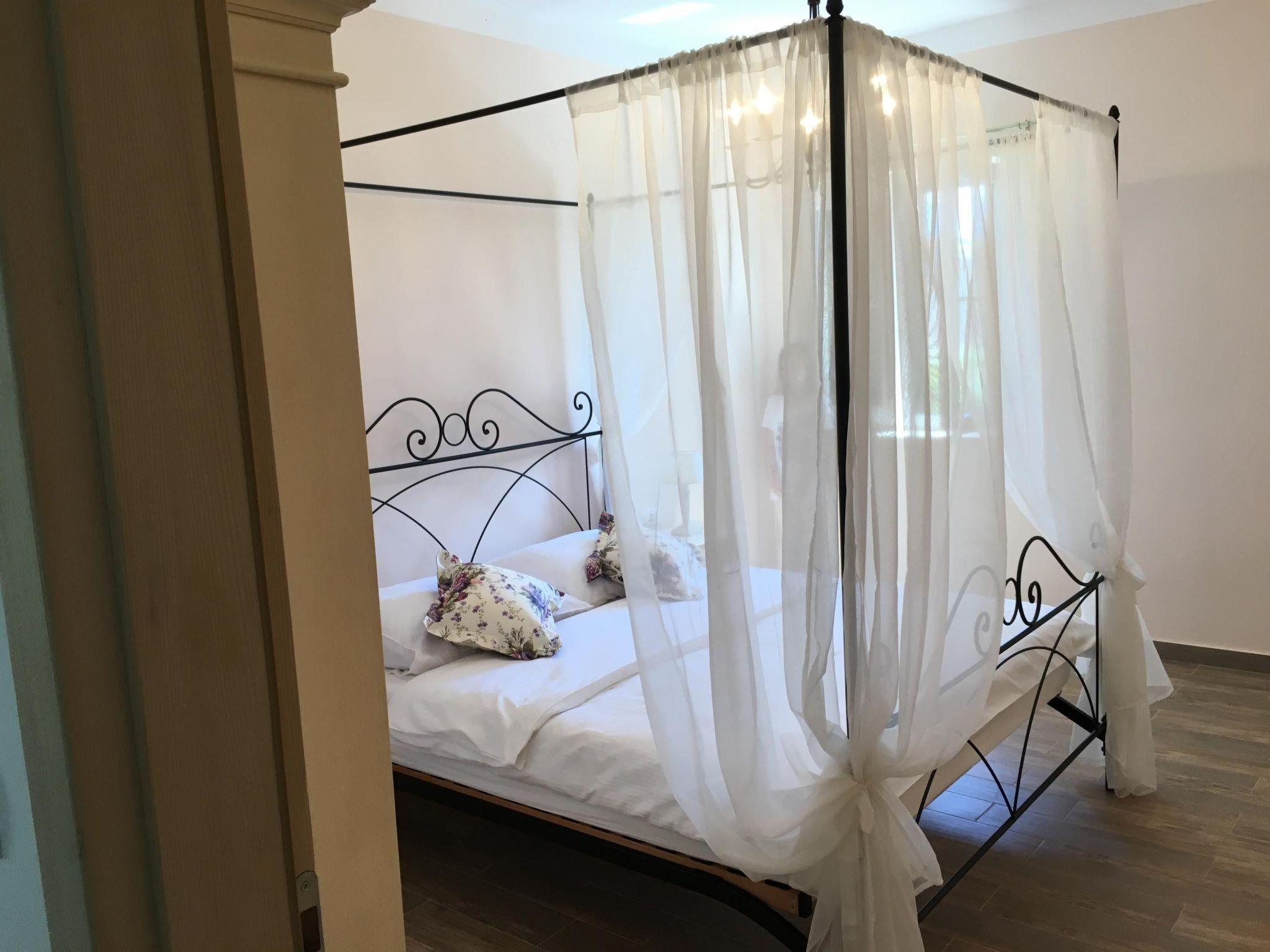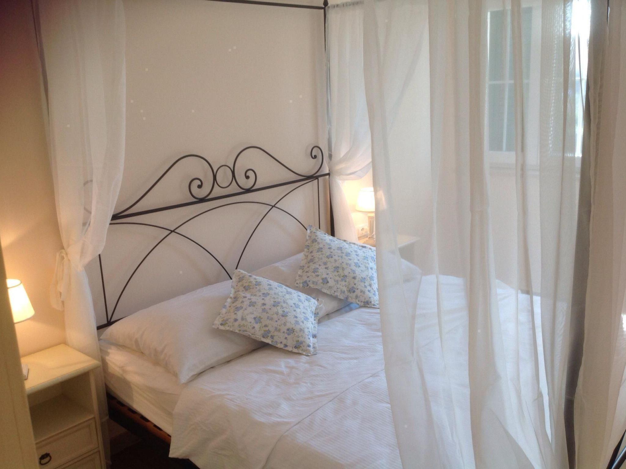 The 65m² apartment can accommodate six people. It has two comfortably furnished bedrooms each with a double bed (160 x 200cm), two bedside tables and a wardrobe. The living room also has a double sofa bed. The bathroom has a shower and WC. The kitchen comprises a dining space with a table and six chairs. The kitchen unit is equipped with a stove, oven, fridge, dishwasher and kettle. There is an air conditioning unit in the living room.