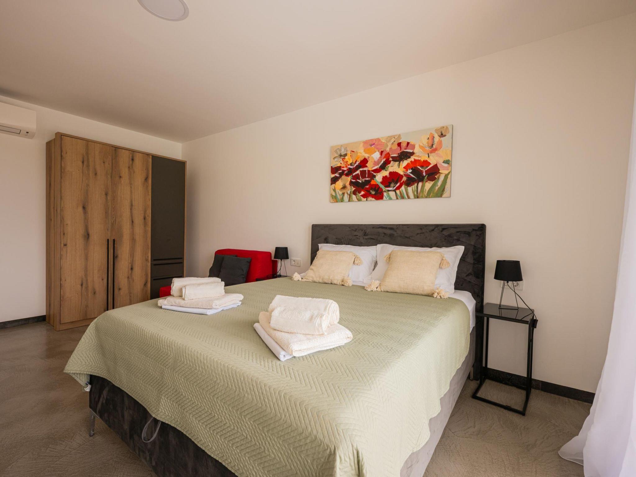 The second bedroom features a double bed (160x200 cm), a pull-out bed (90x190 cm), a TV, an air conditioner, and a wardrobe.