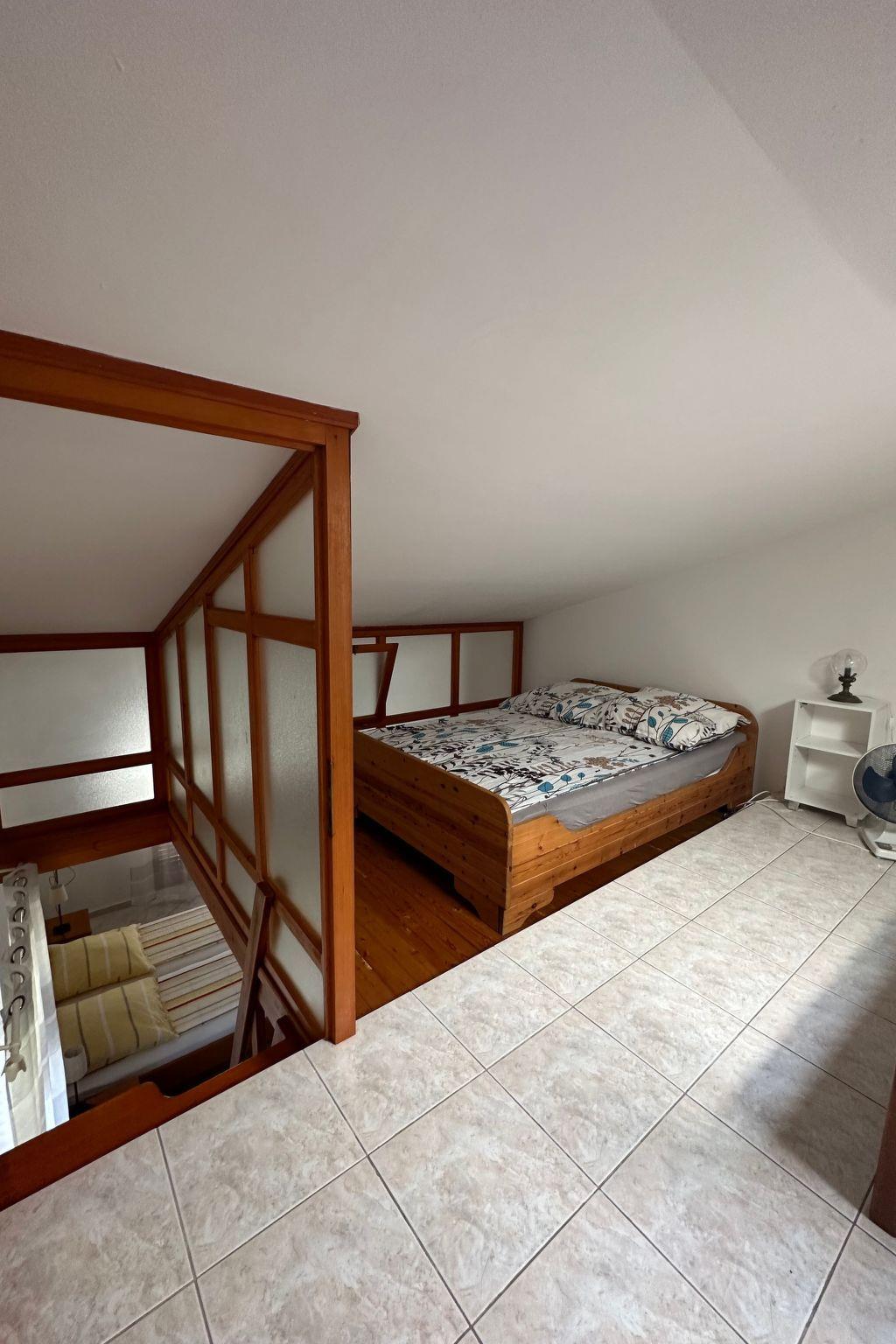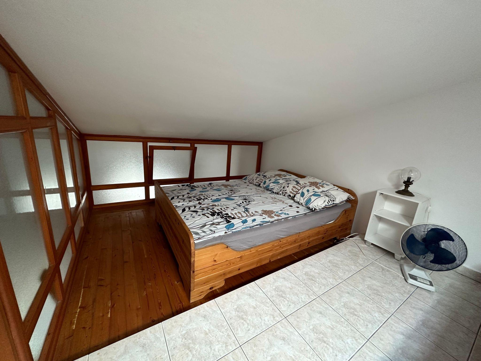 Owing to its open layout, the apartment appears very spacious and has a studio character. It totals around 58m², including the gallery, and provides a large sleeping area with a double bed and a three-quarter sofa for one person, and a generous cooking and dining area. A beautiful wooden staircase from the sleeping area leads up to the gallery, with two to three further beds. The bathroom has a bath. Apart from the gallery, the whole apartment features light and appealing floor tiles.