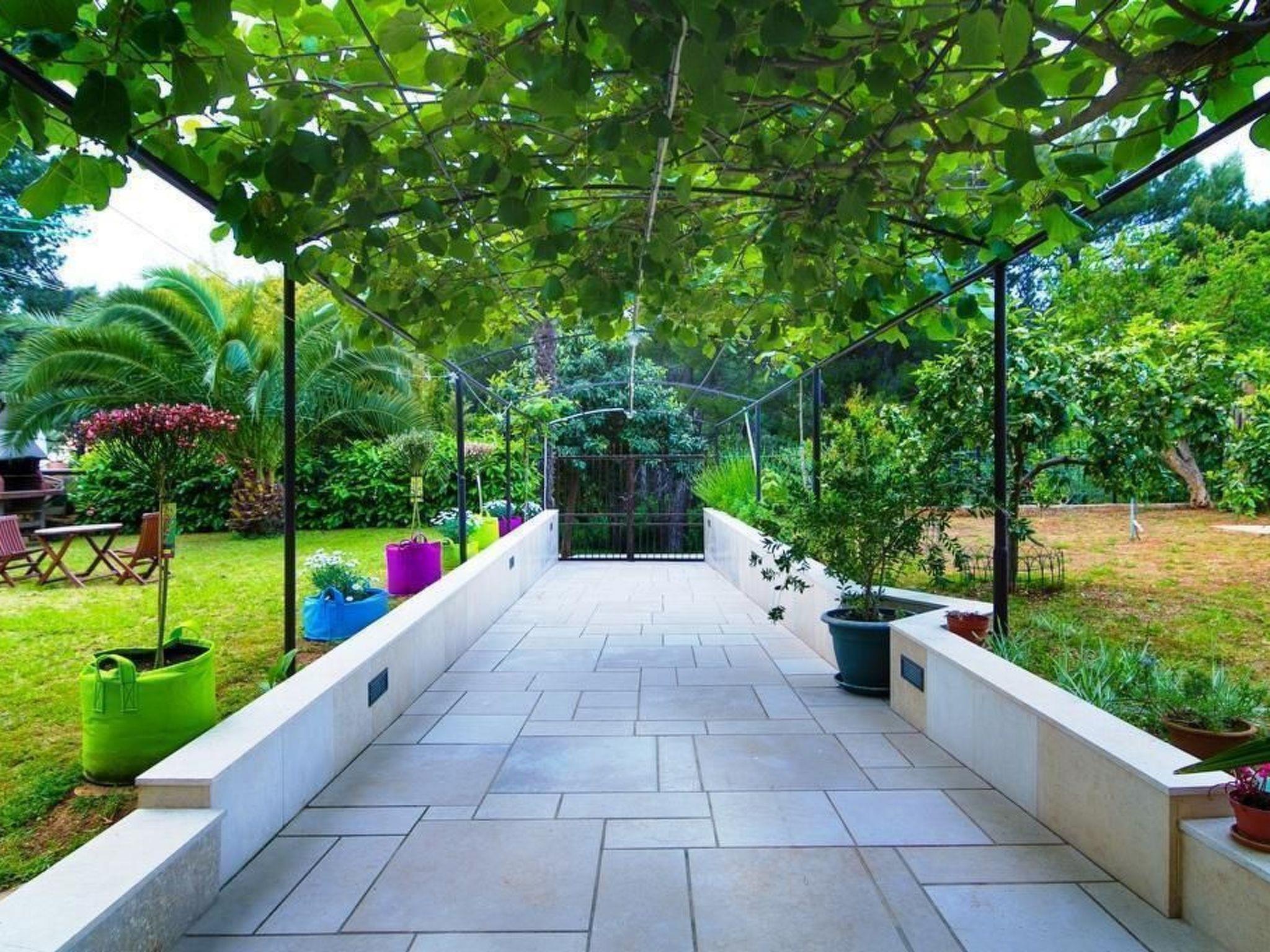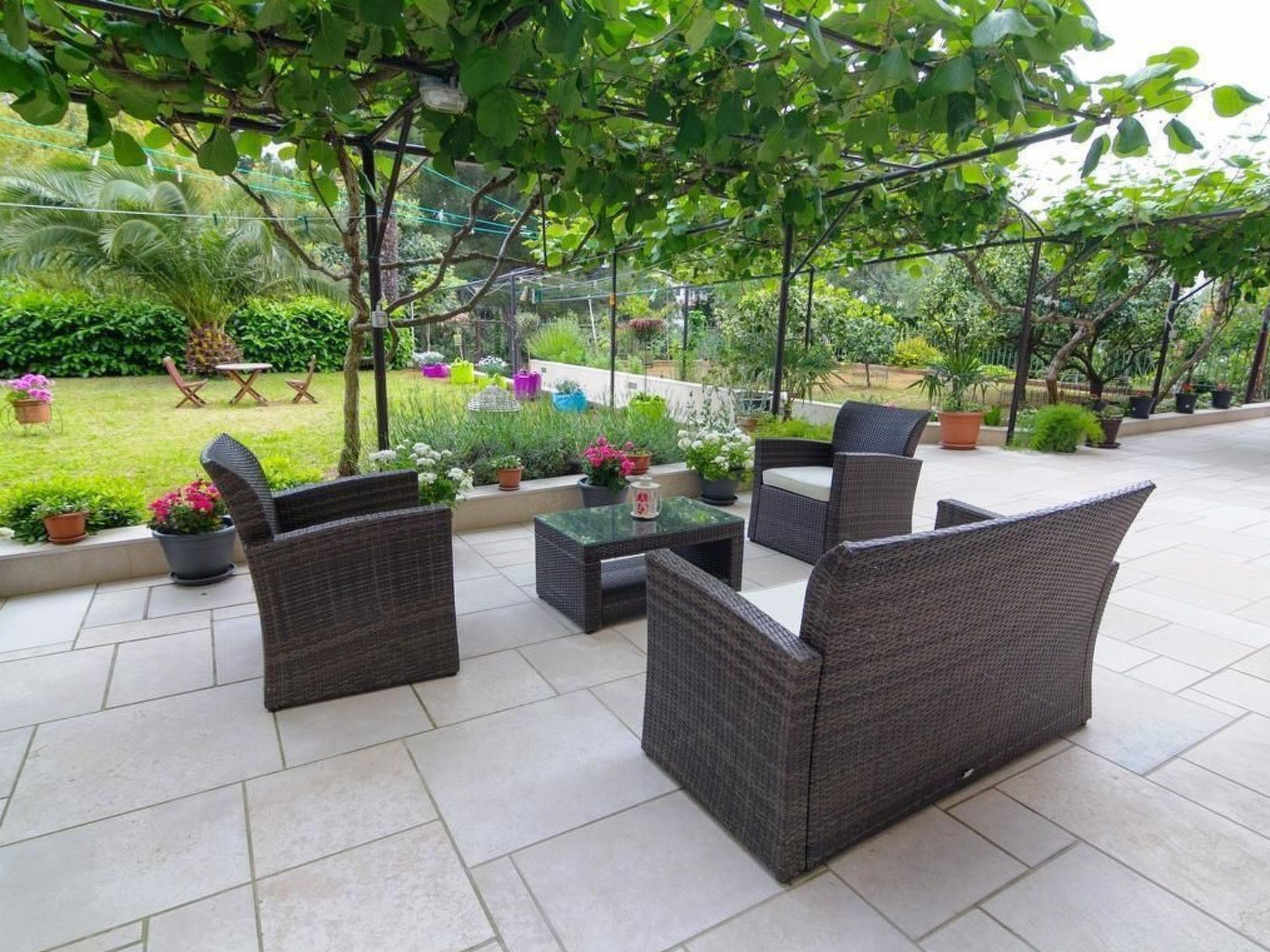 Step outside to the cozy terrace and find yourself surrounded by a serene garden landscape. The terrace, furnished with garden furniture, offers an idyllic spot to relax and soak in the beautiful views. The courtyard exudes warmth and charm with its rattan table and chairs set under the shade of kiwi pergolas. This special touch adds a unique flavor to your outdoor relaxation, inviting you to enjoy leisurely moments amidst the greenery, with views stretching towards the palm trees, pine forest, and beach.