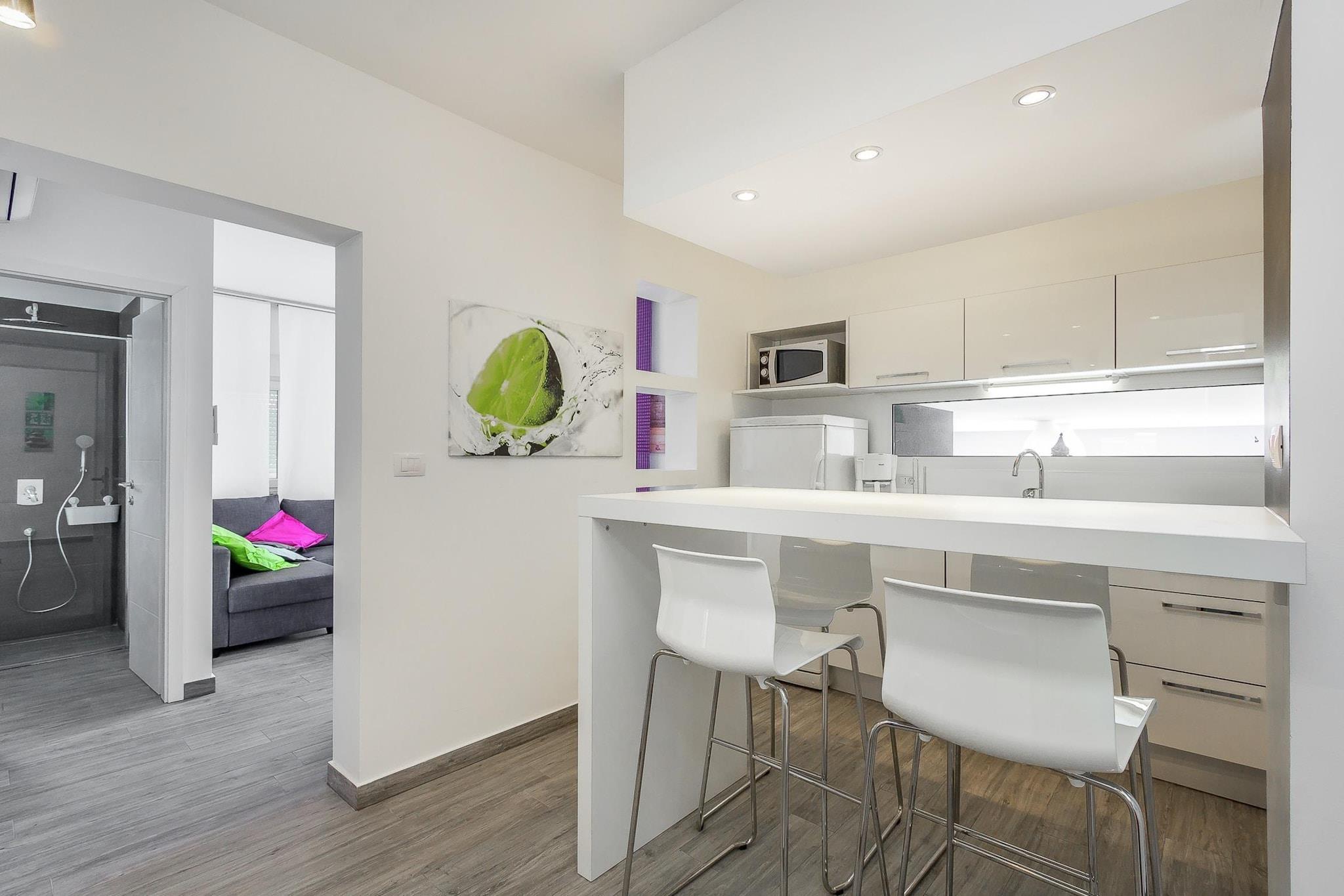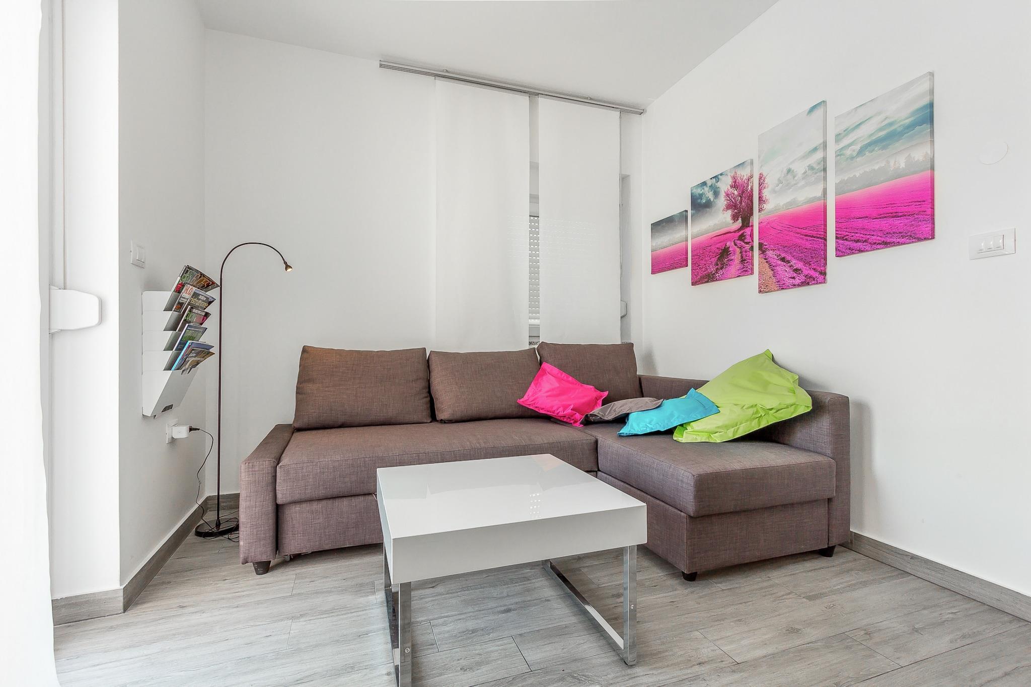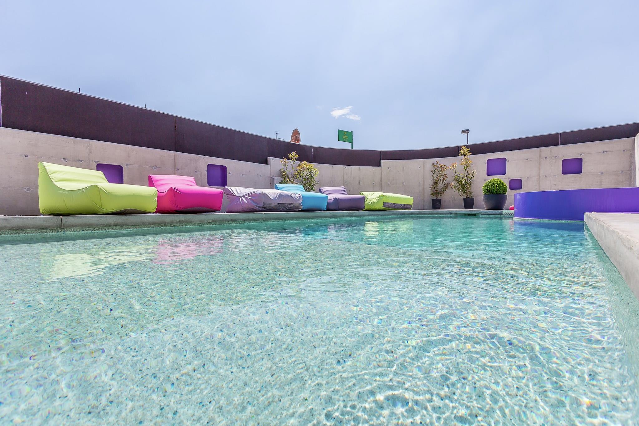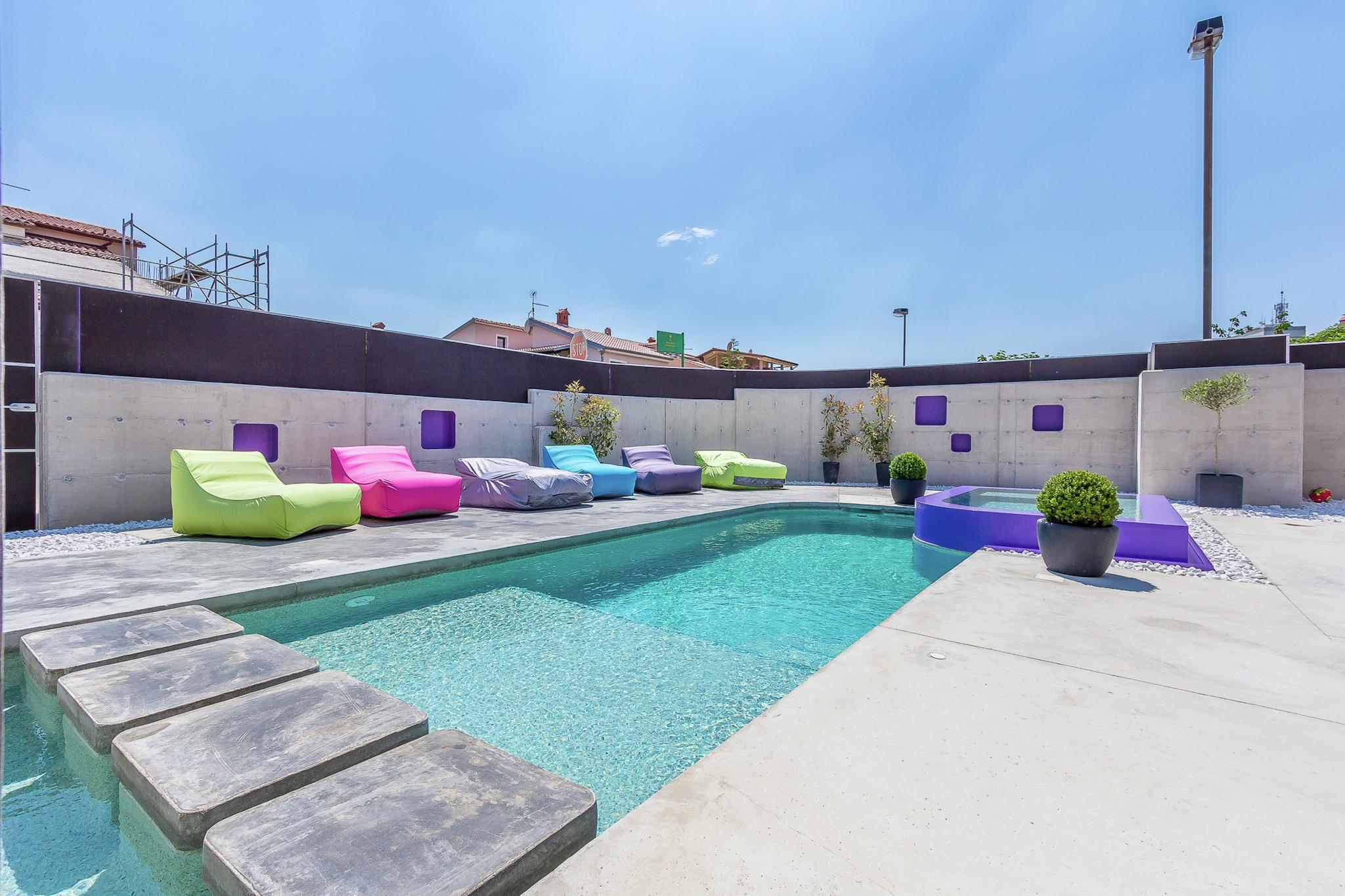 Casa Moderna i Pula ligger kun tre kilometer fra byens centrum. Dette moderne hus med swimmingpool tilbyder indkvartering til op til fire personer. Med en specielt formet swimmingpool, som er helt omgivet af en mur for at sikre en ubekymret ferie uden nysgerrige øjne, har gæsterne også adgang til et separat værelse med træningsudstyr og et legerum til børn. Huset er indrettet i stueetagen, og alle værelser er flisebelagt. Dette moderne hus i Pula skiller sig ud, takket være det dristige design med lige linjer og slående farverige detaljer, såsom de attraktive, bløde liggestole ved poolen.