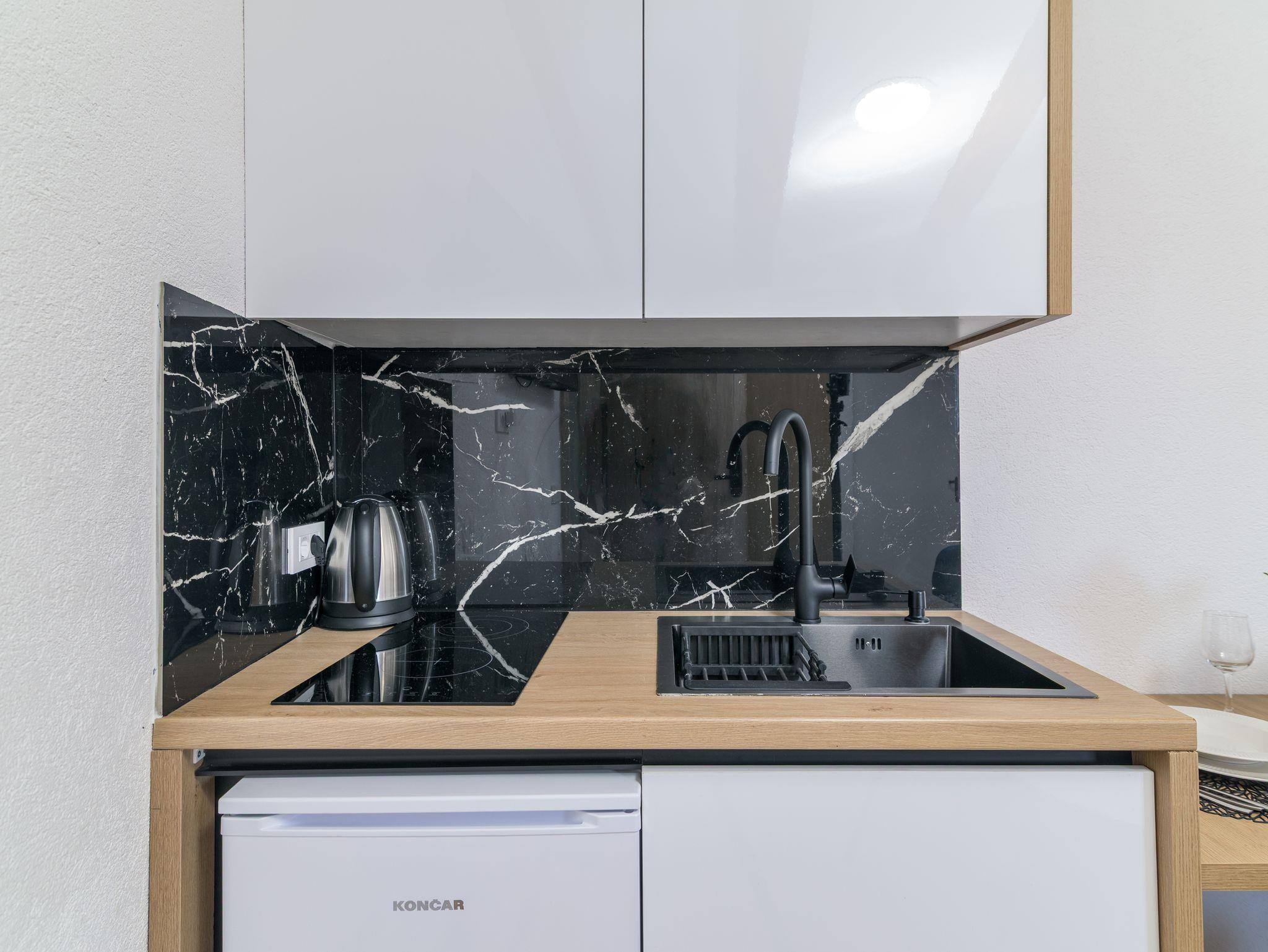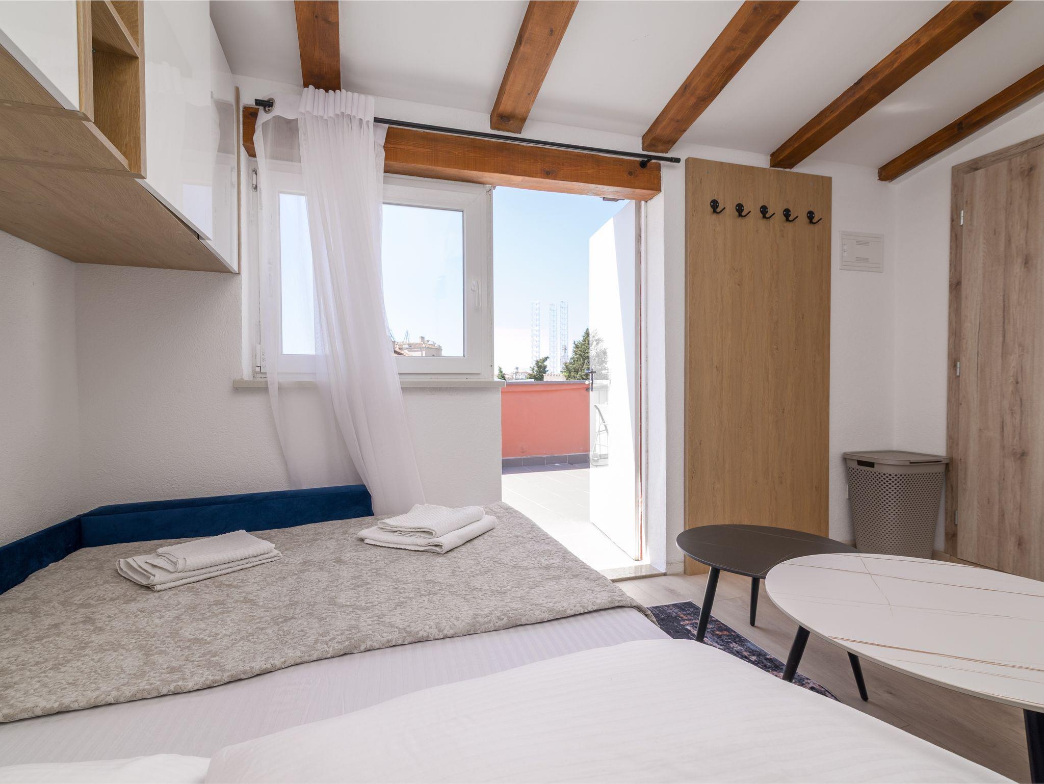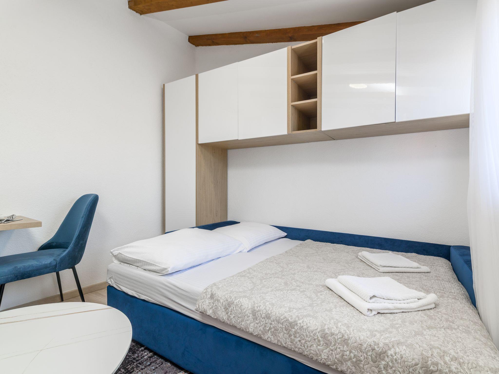 Studio bietet Platz für 2 Gäste. Die Betten sind in Schlafzimmern, die es 1 gibt, innerhalb einer Gesamtfläche von 20m2, angeordnet. Die Gäste haben eine eigene Terrasse zur Verfügung, auf der sie in warmen Sommernächten genießen können. Das Studio-Apartment bietet Meerblick. Räume der gebuchten Unterkunftseinheit werden nicht in eine Ganze verbunden. IM PREIS INBEGRIFFEN: Kurtaxe, Endreinigung, Klimatisierung, Internet, Föhn. VERBINDLICHE ZUSÄTZLICHE KOSTEN: Aufzahlung für Kurzaufenthalte (prozentualer Zuschlag pro Nächtigungsanzahl: 30% - 1, 20% - 2, 10% - 3). Die Verfügbarkeit zusätzlicher Dienstleistungen in Ihrem reservierten Termin und die Preise derselben (falls nicht aufgeführt) müssen im Voraus überprüft werden. Zusätzliche Dienstleistungen die in der Zahlungsaufforderung nicht aufgeführt sind werden direkt beim Vermieter bezahlt, angenommen der Gast nutzt auch diese.