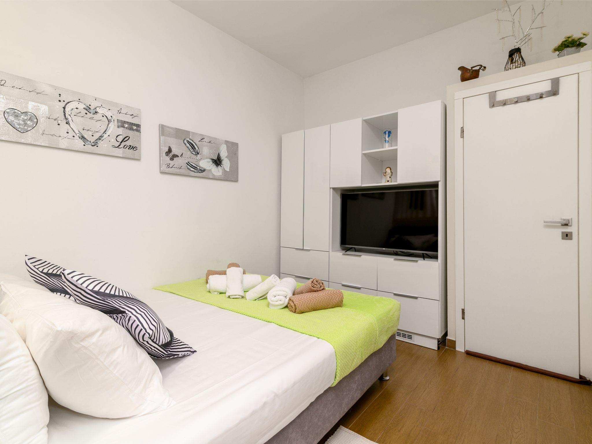 Studio bietet Platz für 2 Gäste. Die Betten sind in Schlafzimmern, die es 1 gibt, innerhalb einer Gesamtfläche von 19m2, angeordnet. Die Gäste haben eine eigene Terrasse zur Verfügung, auf der sie in warmen Sommernächten genießen können. Es ist erlaubt, Speisen auf dem Gemeinschafts-Grill vorzubereiten. Während ihres Aufenthalts können Gäste das gemeinsam zur Nutzung stehende Schwimmbad benutzen. Durch die Terrasse der gebuchten Unterkunftseinheit gehen auch andere Gäste oder Vermieter. IM PREIS INBEGRIFFEN: Kurtaxe, Endreinigung, Klimatisierung, Pool, Parkplatz, Internet, Bügeleisen, Föhn. VERBINDLICHE ZUSÄTZLICHE KOSTEN: Aufzahlung für Kurzaufenthalte (prozentualer Zuschlag pro Nächtigungsanzahl: 30% - 1, 20% - 2, 10% - 3). Die Verfügbarkeit zusätzlicher Dienstleistungen in Ihrem reservierten Termin und die Preise derselben (falls nicht aufgeführt) müssen im Voraus überprüft werden. Zusätzliche Dienstleistungen die in der Zahlungsaufforderung nicht aufgeführt sind werden direkt beim Vermieter bezahlt, angenommen der Gast nutzt auch diese.