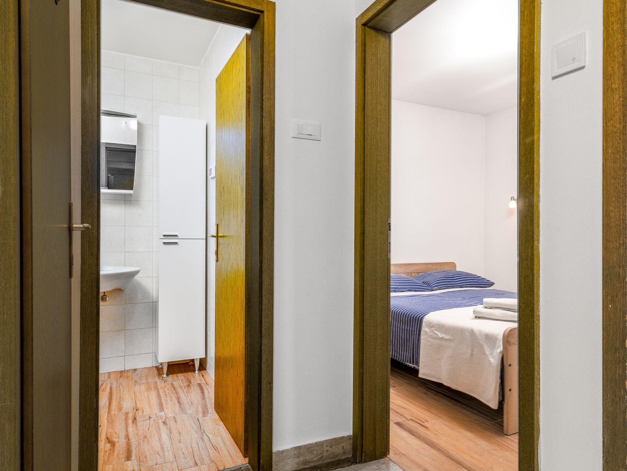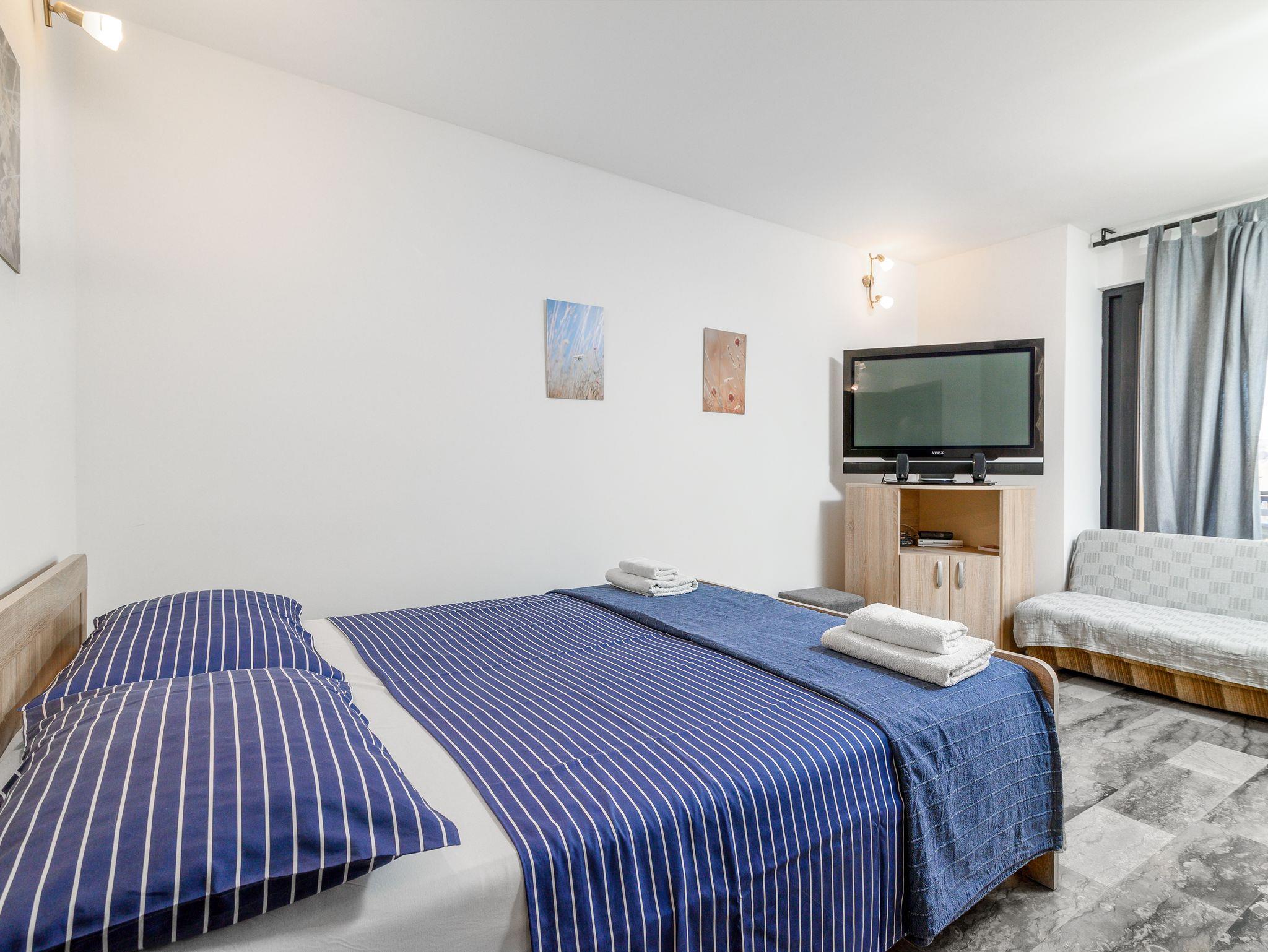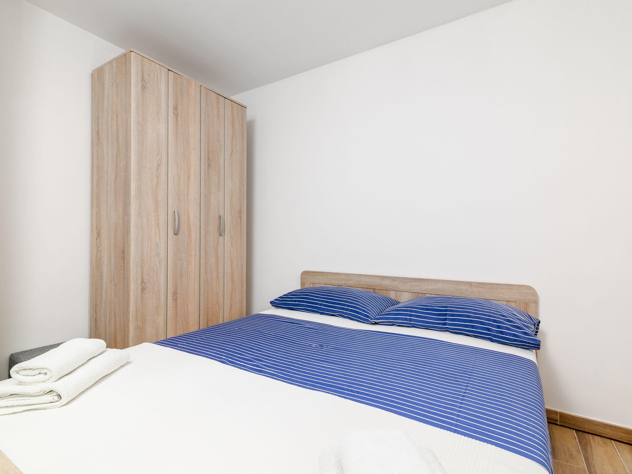 Ferienwohnung bietet Platz für 5 Gäste. Die Betten sind in Schlafzimmern, die es 2 gibt, und in Wohnzimmer, innerhalb einer Gesamtfläche von 47m2, angeordnet. Die Gäste haben eine eigene Terrasse zur Verfügung, auf der sie in warmen Sommernächten genießen können. Es ist erlaubt, Speisen auf dem Gemeinschafts-Grill vorzubereiten. In der Unterkunftseinheit besteht die Möglichkeit des Mitbringens von Haustieren gegen Aufpreis. IM PREIS INBEGRIFFEN: Kurtaxe, Endreinigung, Klimatisierung, Parkplatz, Internet, Föhn. VERBINDLICHE ZUSÄTZLICHE KOSTEN: Aufzahlung für Kurzaufenthalte (prozentualer Zuschlag pro Nächtigungsanzahl: 30% - 1, 20% - 2, 10% - 3). UNVERBINDLICHE ZUSÄTZLICHE KOSTEN: Haustiere (5,00 € pro Nacht). Die Verfügbarkeit zusätzlicher Dienstleistungen in Ihrem reservierten Termin und die Preise derselben (falls nicht aufgeführt) müssen im Voraus überprüft werden. Zusätzliche Dienstleistungen die in der Zahlungsaufforderung nicht aufgeführt sind werden direkt beim Vermieter bezahlt, angenommen der Gast nutzt auch diese.