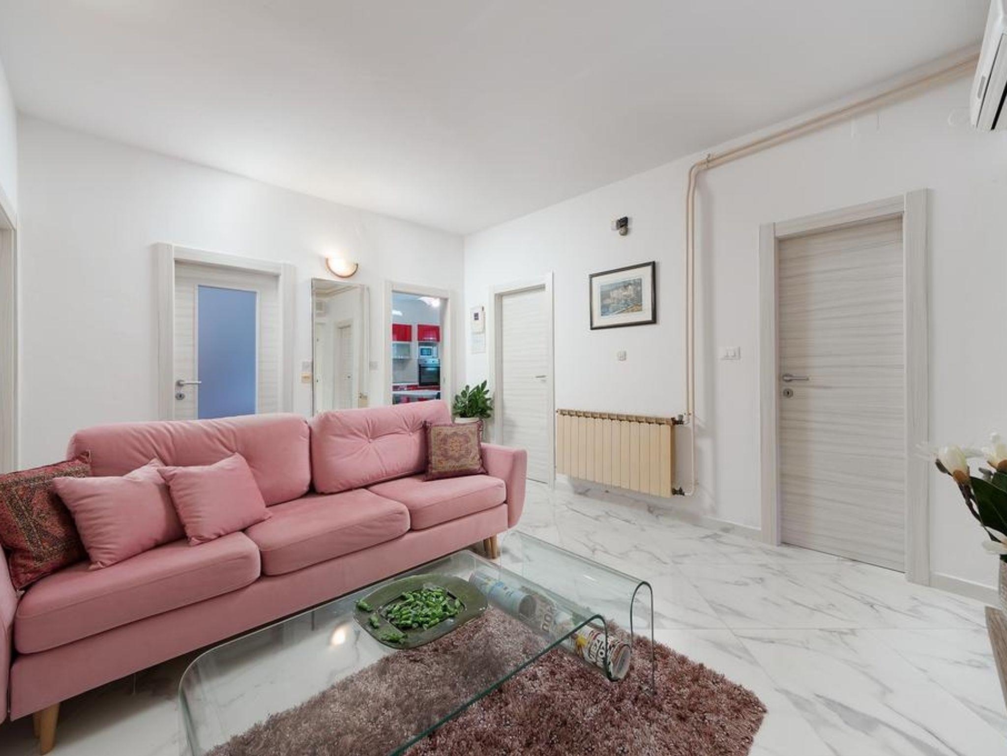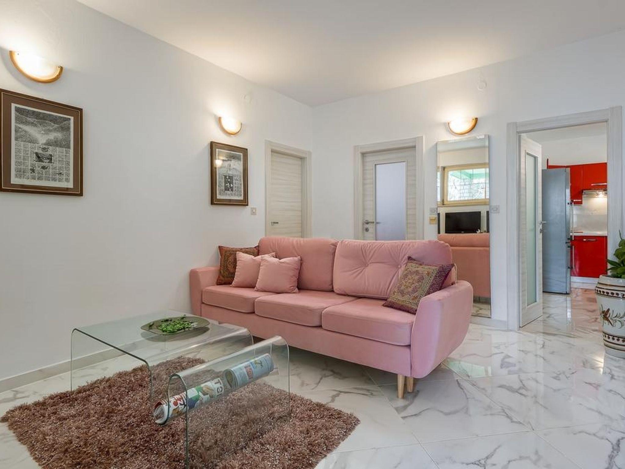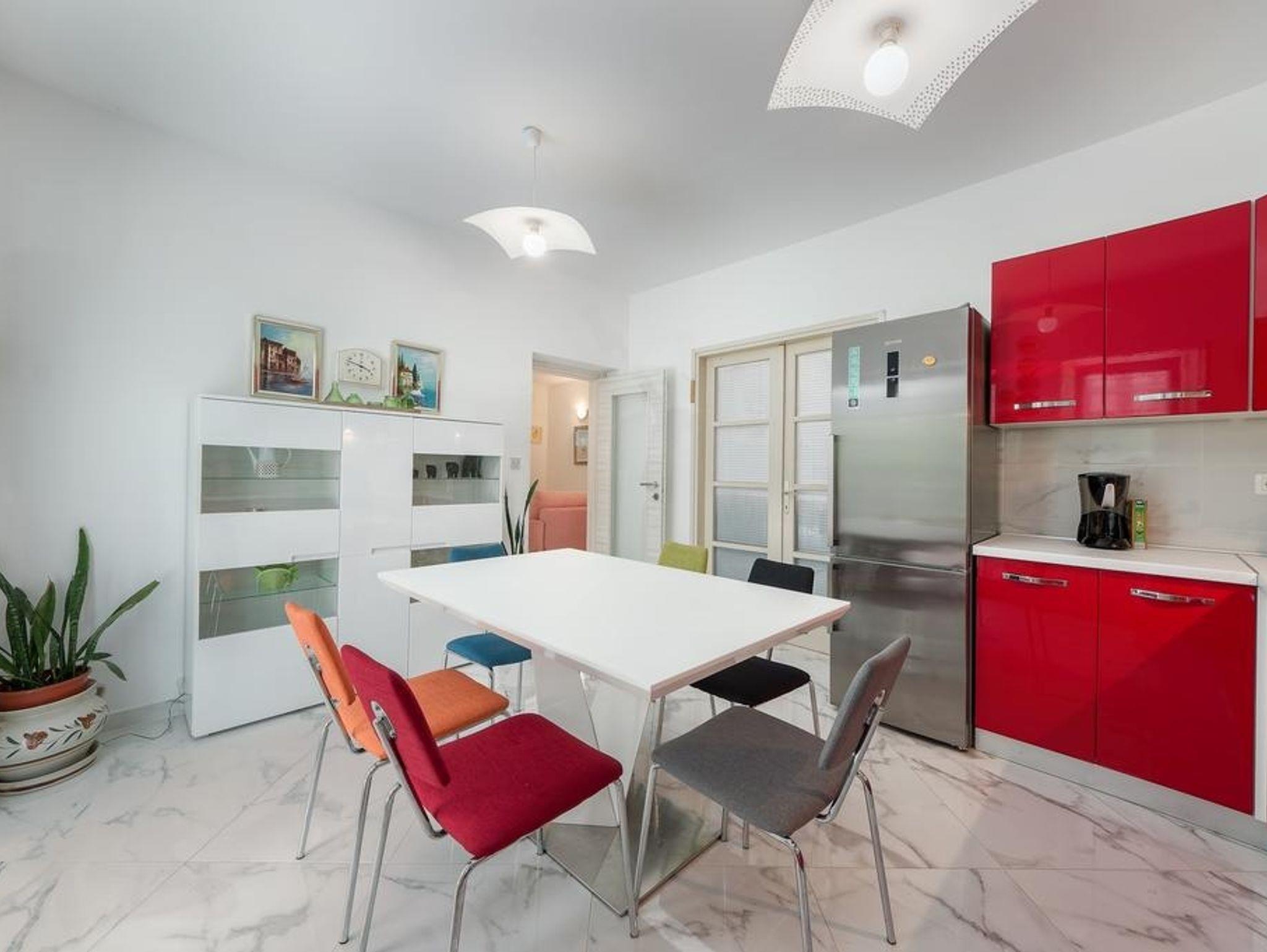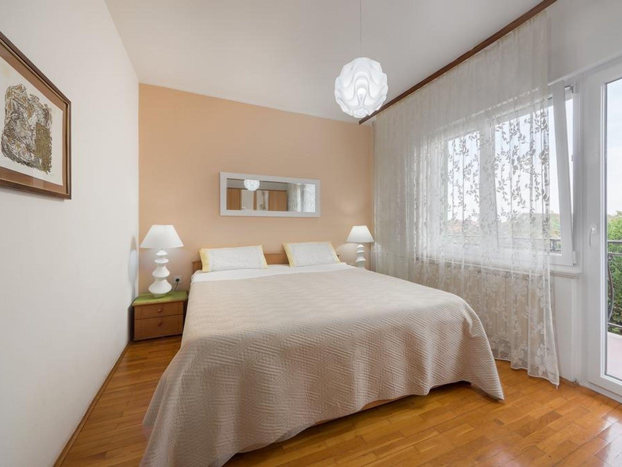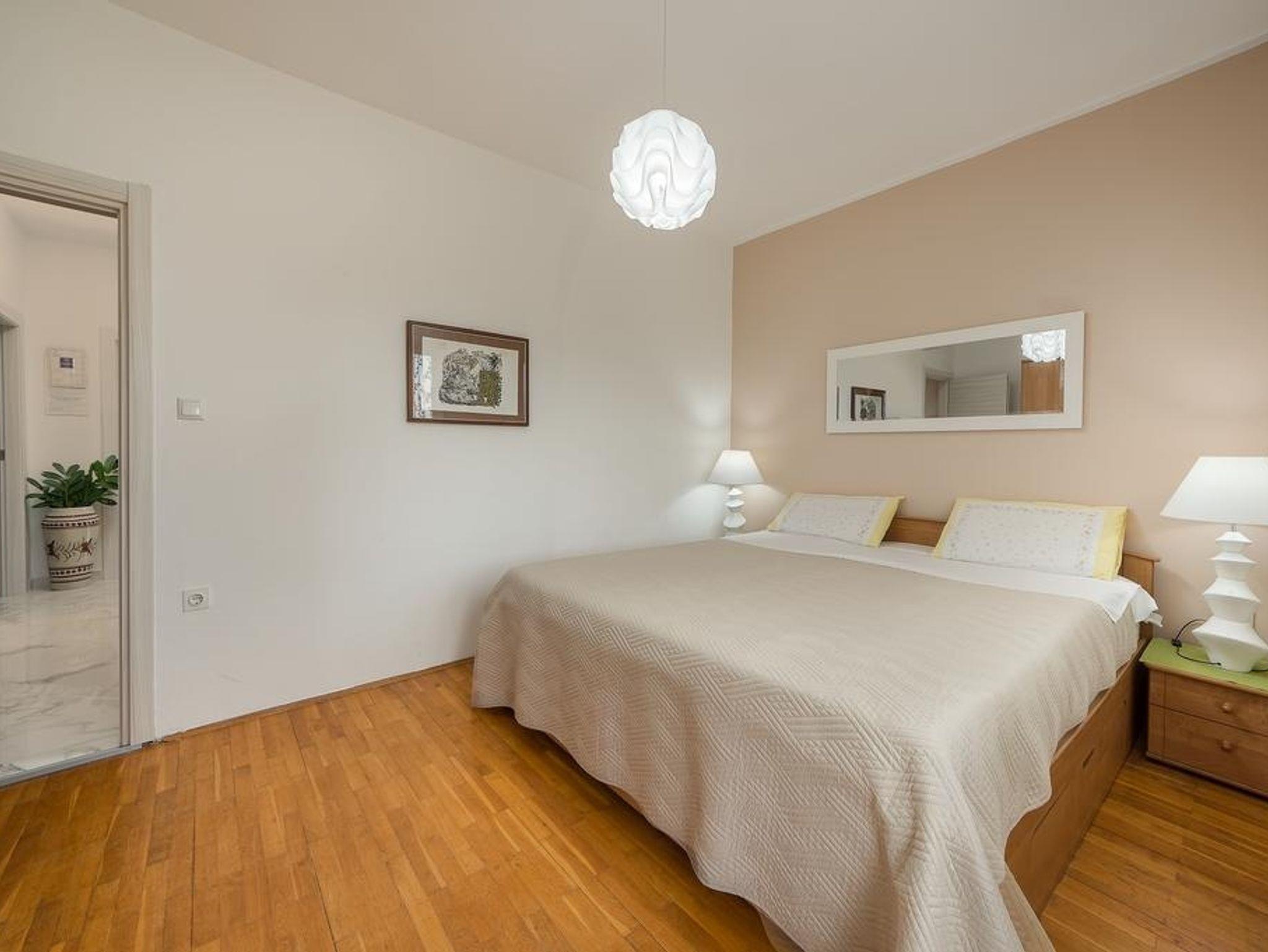 Ferienwohnung bietet Platz für 5 Gäste. Die Betten sind in Schlafzimmern, die es 2 gibt, und in Wohnzimmer, innerhalb einer Gesamtfläche von 75m2, angeordnet. Die Gäste haben eine eigene Terrasse zur Verfügung, auf der sie in warmen Sommernächten genießen können. Für vollen Genuss und Entspannung gibt es einen privaten Grill für Gäste dieser Unterkunft. In der Unterkunftseinheit besteht die Möglichkeit des Mitbringens von Haustieren gegen Aufpreis. IM PREIS INBEGRIFFEN: Kurtaxe, Endreinigung, Klimatisierung, Parkplatz, Internet, Bügeleisen, Bügelbrett, Föhn. VERBINDLICHE ZUSÄTZLICHE KOSTEN: Aufzahlung für Kurzaufenthalte (prozentualer Zuschlag pro Nächtigungsanzahl: 30% - 1, 20% - 2, 10% - 3). UNVERBINDLICHE ZUSÄTZLICHE KOSTEN: Bootsanlegeplatz (7,00 € pro Nacht), Haustiere (5,00 € pro Nacht). Die Verfügbarkeit zusätzlicher Dienstleistungen in Ihrem reservierten Termin und die Preise derselben (falls nicht aufgeführt) müssen im Voraus überprüft werden. Zusätzliche Dienstleistungen die in der Zahlungsaufforderung nicht aufgeführt sind werden direkt beim Vermieter bezahlt, angenommen der Gast nutzt auch diese. Ermäßigung auf den Grundpreis: Gratistag 14=13 (bei einem Aufenthalt von 14 Tagen oder mehr erhalten Sie einen Gratistag für den Aufenthalt bis 31.12.26).