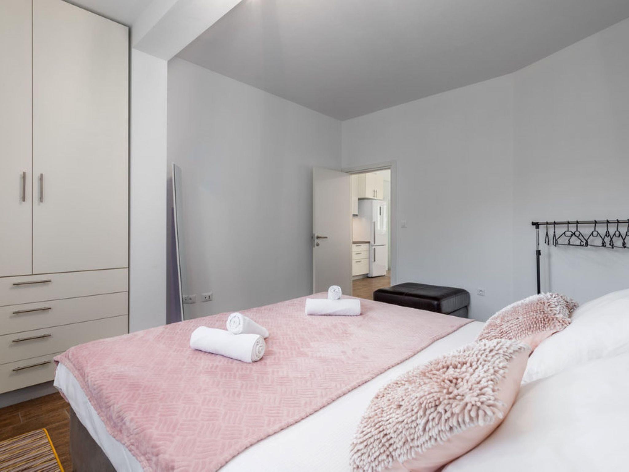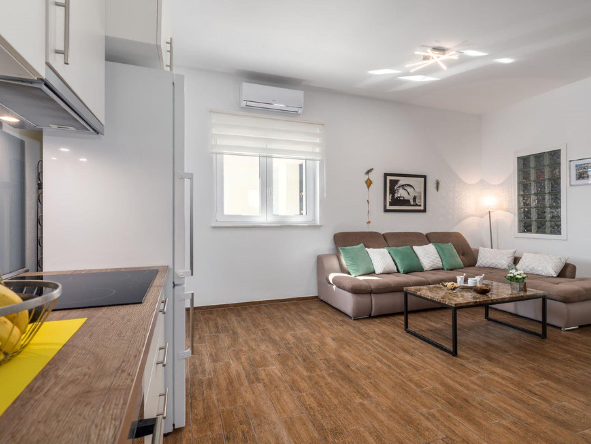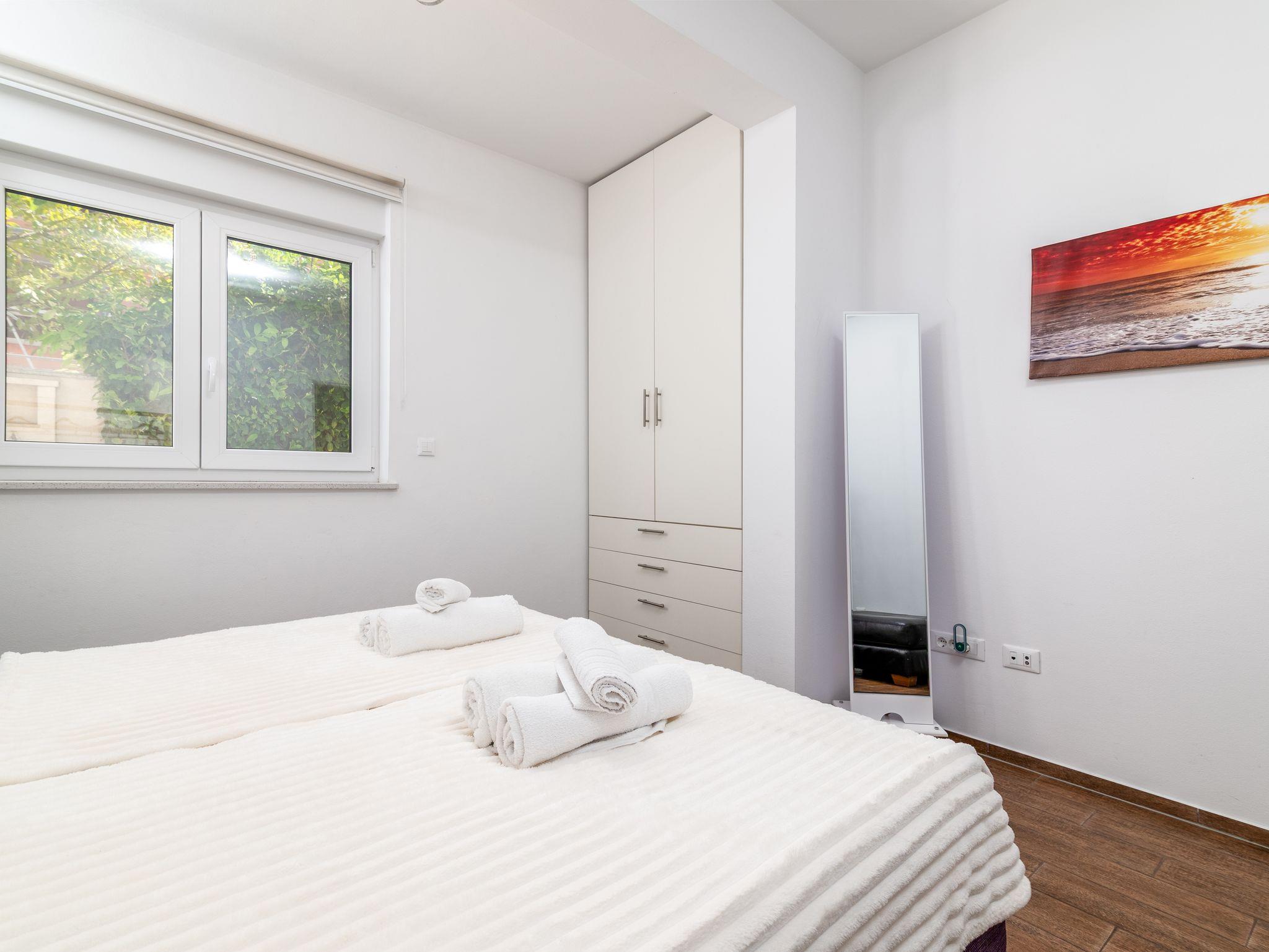 Ferienwohnung bietet Platz für 4 Gäste. Die Betten sind in Schlafzimmern, die es 2 gibt, innerhalb einer Gesamtfläche von 59m2, angeordnet. Die Gäste haben eine eigene Terrasse zur Verfügung, auf der sie in warmen Sommernächten genießen können. Es ist erlaubt, Speisen auf dem Gemeinschafts-Grill vorzubereiten. Während ihres Aufenthalts können Gäste das gemeinsam zur Nutzung stehende Schwimmbad benutzen. Durch die Terrasse der gebuchten Unterkunftseinheit gehen auch andere Gäste oder Vermieter. IM PREIS INBEGRIFFEN: Kurtaxe, Endreinigung, Klimatisierung, Pool, Parkplatz, Internet, Bügeleisen, Föhn. VERBINDLICHE ZUSÄTZLICHE KOSTEN: Aufzahlung für Kurzaufenthalte (prozentualer Zuschlag pro Nächtigungsanzahl: 30% - 1, 20% - 2, 10% - 3). Die Verfügbarkeit zusätzlicher Dienstleistungen in Ihrem reservierten Termin und die Preise derselben (falls nicht aufgeführt) müssen im Voraus überprüft werden. Zusätzliche Dienstleistungen die in der Zahlungsaufforderung nicht aufgeführt sind werden direkt beim Vermieter bezahlt, angenommen der Gast nutzt auch diese.