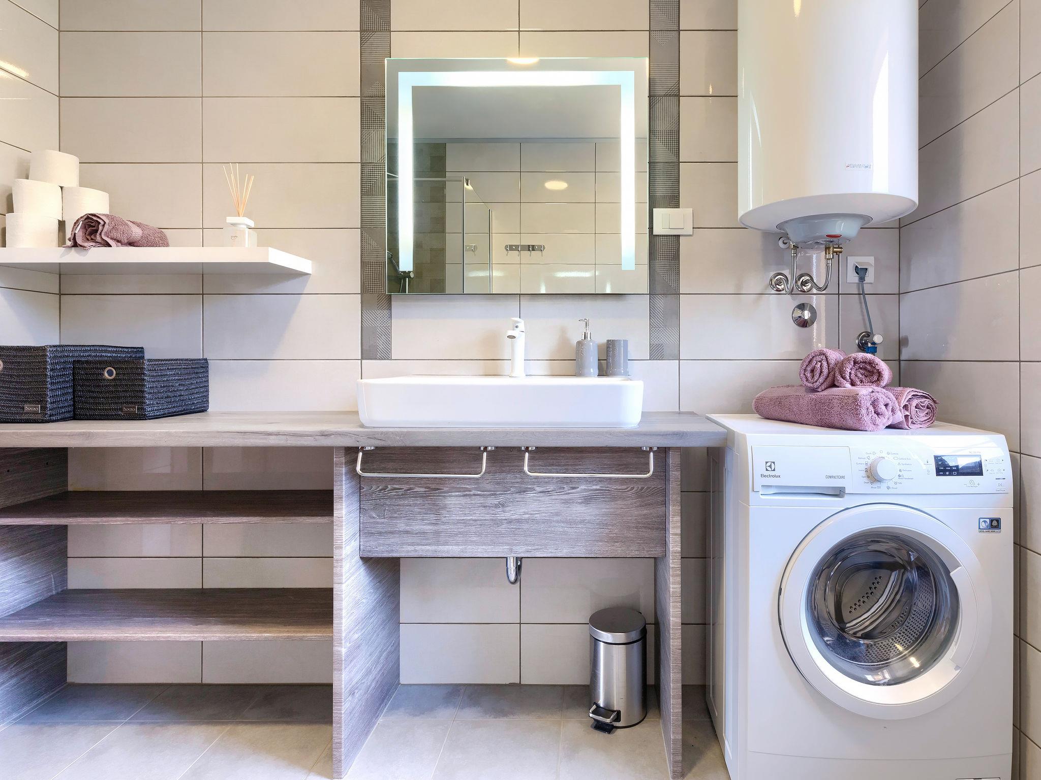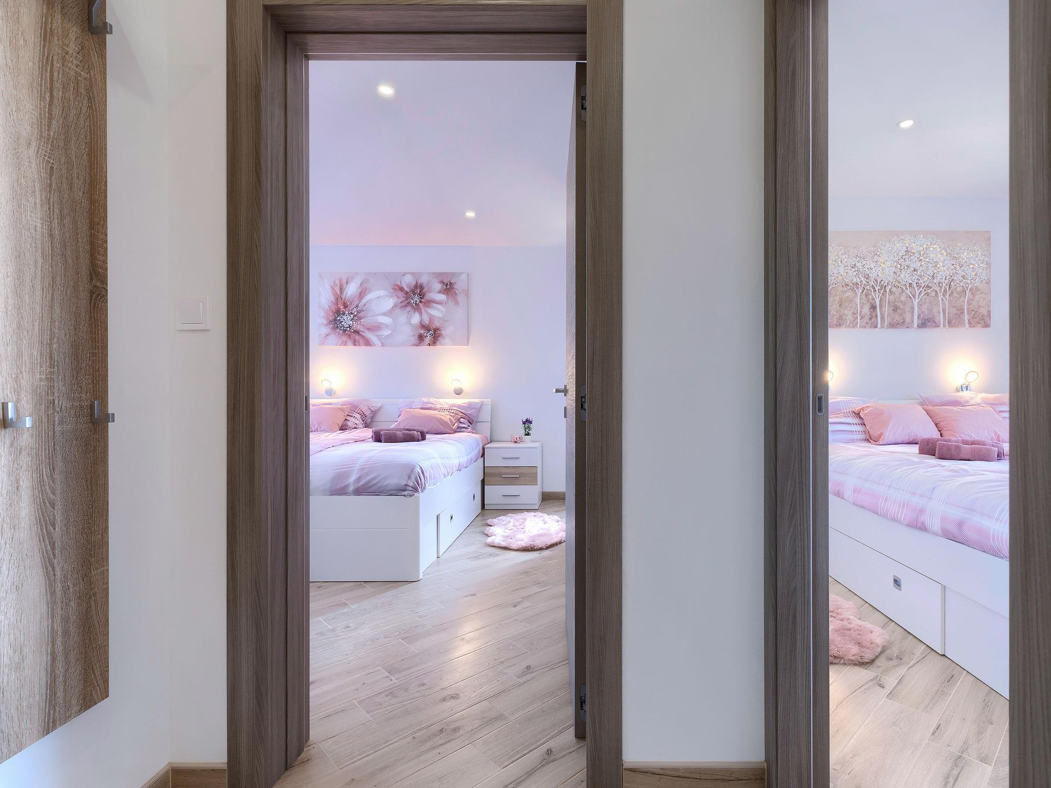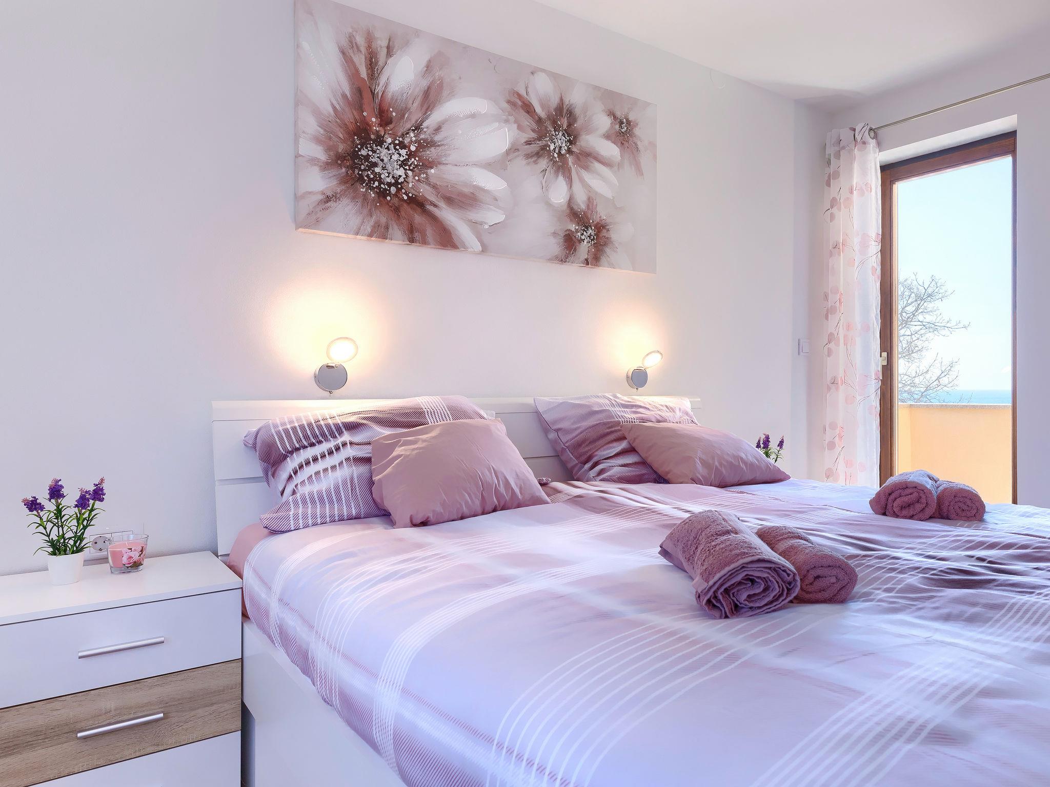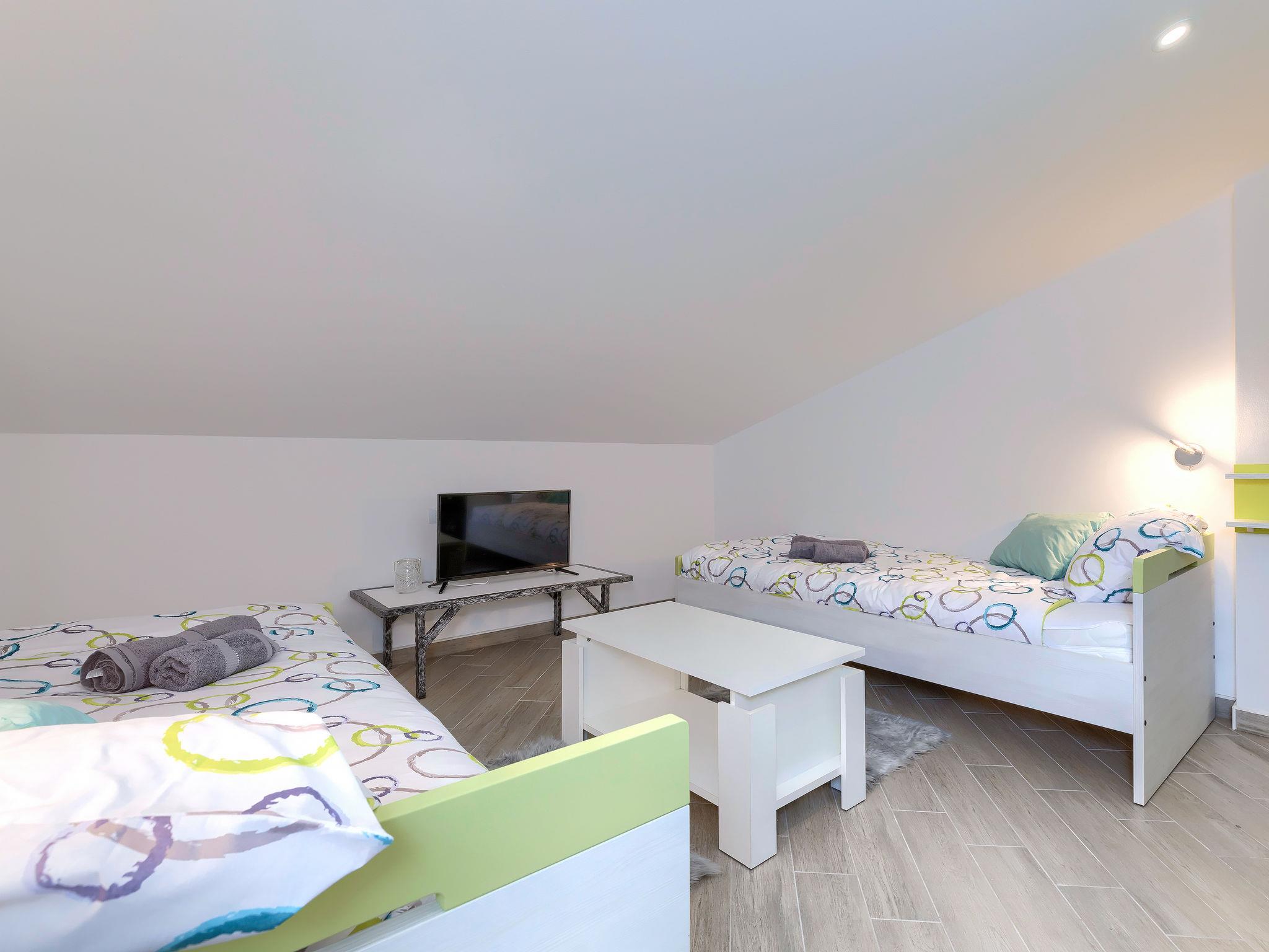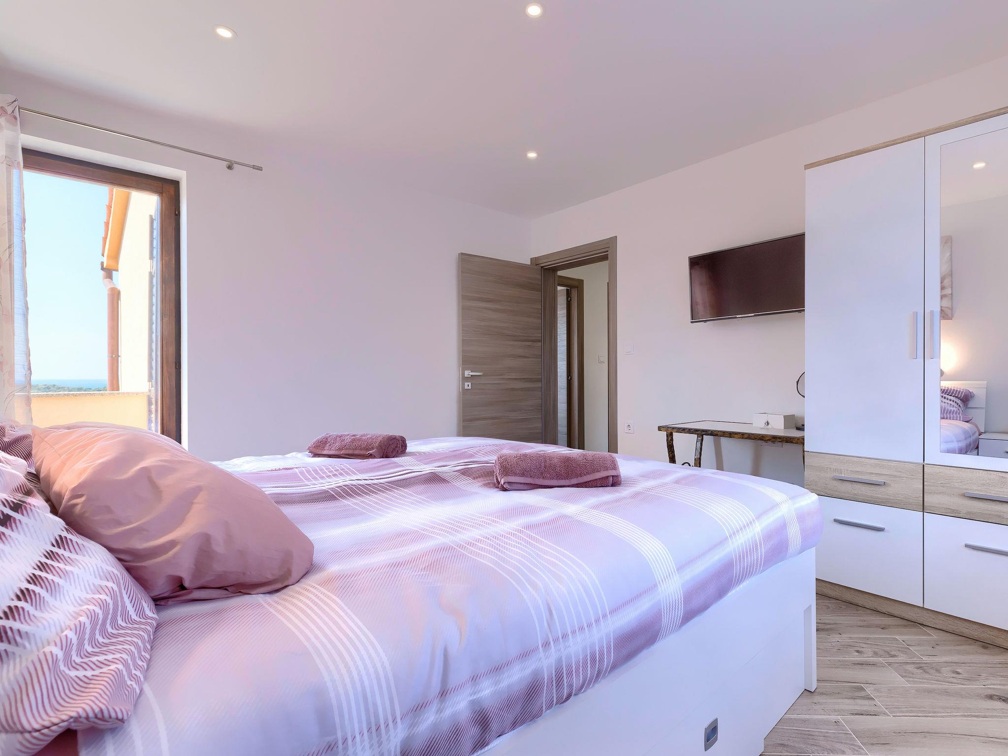 4-room penthouse 90 m2 on 3rd floor. Beautiful and cosy furnishings: living/dining room with satellite TV. Exit to the terrace. Entrance hall with air conditioning. 1 room with 1 double bed (2 x 90 cm, length 200 cm), satellite TV. Exit to the terrace. 1 room with 1 double bed (2 x 90 cm, length 200 cm), satellite TV. 1 room with sloping ceilings with 2 beds (90 cm, length 200 cm), shower/WC and satellite TV. Open kitchen (dishwasher, 4 ceramic glass hob hotplates, microwave, freezer, electric coffee machine). Shower/WC. Terrace 1 m2, terrace 20 m2. Terrace furniture. View of the sea. Facilities: washing machine, safe, baby cot (extra), hair dryer. Internet (WiFi, free). URBROJ:2163-10/20-22-3