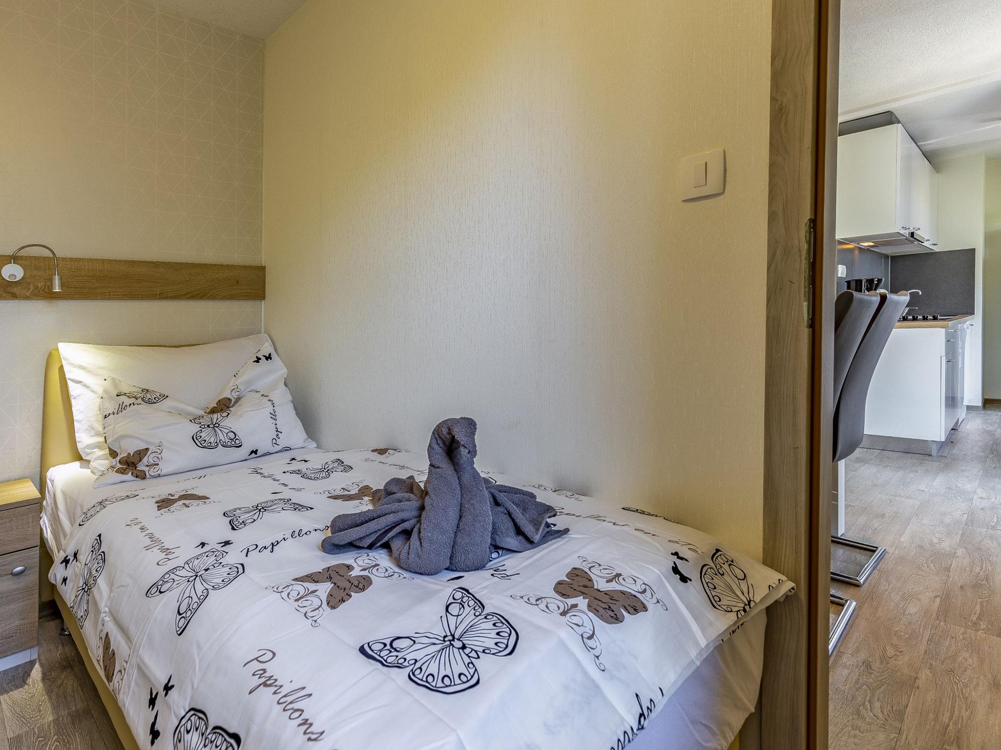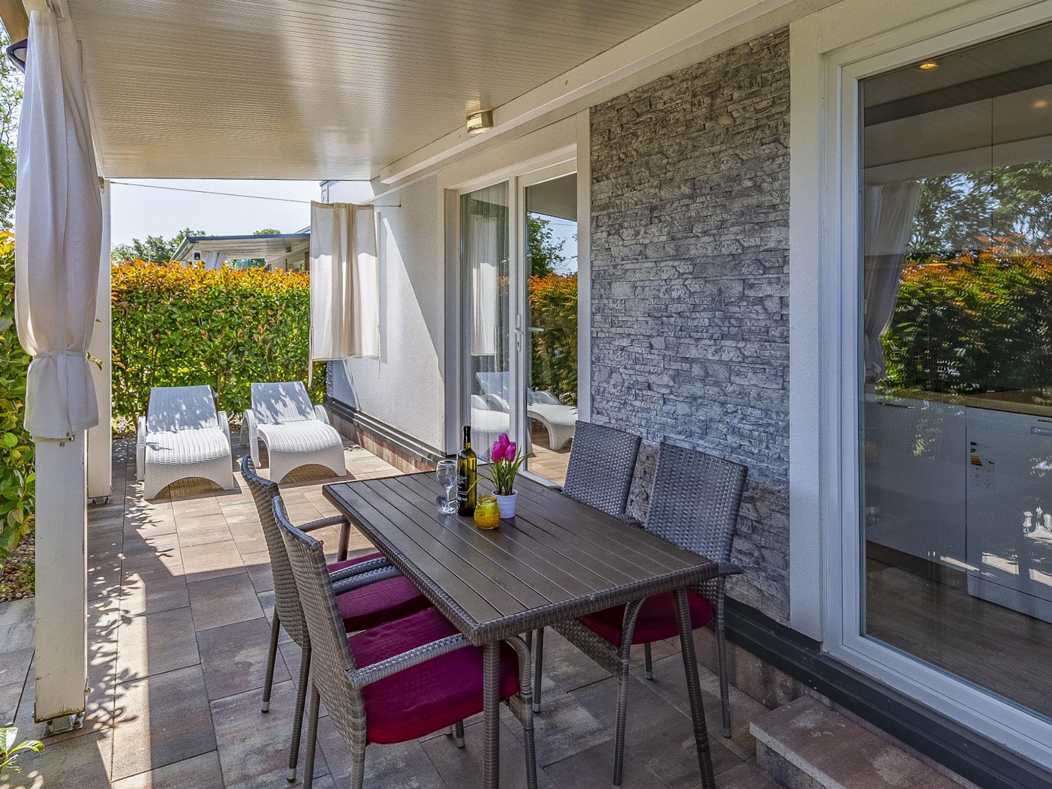 "Mobile home Superior", 3-room mobile home 40 m2. Living/dining room with 1 double sofabed (160 cm, length 200 cm), satellite TV (flat screen), air conditioning. Exit to the terrace. 1 room with 1 french bed (160 cm, length 200 cm), shower/WC. 1 room with 2 beds (90 cm, length 200 cm). Open kitchen (dishwasher, 4 ceramic glass hob hotplates, microwave, freezer, electric coffee machine). Shower/WC. Terrace 15 m2, roofed. Terrace furniture. Facilities: Internet (WiFi, free). Maximum 1 pet/ dog allowed.
