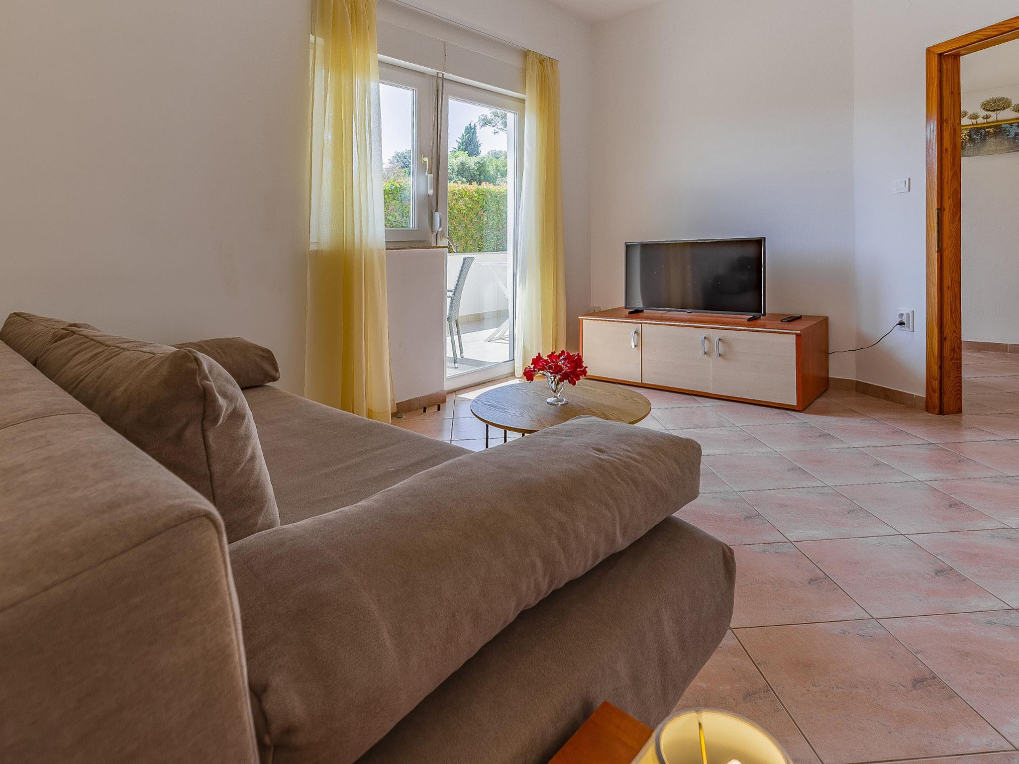 "Apartment Rok 2", 2-room apartment 40 m2, on the ground floor. Living room with 1 double sofabed (150 cm, length 200 cm), satellite TV. Exit to the terrace. 1 room with 1 double bed (2 x 90 cm, length 200 cm). Dining room with air conditioning. Open kitchen (2 hot plates, dishwasher, kettle, microwave, freezer, electric coffee machine). Shower/WC. Air-conditioning (extra). Terrace 10 m2, roofed. Terrace furniture. View of the garden. Facilities: Internet (WiFi, free). Maximum 1 pet/ dog allowed.