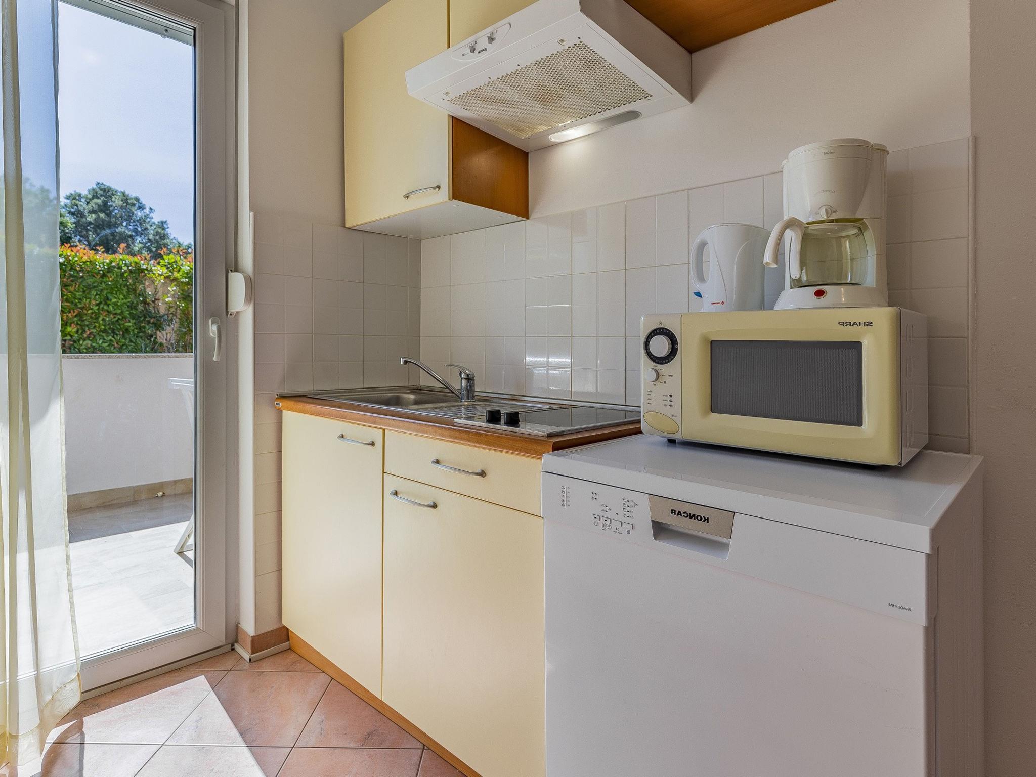 "Apartment Rok 3", 2-room apartment 40 m2, on the ground floor. Living room with 1 double sofabed (150 cm, length 200 cm), satellite TV. Exit to the terrace. 1 room with 1 double bed (2 x 90 cm, length 200 cm). Dining room with air conditioning. Open kitchen (2 hot plates, dishwasher, kettle, microwave, freezer, electric coffee machine). Shower/WC. Air-conditioning (extra). Terrace 10 m2, roofed. Terrace furniture. View of the garden. Facilities: Internet (WiFi, free). Maximum 1 pet/ dog allowed.