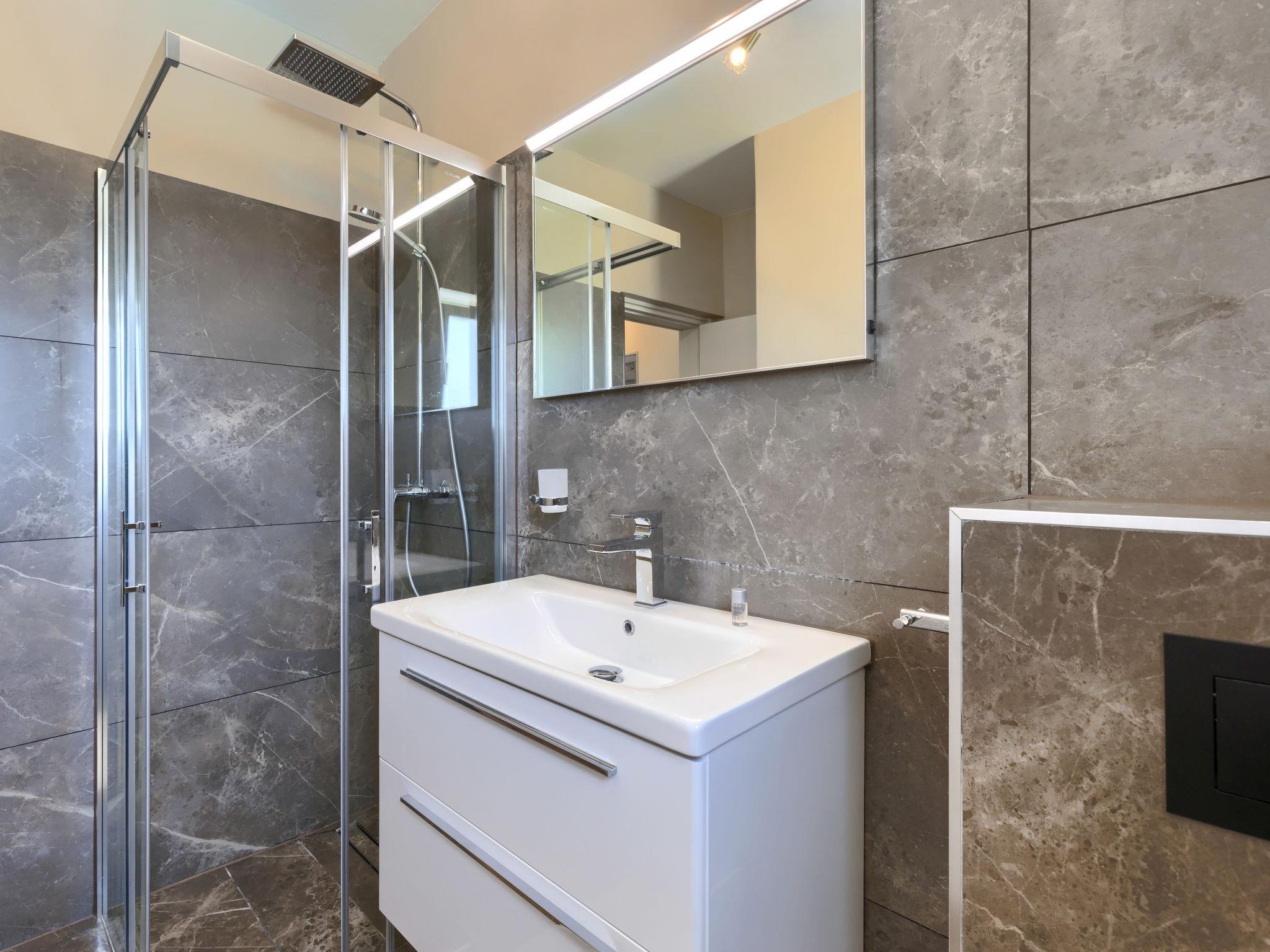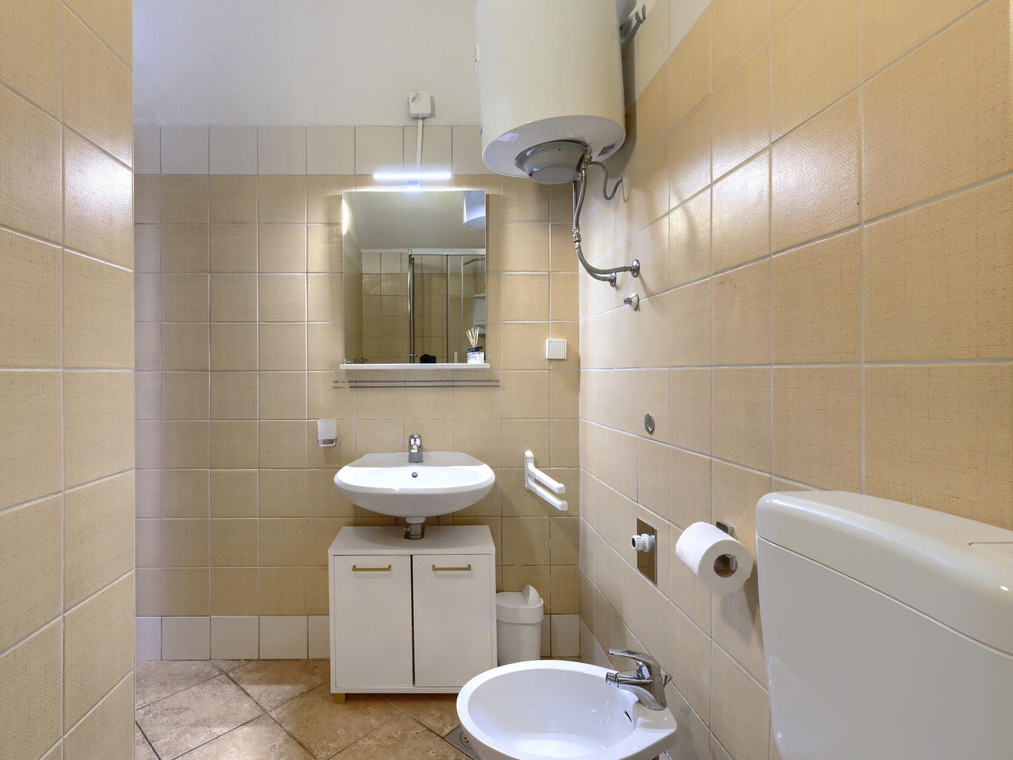 Banjole: Semi-detached house "Enka", 3 storeys, built in 2005, renovated. 3 apartments in the property. In the centre of Banjole 7 km from the centre of Pula, in the residential district, 950 m from the sea, 950 m from the beach, in a cul-de-sac. Private: property 200 m2 (fenced), swimming pool angular, heated (7 x 4 m, 28 m2, depth 135 cm, seasonal availability: 01.May. - 15.Oct.) with internal staircase and salt-electrolysis pool-cleaning system. WC in the pool area, outdoor shower, hot tub, terrace (20 m2), barbecue, pool maintenance by the owner/gardener. In the house: internet access, washing machine. Parking (for 4 cars) at the house on the premises. Shop, restaurant 200 m, bus stop 550 m, pebble beach, rocky beach 950 m. Please note: suitable for families. The owner does not accept any youth groups. Part of the house is closed and unoccupied. Airfield 14 km from the property. Semi-detached house consists of 3 apartments rented as one unit.