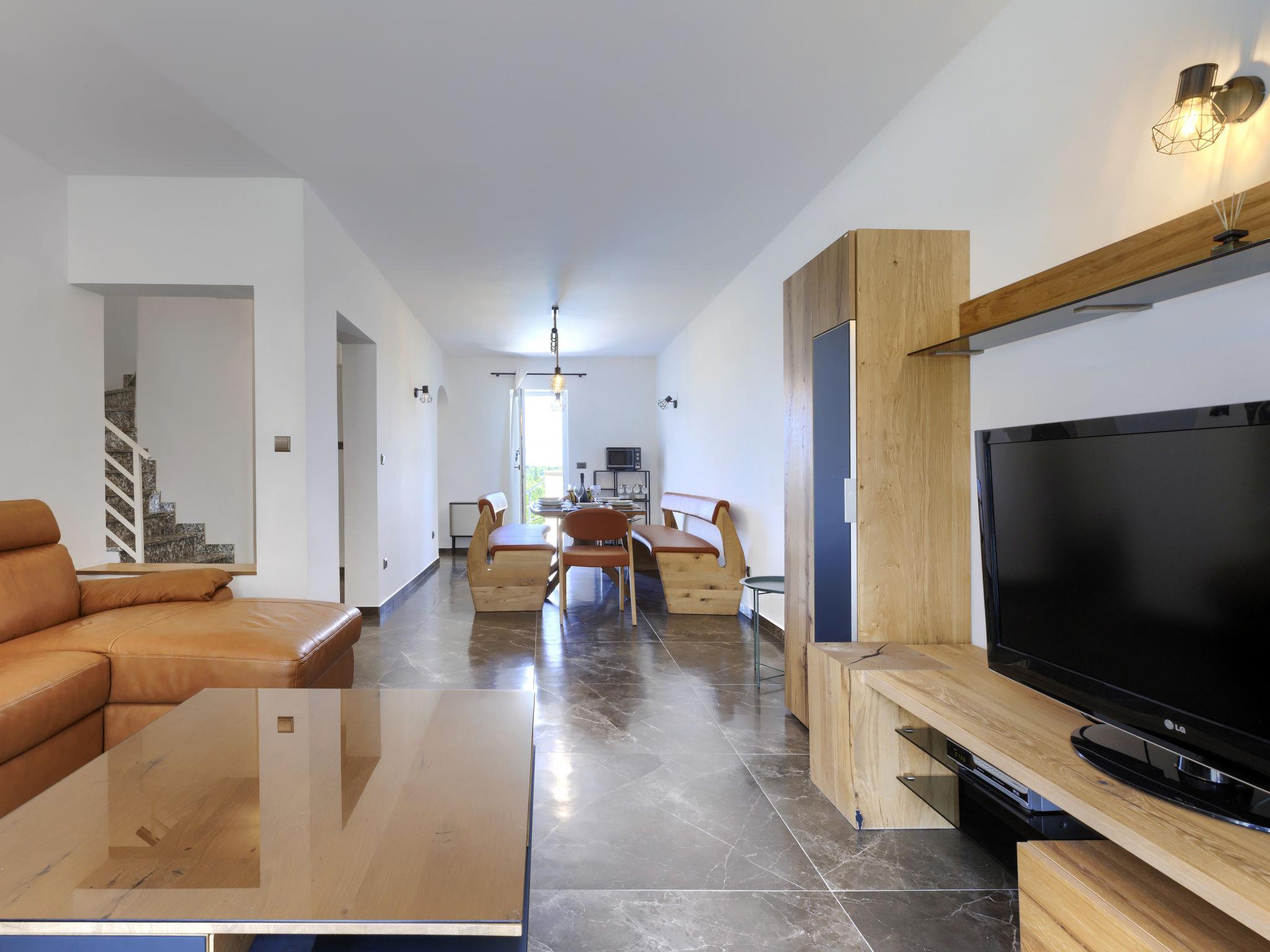 8-room semi-detached house 208 m2 on 3 levels. Renovated in 2022, comfortable and cosy furnishings: living/dining room with satellite TV and air conditioning. Exit to the balcony. 1 room with 1 double bed (160 cm, length 200 cm), air conditioning. Living/dining room with kitchen corner and satellite TV. Open kitchen (oven, dishwasher, 4 ceramic glass hob hotplates, toaster, kettle, freezer, electric coffee machine). 2 showers/WC. Upper floor: (exterior staircase) living/dining room with air conditioning. 1 room with 1 double bed (160 cm, length 200 cm), air conditioning. 3 rooms, each room with 1 double bed (160 cm, length 200 cm), air conditioning. Open kitchen (oven, dishwasher, 4 ceramic glass hob hotplates, toaster, kettle, freezer, electric coffee machine). Bath/WC, 2 showers/WC. Forced-air heating. Balcony 4 m2, terrace 20 m2, roofed. Terrace furniture, deck chairs. Facilities: iron, baby cot for up to 2 year olds. Internet (WiFi, free). Please note: suitable for families. Non-smoking house. No internal connecting door between the separated properties. On the ground floor: one apartment with external entrance, living/dining area, open kitchen and 1 bedroom, the second apartment on two floors with external entrance, living/dining area and open kitchen on the ground floor, 3 bedrooms on the first floor, third apartment on the first floor with external stairs: living/dining area, open kitchen and 1 bedroom.