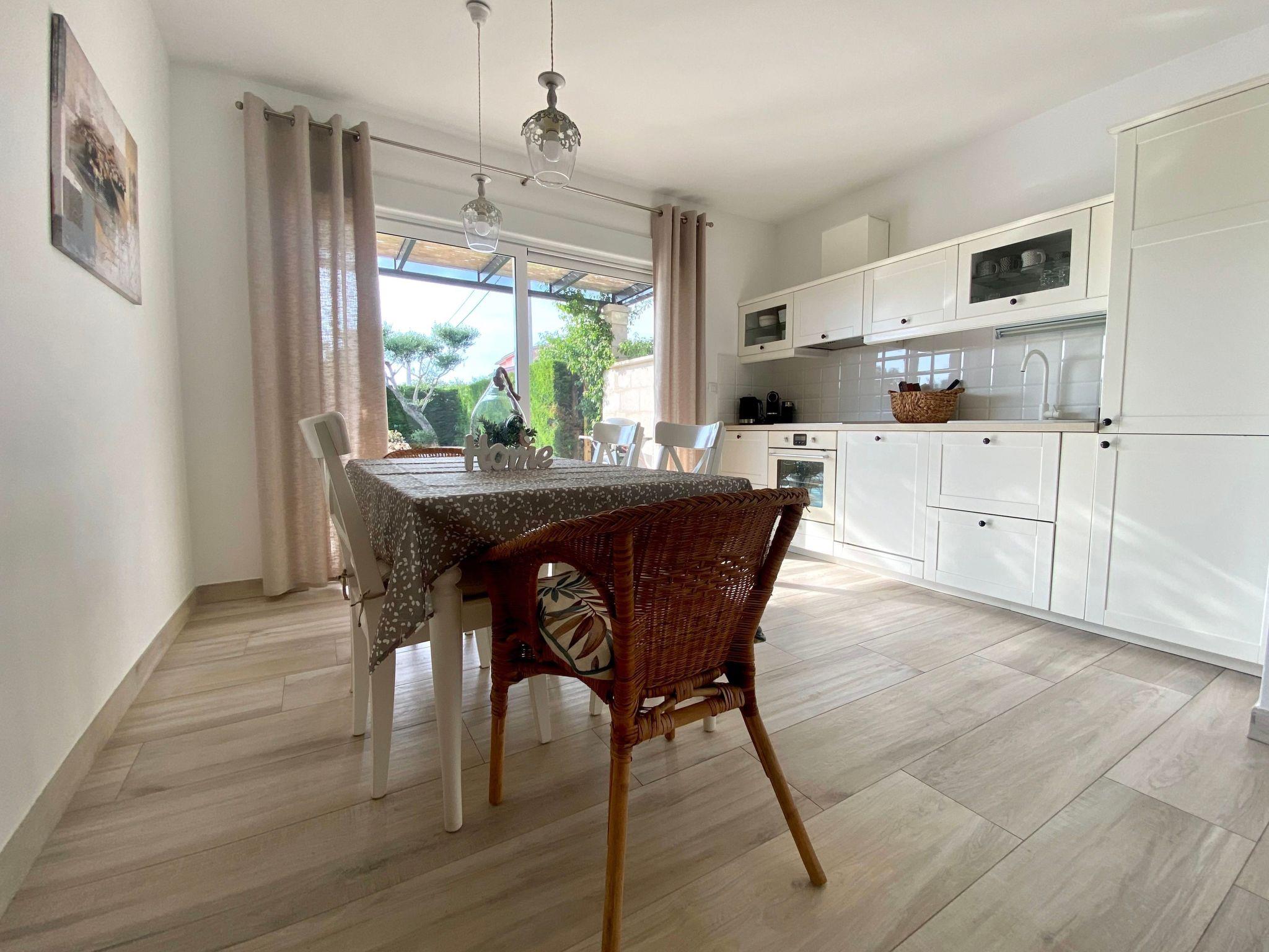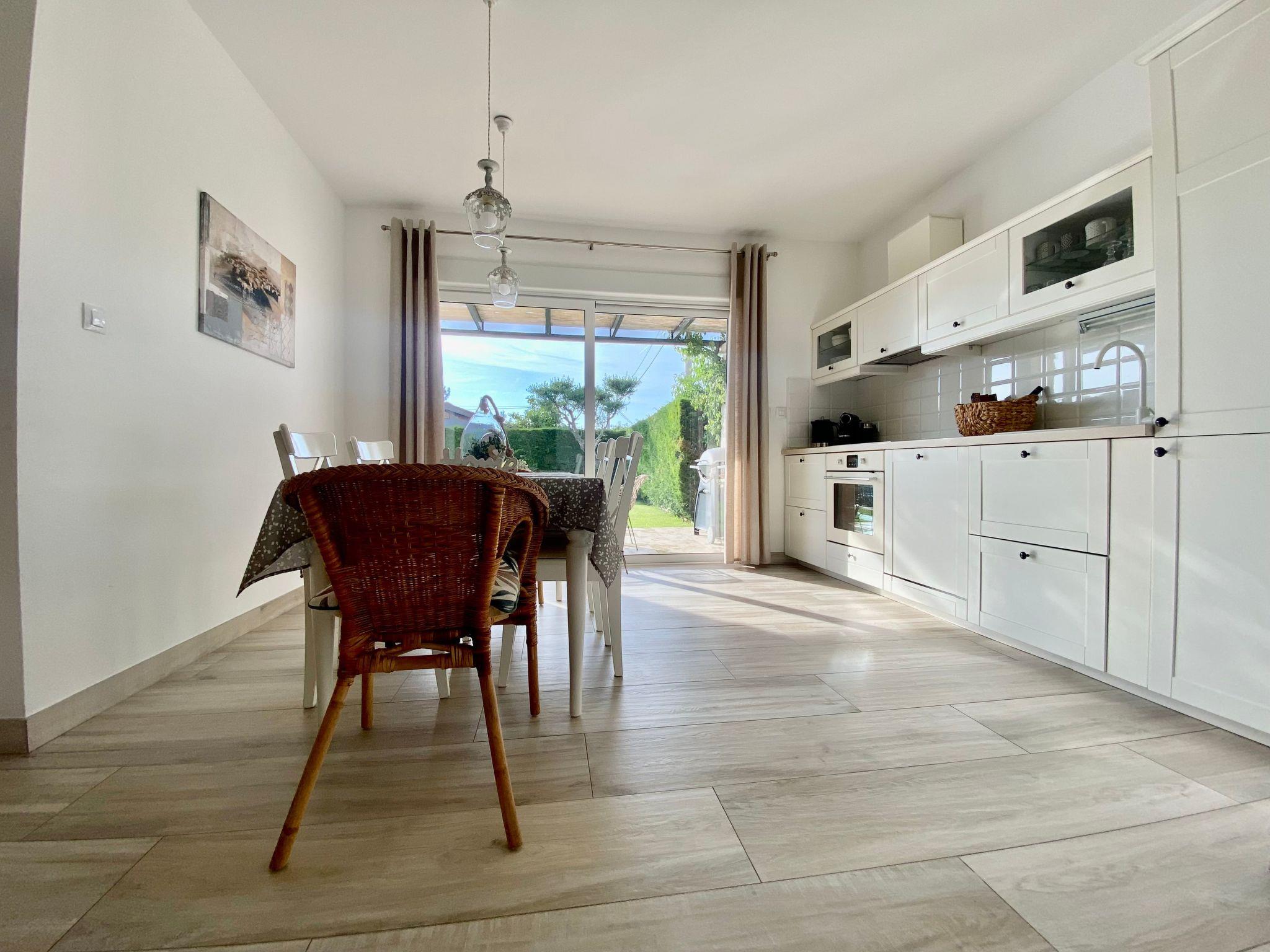 The beautiful villa, which has an open and light layout, is on two floors and can accommodate up to eight people. The first floor has three bedrooms, of which two have a double bed (180 x 200cm and 160 x 200cm) and one has two single beds (90 x 200cm). In addition to that you find a TV in each bedroom. It also has a bathroom with a shower, washbasin, toilet and a separate WC. The ground floor comprises an air-conditioned living and dining room with an open kitchen. The living and dining room has a sofa bed (160 x 200cm), cableTV and a dining table with eight chairs. The kitchen unit is fully-equipped with a stove, oven, fridge-freezer, microwave, kettle, coffee machine and dishwasher. There is another bathroom with a shower, washbasin and toilet. Wireless Internet access is available.