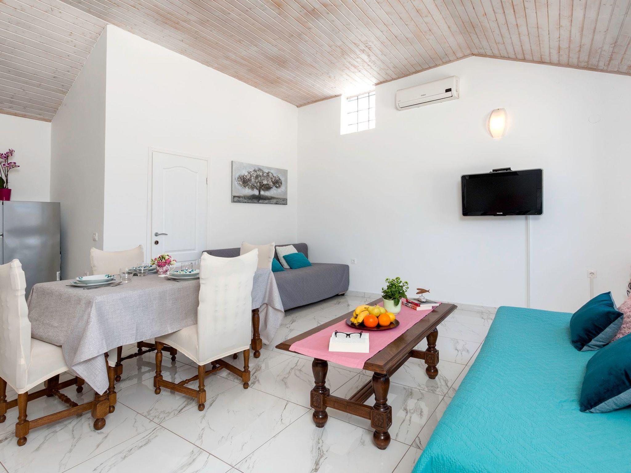 The interior of the holiday house spans 95 m2, creating a spacious and welcoming environment for all guests. It features two cozy bedrooms and a bathroom equipped with a bathtub, catering effortlessly to your comfort and relaxation needs. The house is thoughtfully furnished, including air conditioning throughout, ensuring a pleasant stay regardless of the weather. The practical additions of a washing machine and dishwasher, along with an electric kettle, enhance your convenience, allowing you to focus on enjoying your vacation.