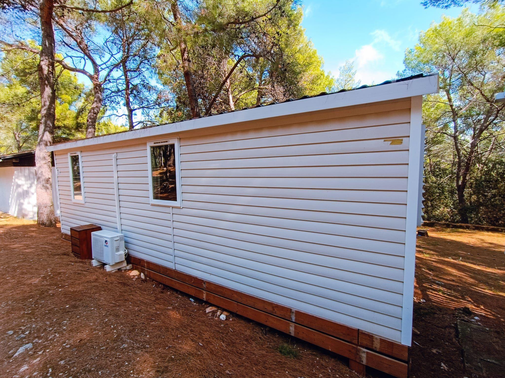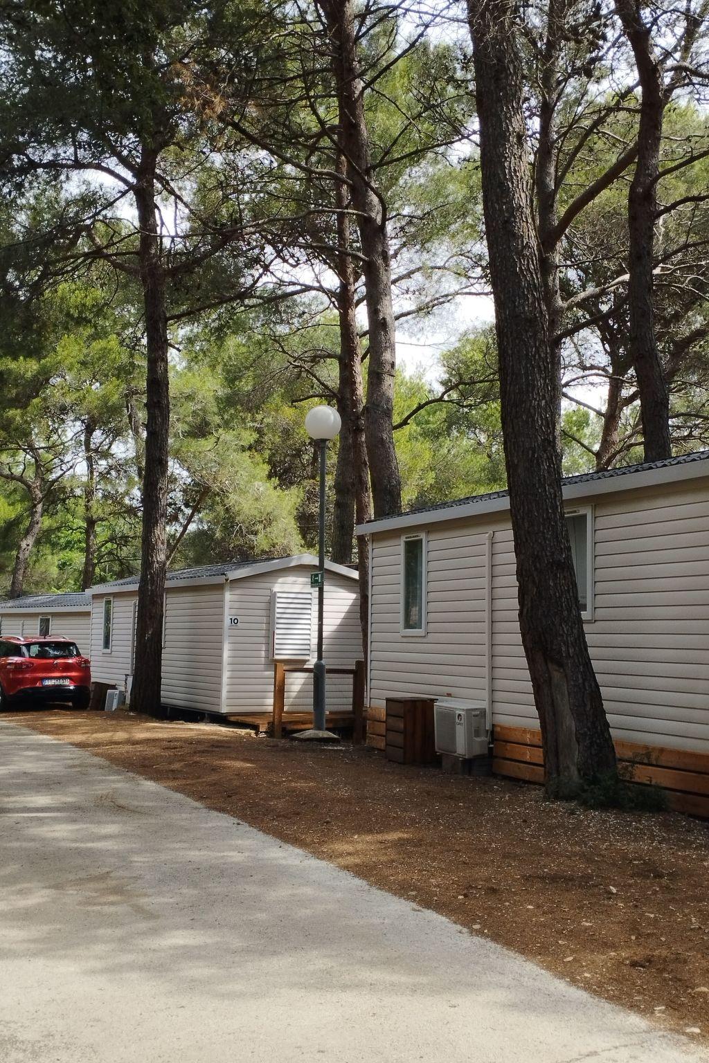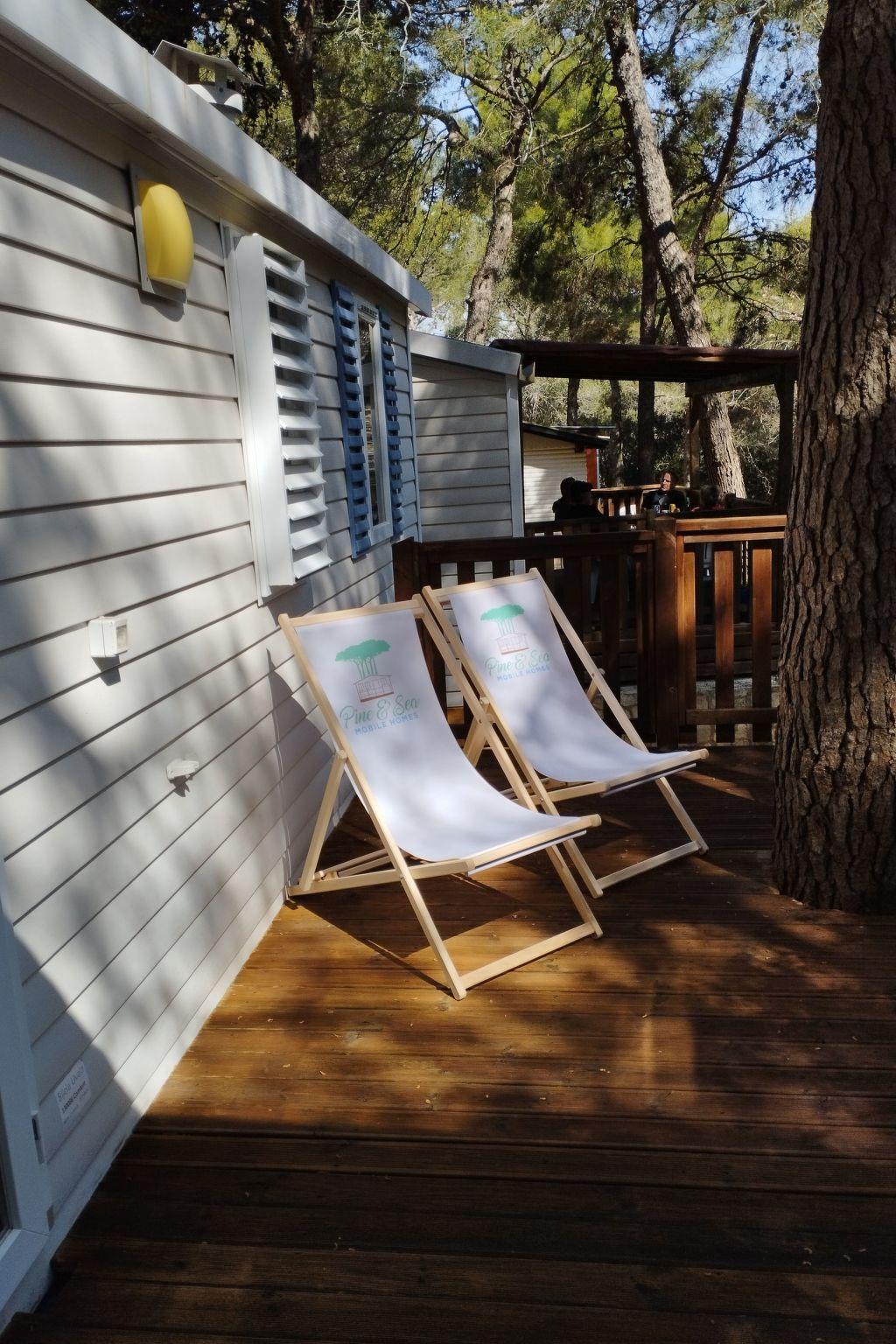 The accommodation consists of a well-equipped kitchen with a dining area, a fridge with freezer and coffee machine are also offered. Two separated bedrooms, one with double bed and other with two single beds The 5-th person must sleep in the kitchen sofa. One bathroom with shower and the toilet is separated. .Each mobile home has a half covered wooden terrace with garden furniture. All mobile homes are situated in pine forest, lots of natural shade and tranquility.