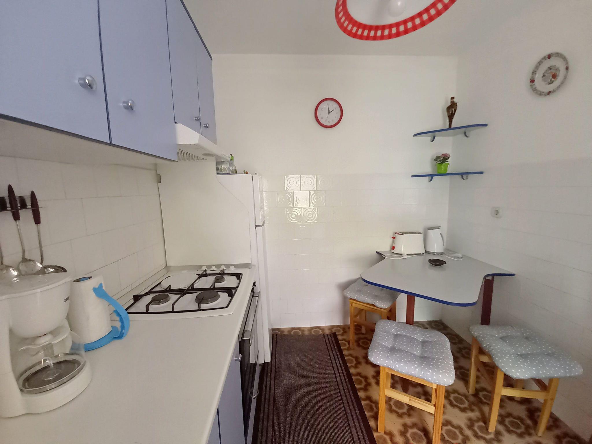 Kitchen + dining room (small table with 3 chairs), kitchen equipment: gas + electric stove (4 rings, 3+1), oven, coffee machine, refrigerator with freezing compartment, extractor hood, toaster, cooking utensils