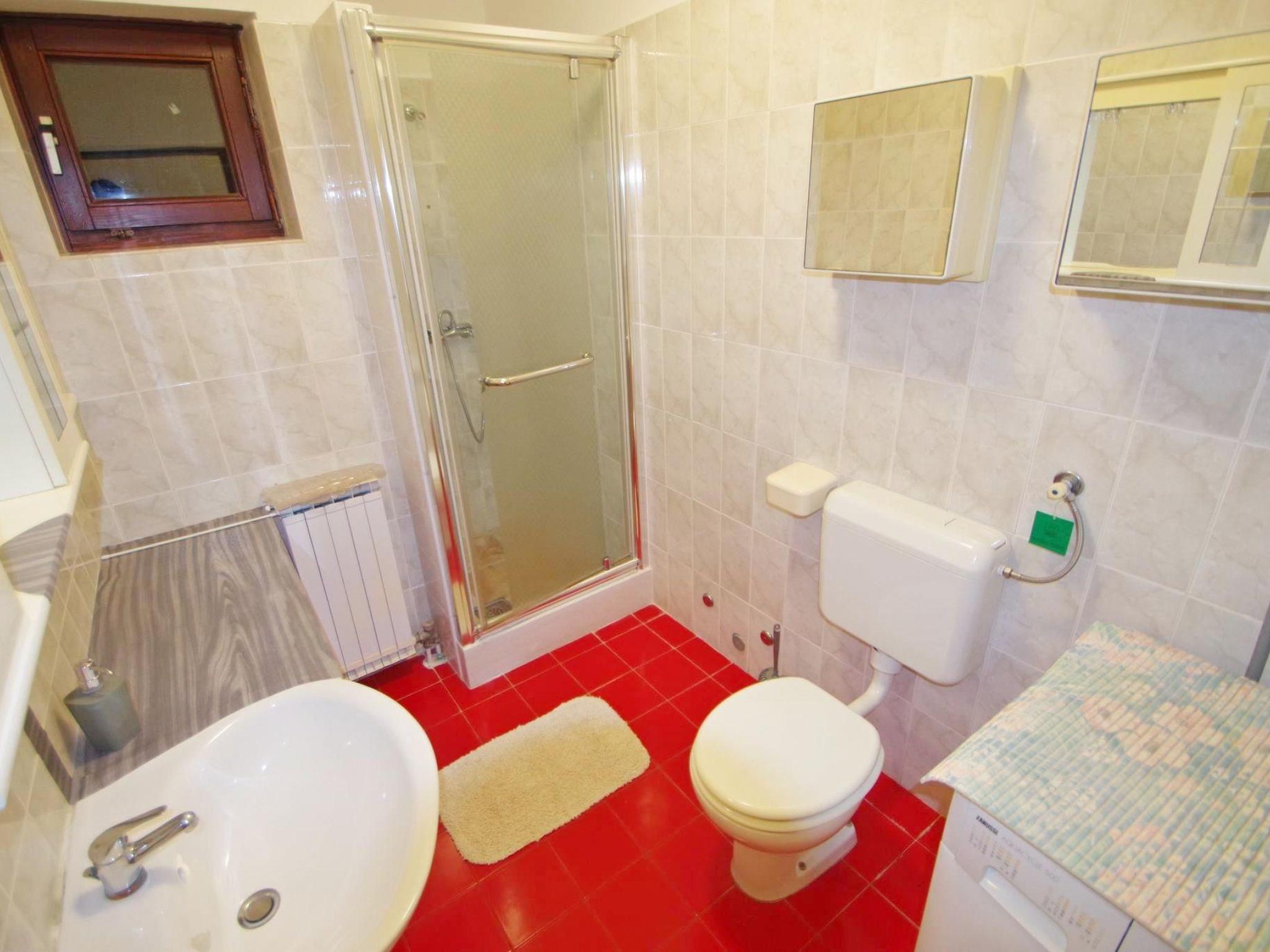 -Bathroom with shower, washstand, toilet, hairdryer, washing machine