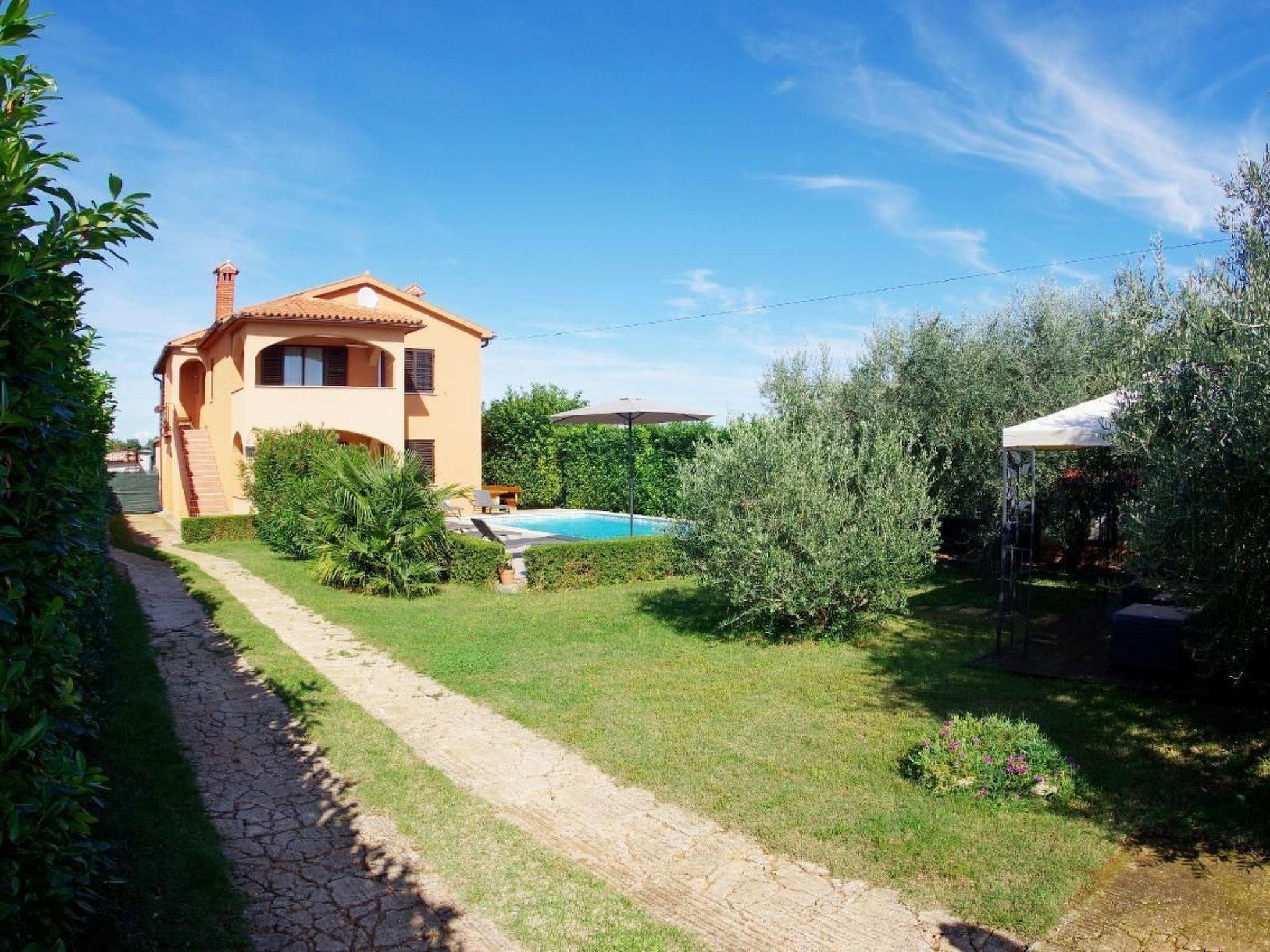3 bedroom holiday apartment with private swimming pool (8m x 4m) located on a green spot in village Šišan 9 km from the historical center of Pula. The house is surrounded by (400m2) fenced garden with lawn, in closer vicinity by fields and Mediterranean vegetation. Behind the house the owner has agricultural land with fresh fruit and vegetables. The apartment is located on the first floor.