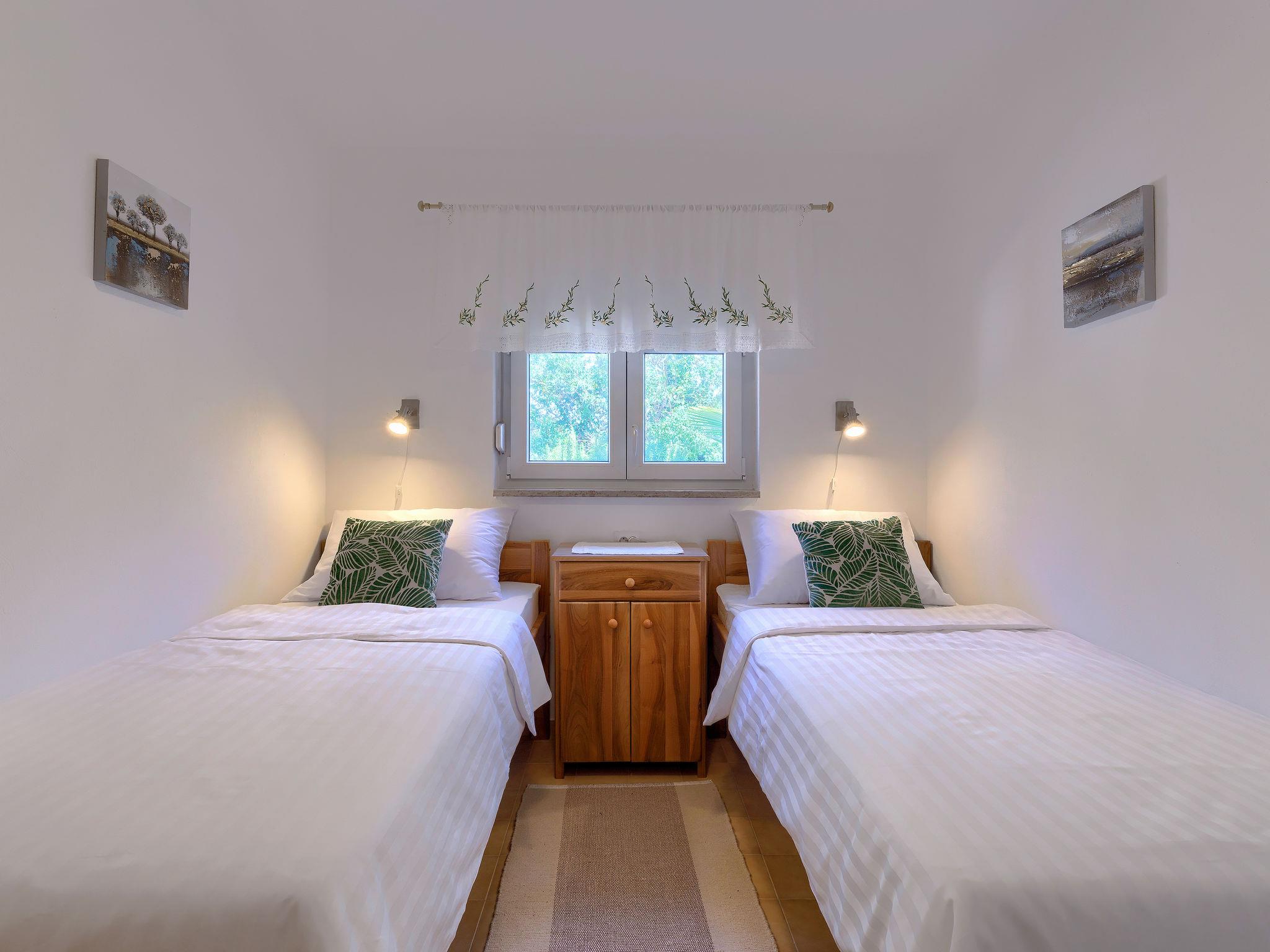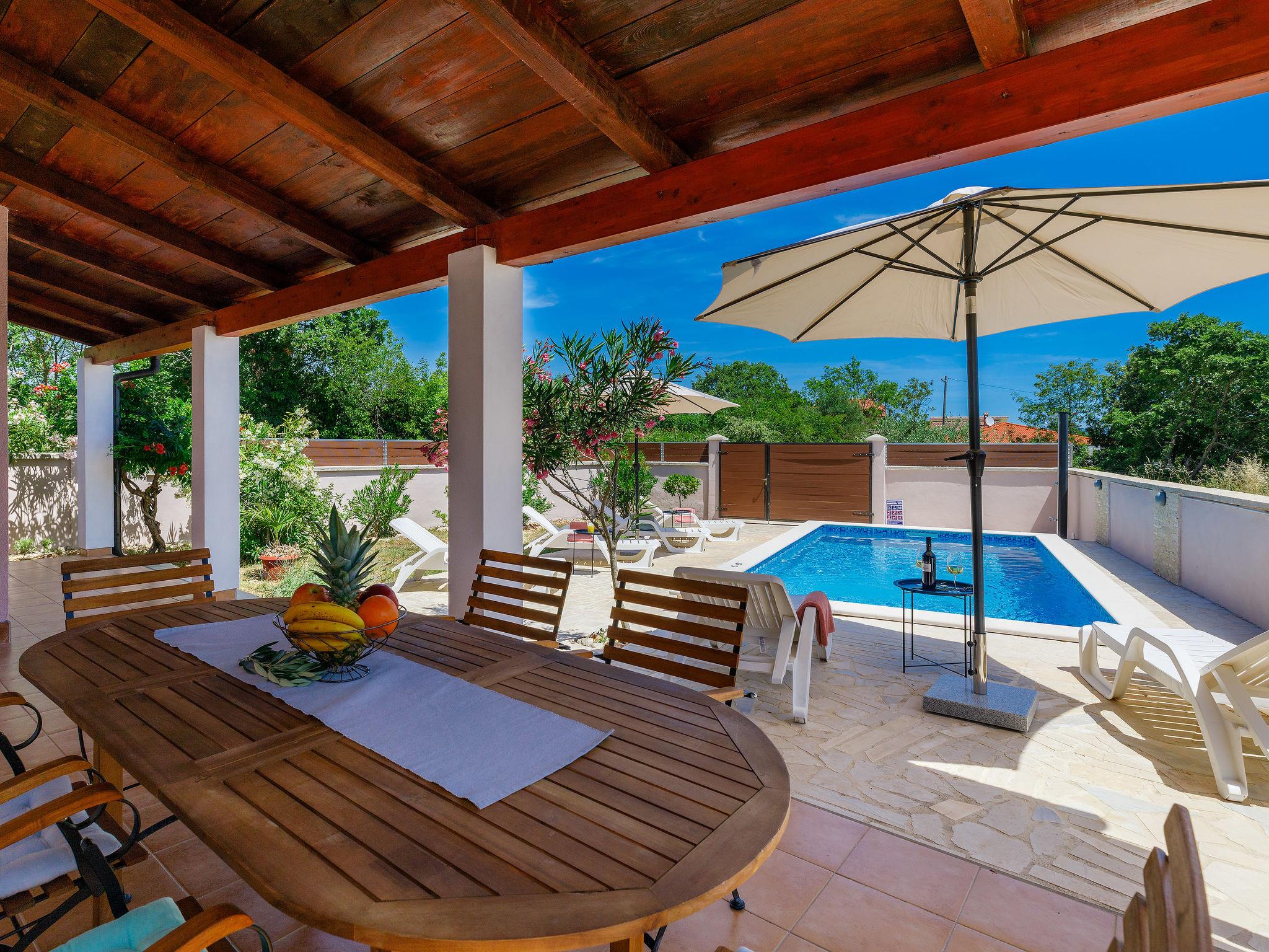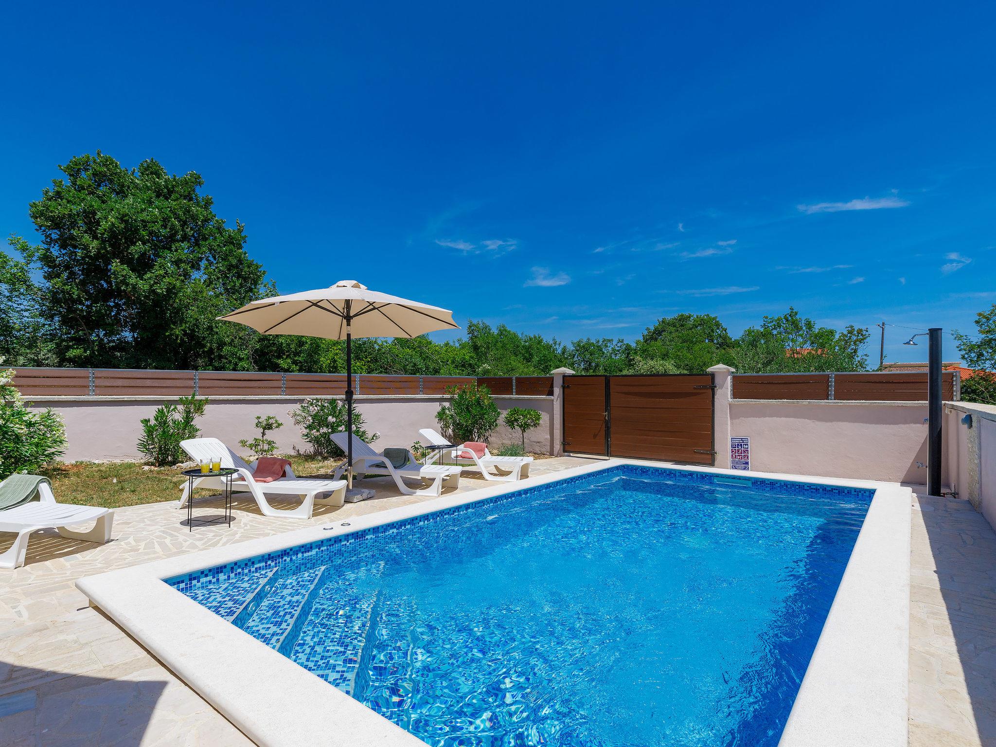 Pavicini 2 km from Duga Uvala: Single-family house "Maslina". 6 km from the centre of Marcana, in a quiet position, 2.2 km from the sea, 2.2 km from the beach, in the countryside. Private: property 400 m2 (fenced) with wildlife garden, swimming pool angular (6 x 3 m, depth 135 cm, seasonal availability: 01.May. - 15.Oct.) with internal staircase. Outdoor shower, pool maintenance by the owner/gardener. In the house: internet access, washing machine, tumble dryer. Motor access to the house (100 m via unmade road). Parking (for 2 cars) at the house on the premises. Shop 150 m, supermarket 18 km, restaurant 3 km, bus stop 7.2 km, pebble beach 2.2 km, rocky beach 2.2 km. Please note: part of the house is closed and unoccupied. Airfield 17 km from the property. Swimming pool with hydromassage.
