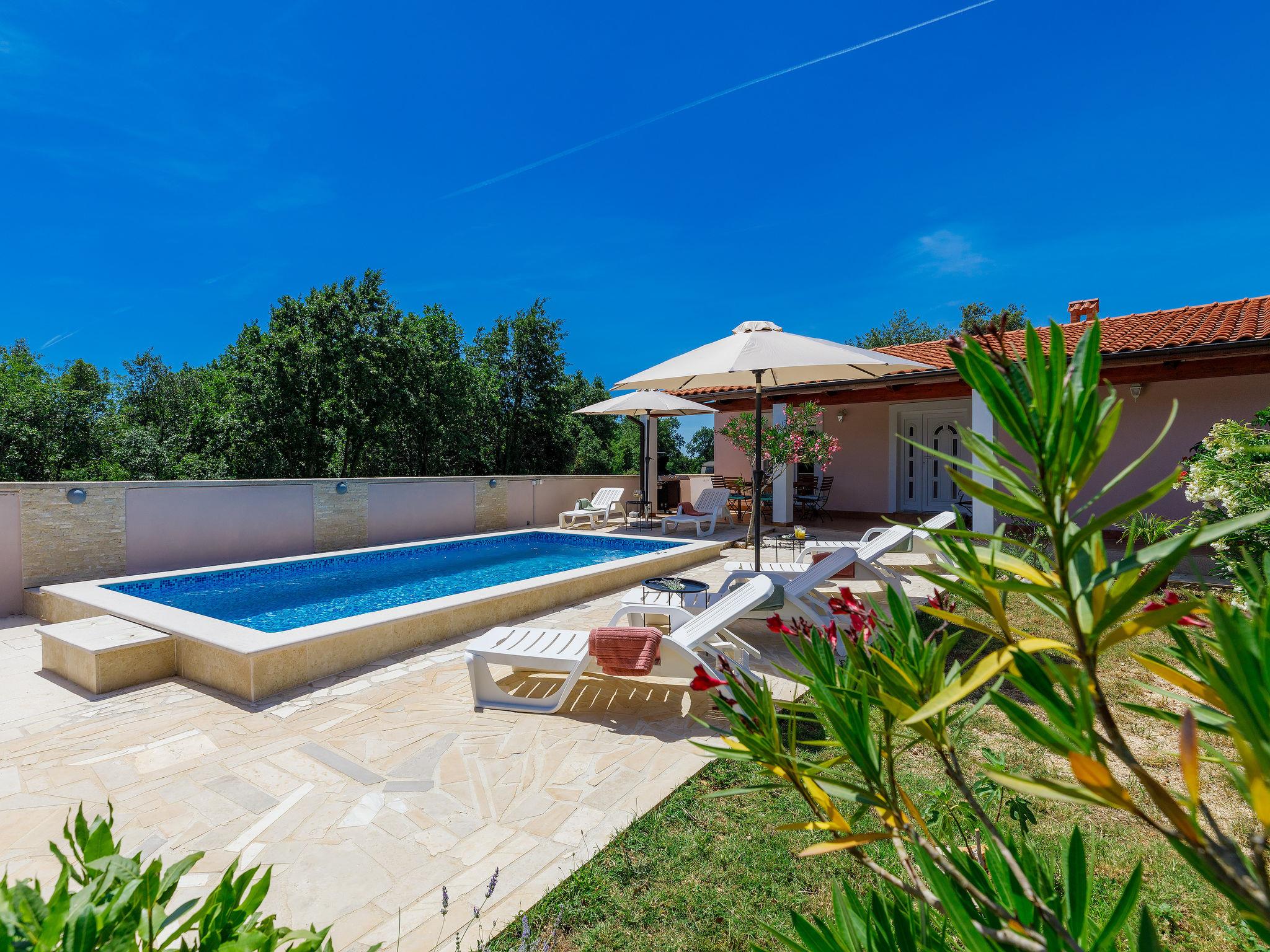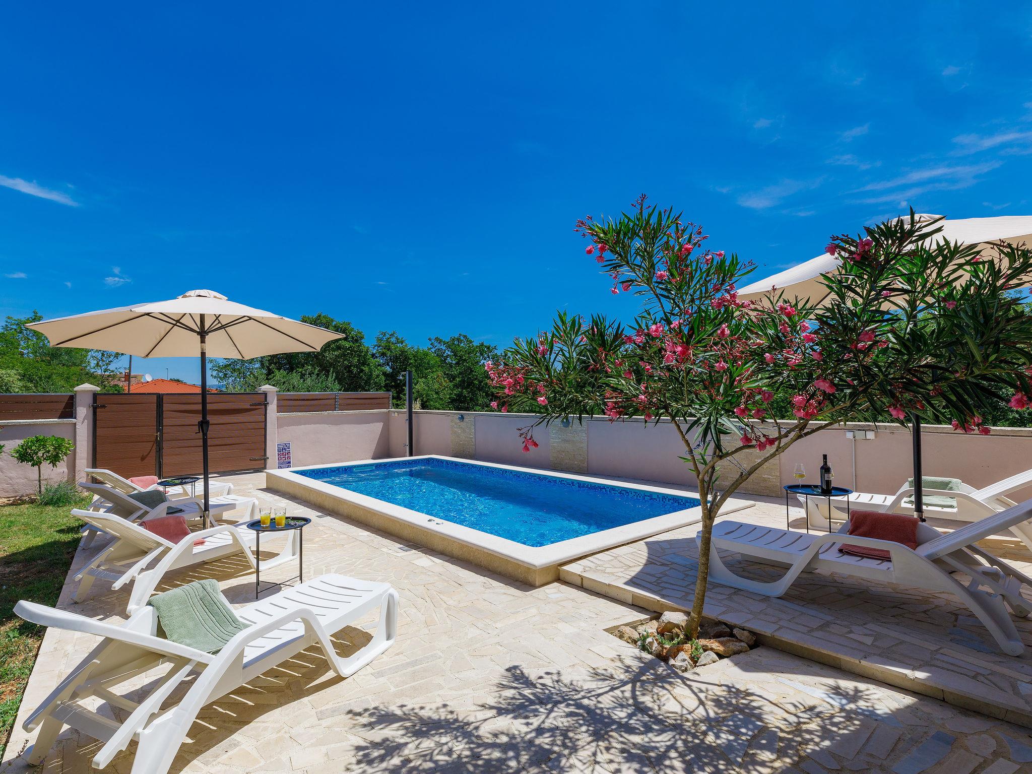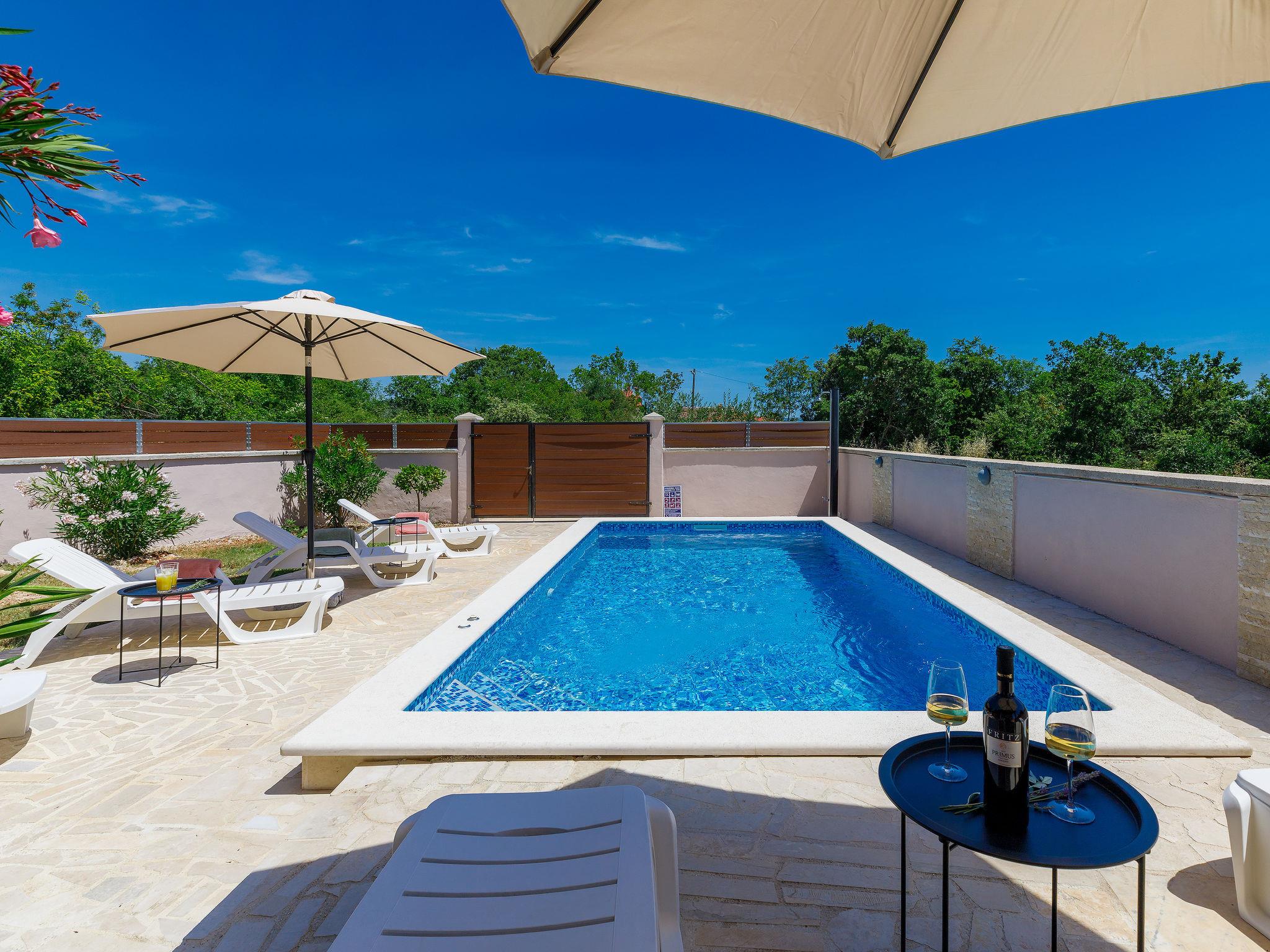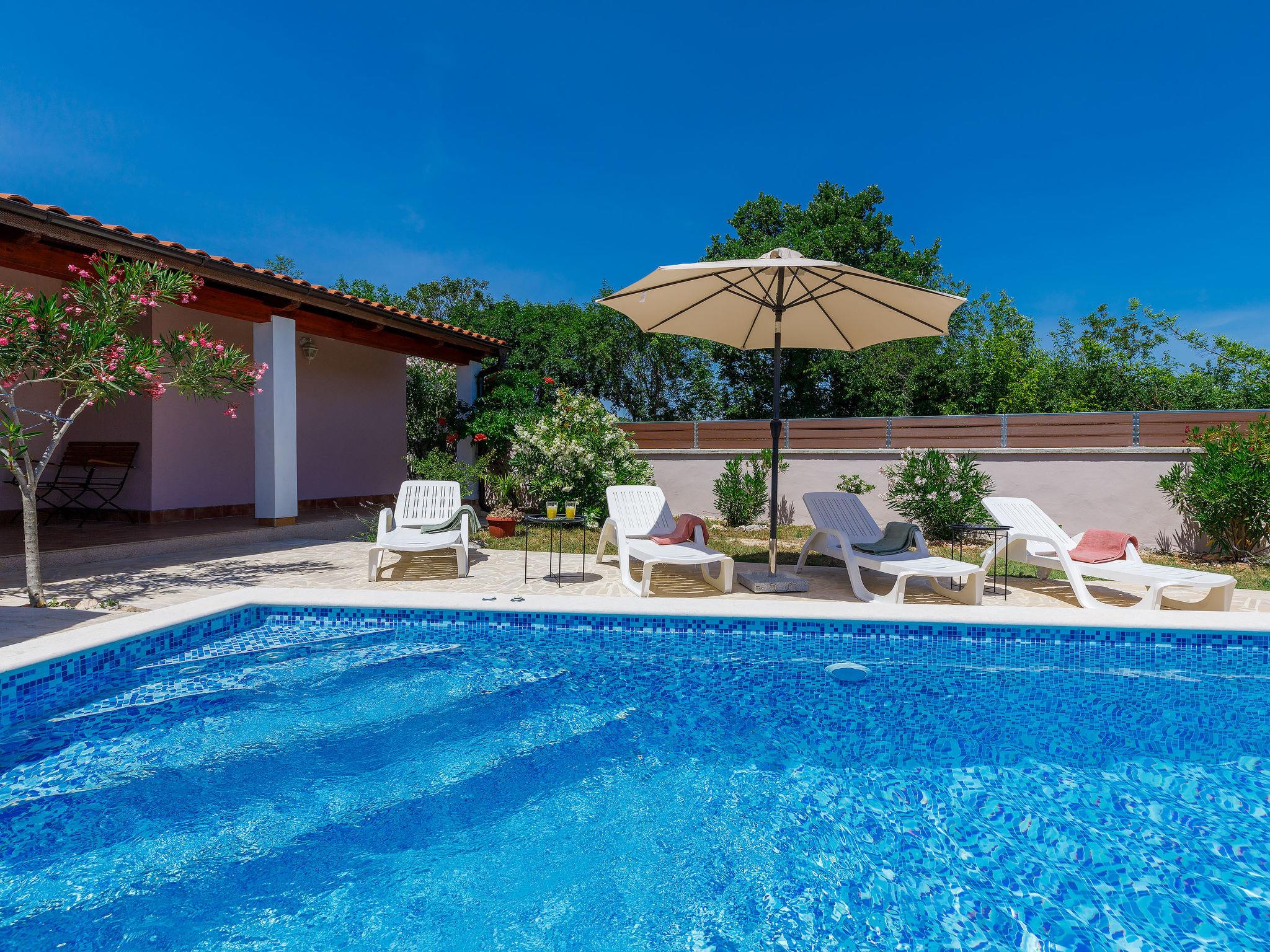 Pavicini 2 km from Duga Uvala: Single-family house "Maslina". 6 km from the centre of Marcana, in a quiet position, 2.2 km from the sea, 2.2 km from the beach, in the countryside. Private: property 400 m2 (fenced) with wildlife garden, swimming pool angular (6 x 3 m, depth 135 cm, seasonal availability: 01.May. - 15.Oct.) with internal staircase. Outdoor shower, pool maintenance by the owner/gardener. In the house: internet access, washing machine, tumble dryer. Motor access to the house (100 m via unmade road). Parking (for 2 cars) at the house on the premises. Shop 150 m, supermarket 18 km, restaurant 3 km, bus stop 7.2 km, pebble beach 2.2 km, rocky beach 2.2 km. Please note: part of the house is closed and unoccupied. Airfield 17 km from the property. Swimming pool with hydromassage.