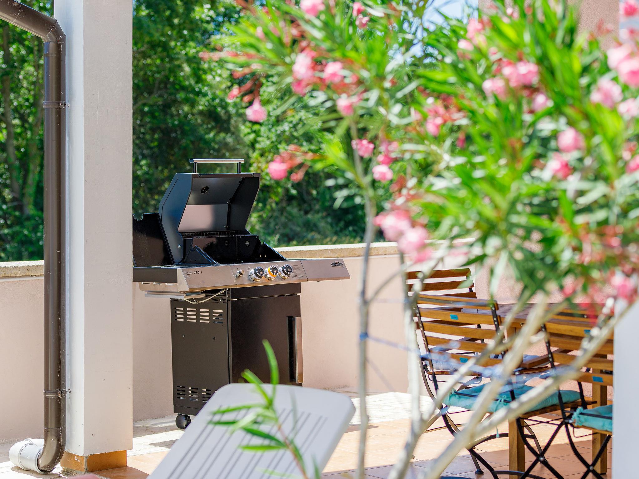 4-room house 75 m2. Cosy furnishings: living/dining room with satellite TV and air conditioning. Exit to the terrace, to the swimming pool. 1 room with 2 beds (90 cm, length 200 cm), shower/WC and air conditioning. 1 room with 1 french bed (160 cm, length 200 cm), shower/WC and air conditioning. 1 room with 1 french bed (160 cm, length 200 cm), air conditioning. Open kitchen (oven, dishwasher, 4 ceramic glass hob hotplates, toaster, kettle, microwave, freezer, electric coffee machine). Shower/WC. Forced-air heating. Terrace 20 m2, roofed. Terrace furniture, barbecue (portable), deck chairs. View of the swimming pool. Facilities: iron, mosquito net, hair dryer. Internet (WiFi, free). Please note: non-smoking house. Fire extinguisher.