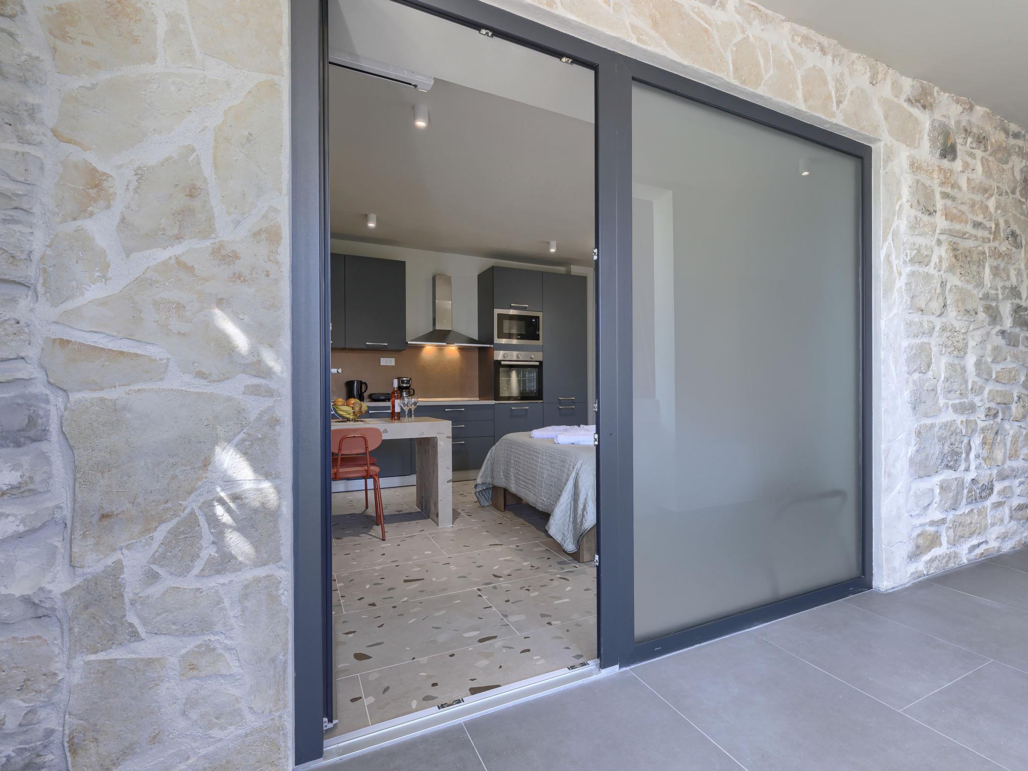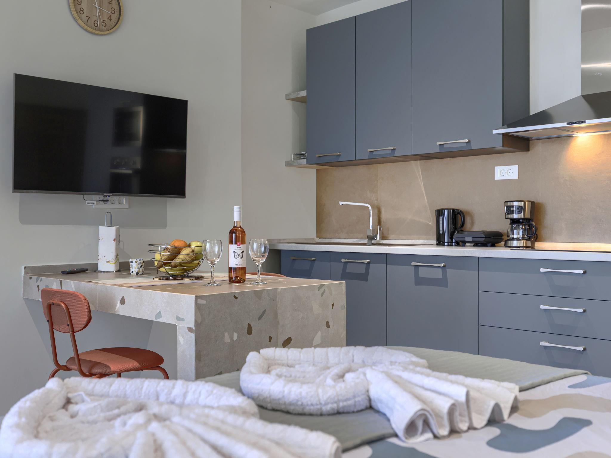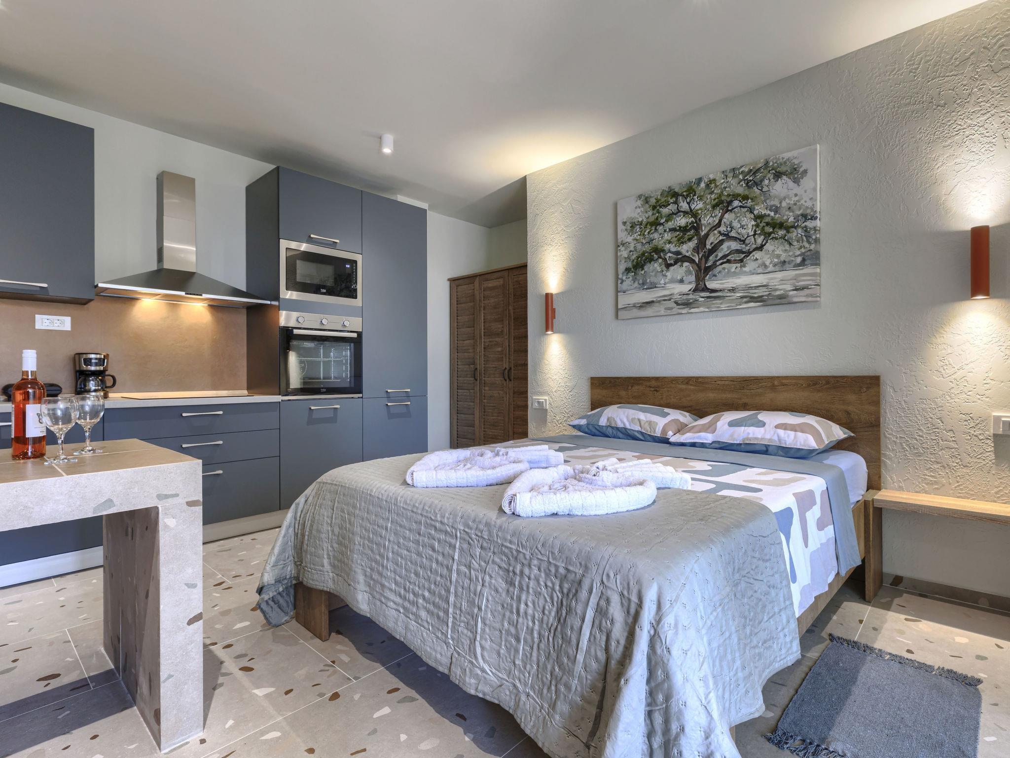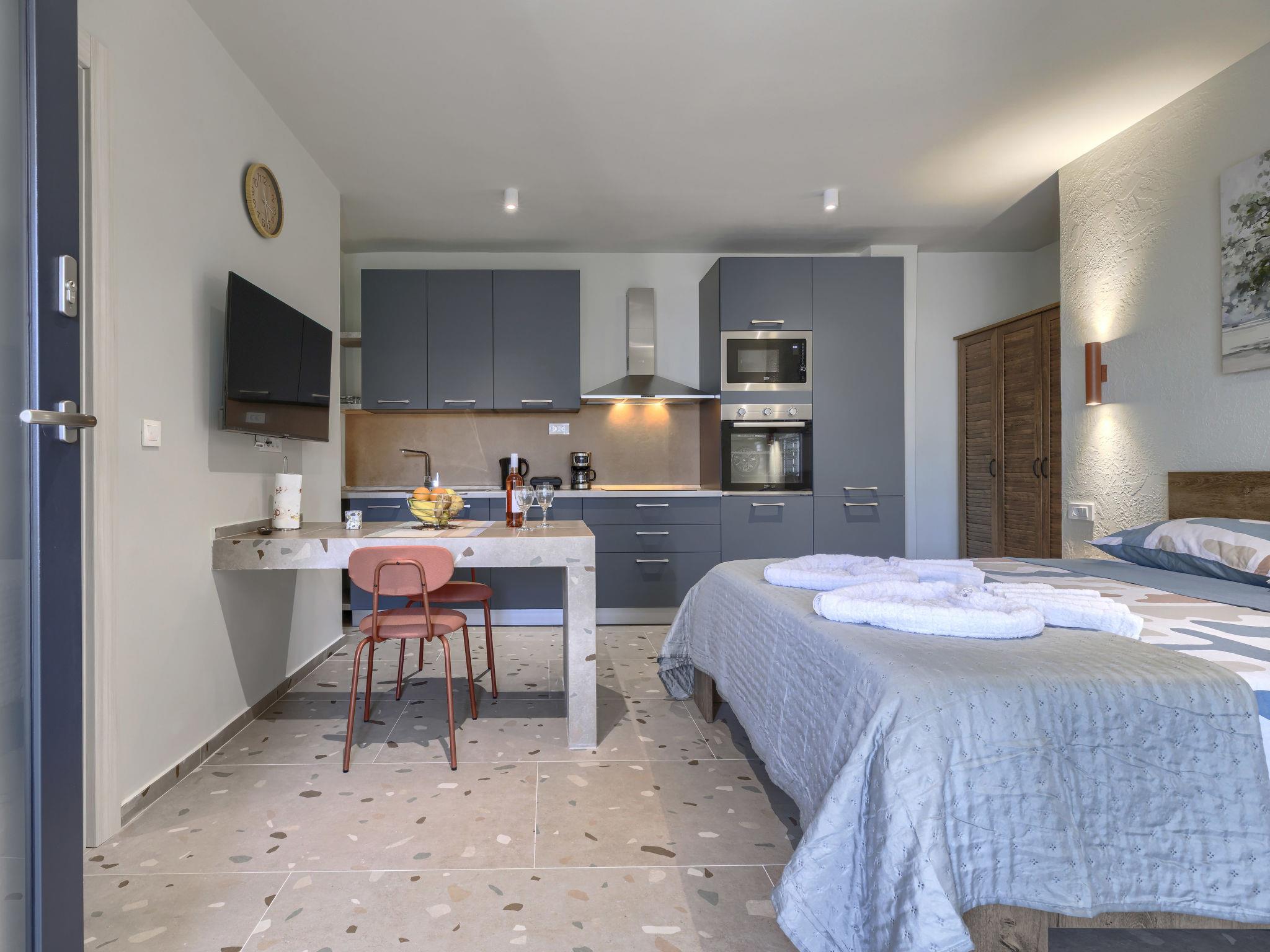 "Maslina", 1-room studio 25 m2, on the ground floor. Beautiful furnishings: living/sleeping room with 1 french bed (160 cm, length 200 cm), satellite TV (flat screen), air conditioning. Exit to the terrace. Open kitchen (oven, dishwasher, 4 ceramic glass hob hotplates, toaster, freezer, electric coffee machine). Shower/WC. Forced-air heating. Facilities: Internet (WiFi, free). Please note: private entrance.