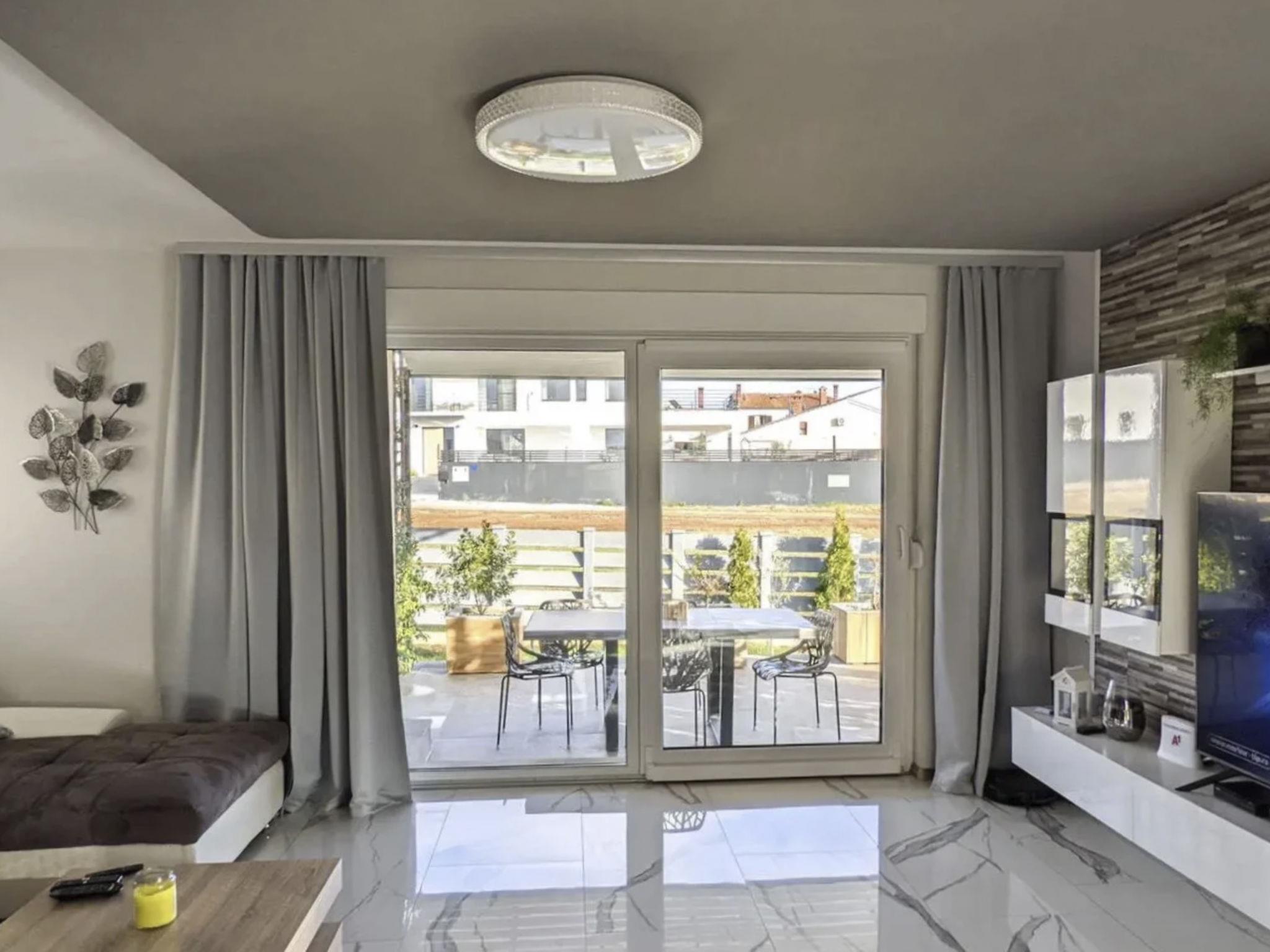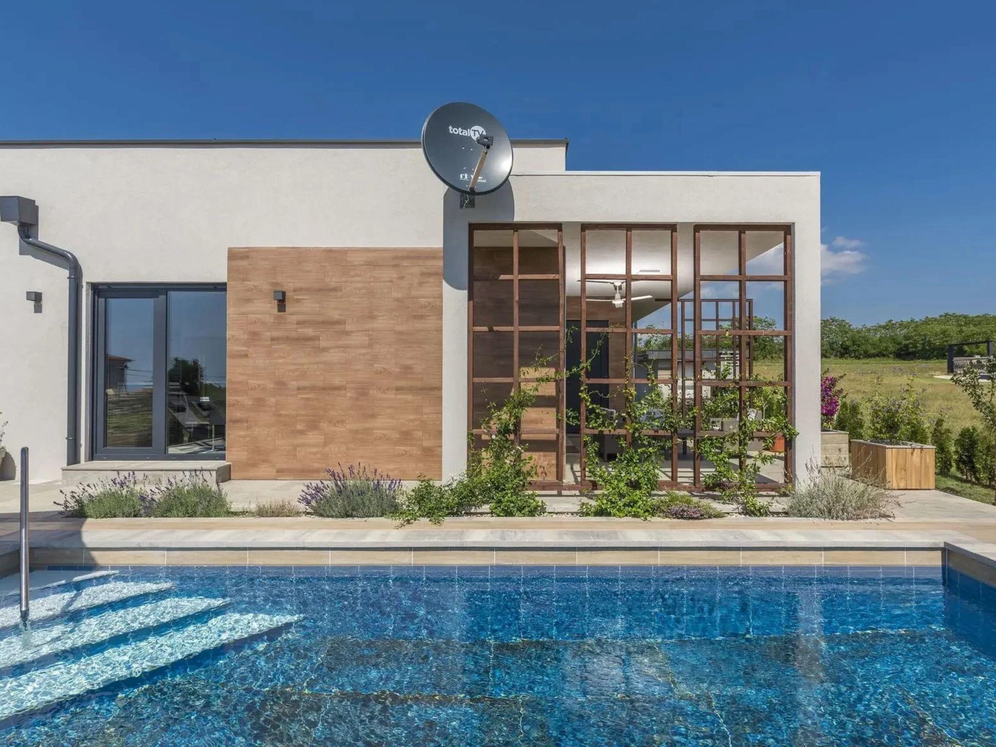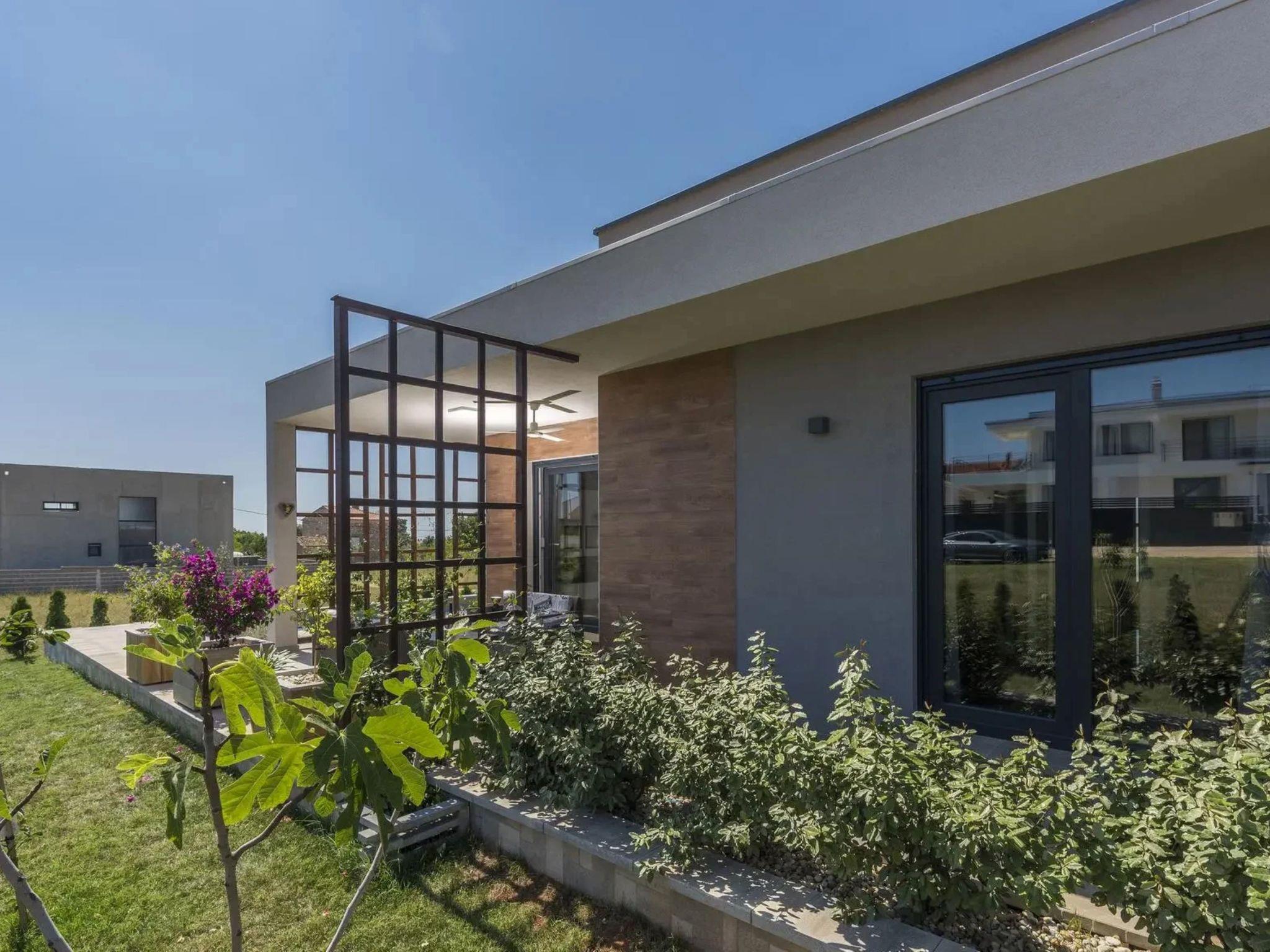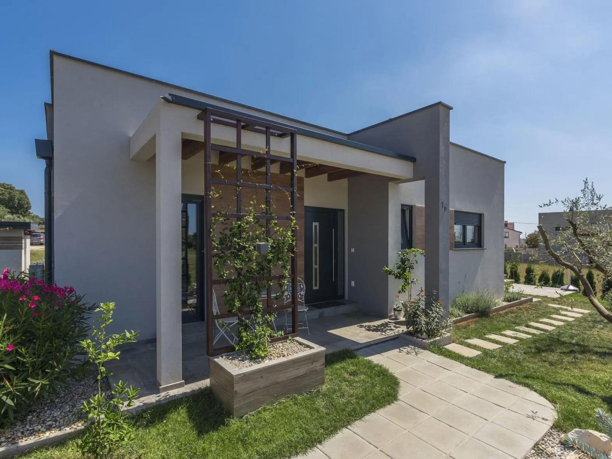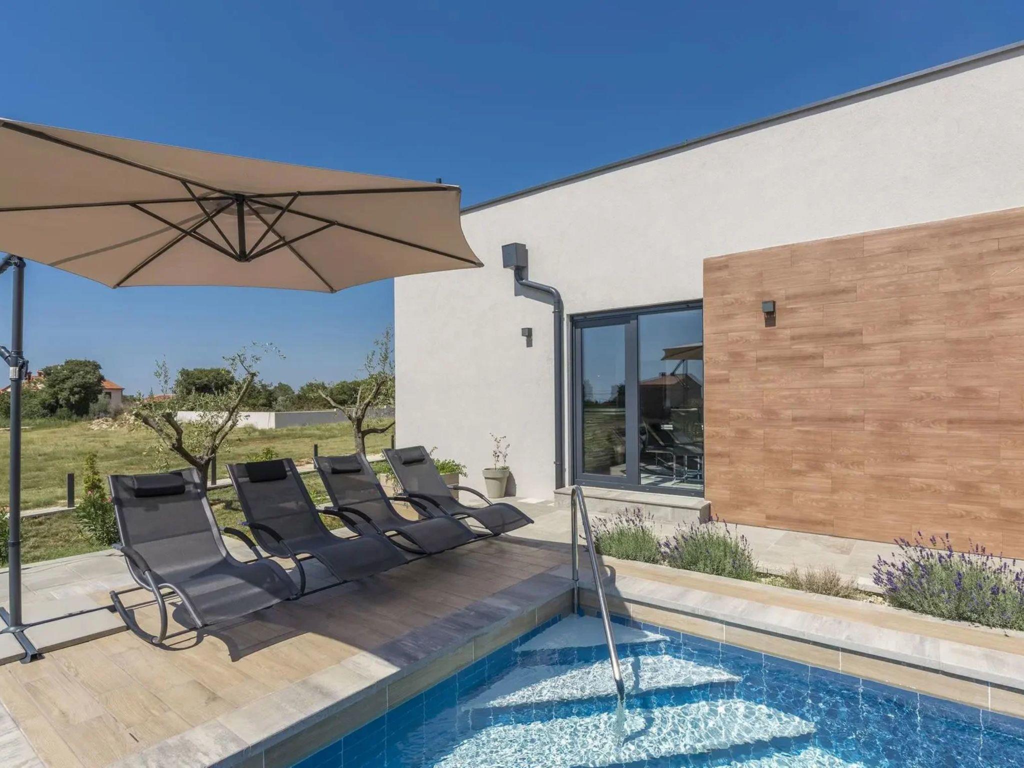 Galižana 5 km from Pula: Modern, cosy house "Ljiljana". 1 km from the centre of Galižana, 5 km from the sea, 5 km from the beach. Private: property 450 m2 (fenced), well-kept garden with wildlife garden and trees, swimming pool angular (8 x 3 m, depth 140 cm, seasonal availability: 01.May. - 01.Oct.) with internal staircase. Outdoor shower, terrace (20 m2), garden furniture, barbecue. In the house: internet access, air conditioning, washing machine. Parking (for 2 cars) at the house on the premises. Shop 400 m, restaurant 3 km, café 400 m, bus stop 1 km, pebble beach 5 km, rocky beach 5 km. Please note: airfield 8 km from the property.