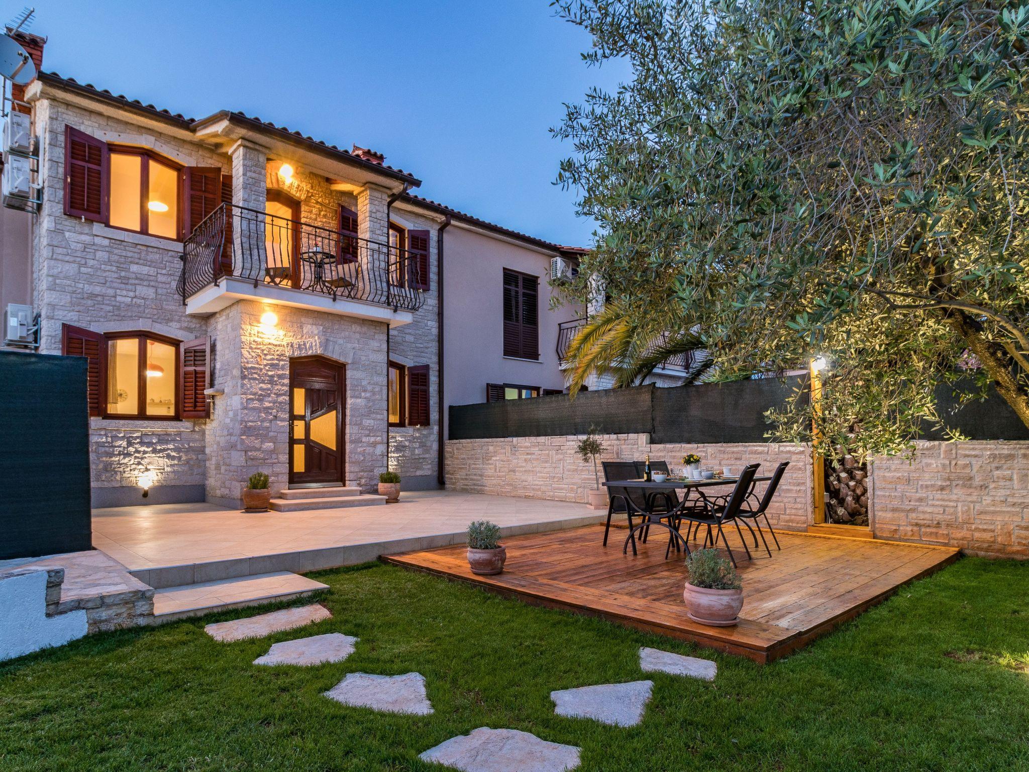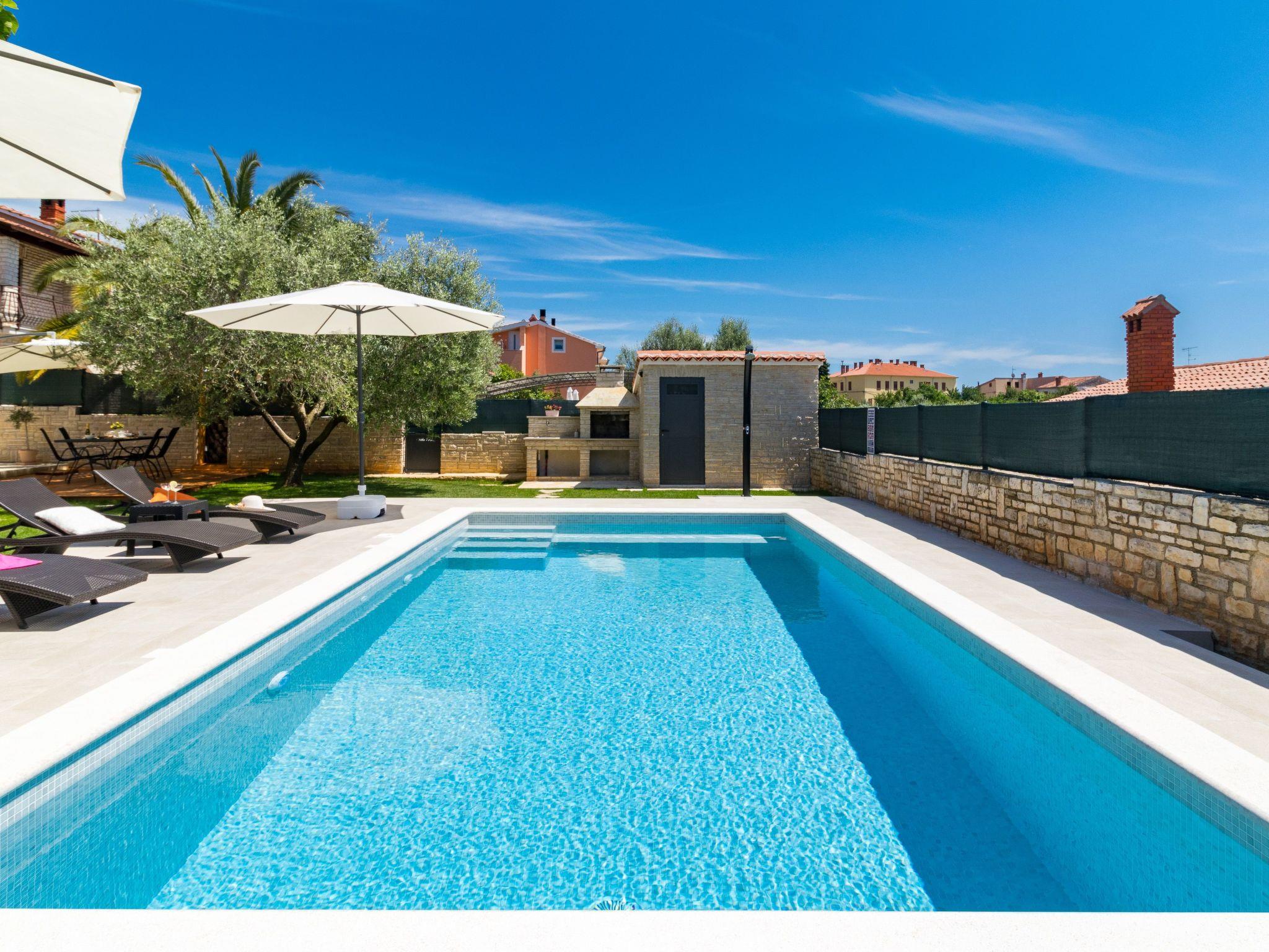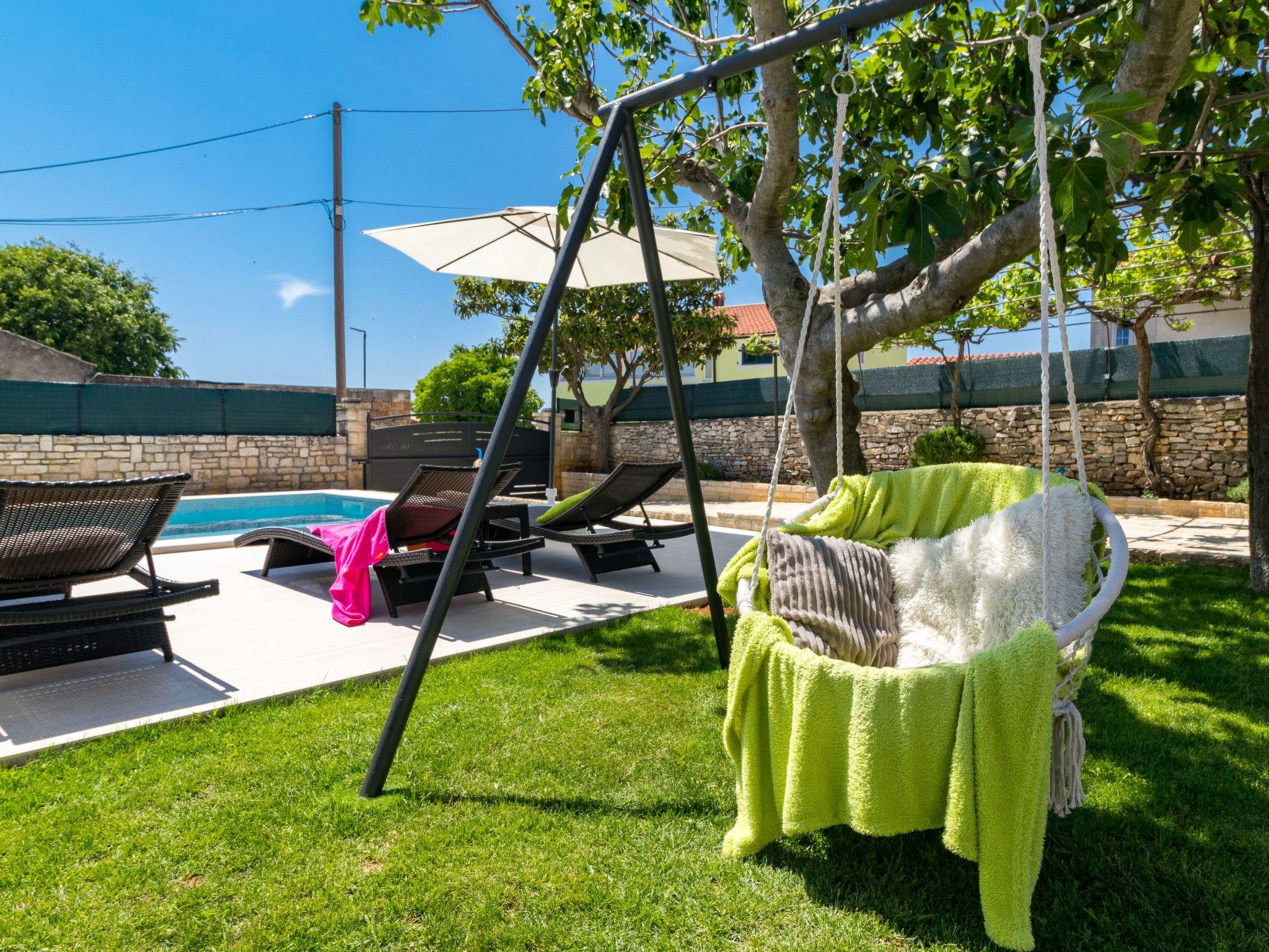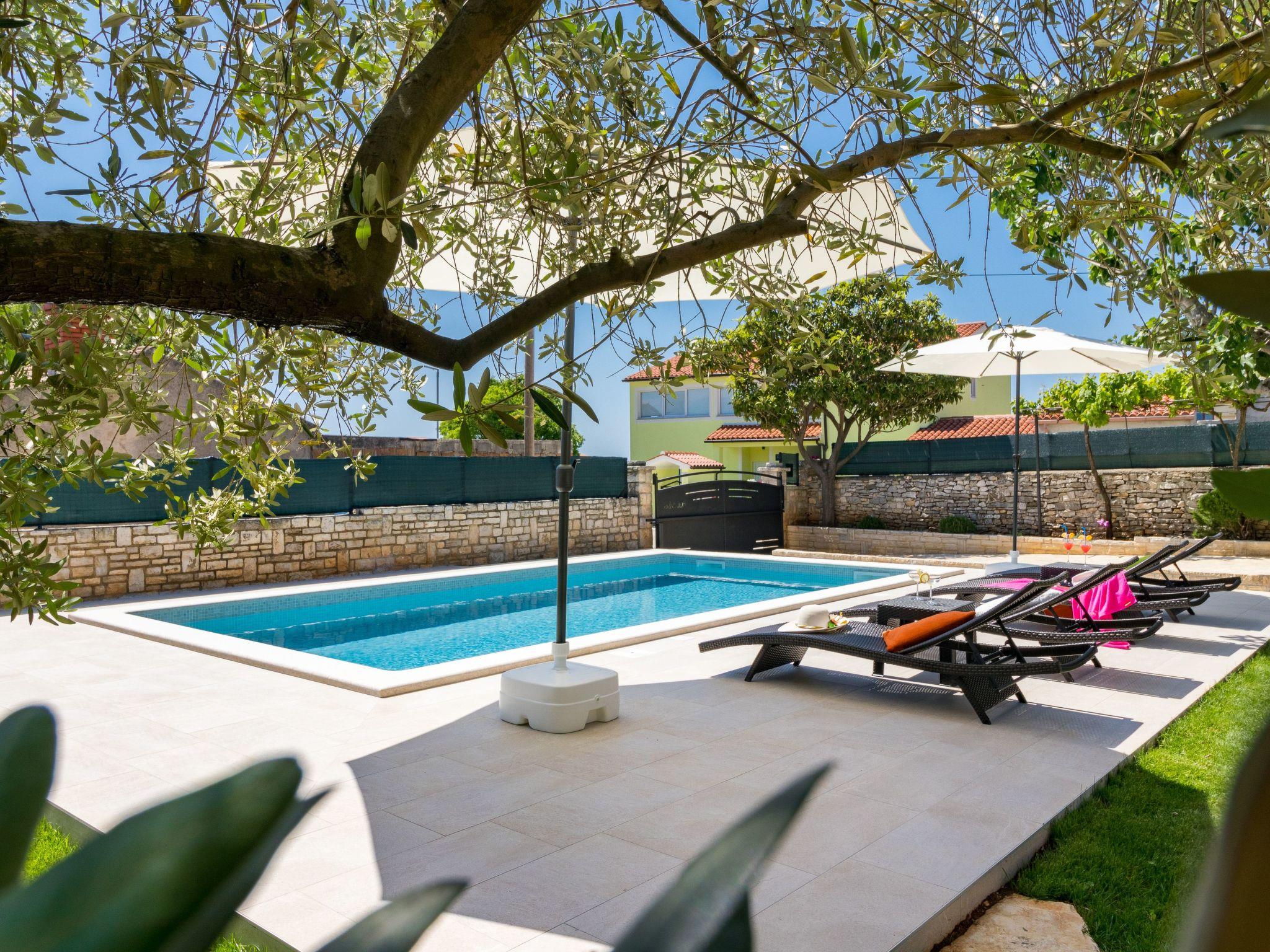 From the bedroom on the upper floor, you step out onto the balcony, which overlooks the garden and from which you can enjoy the view of the island of Brijuni and the sea. From the living room you can access the terrace, which is furnished with a table and chairs and a barbecue for al fresco dining. Adjacent to this is the large garden, where you will find the approx. 3.5 x 7 metre pool with a depth of approx. 1.3 metres. On the enclosed plot in front of the house there is another terrace, as well as the two parking spaces, which are for your private use. 1-3 pets are allowed on request.