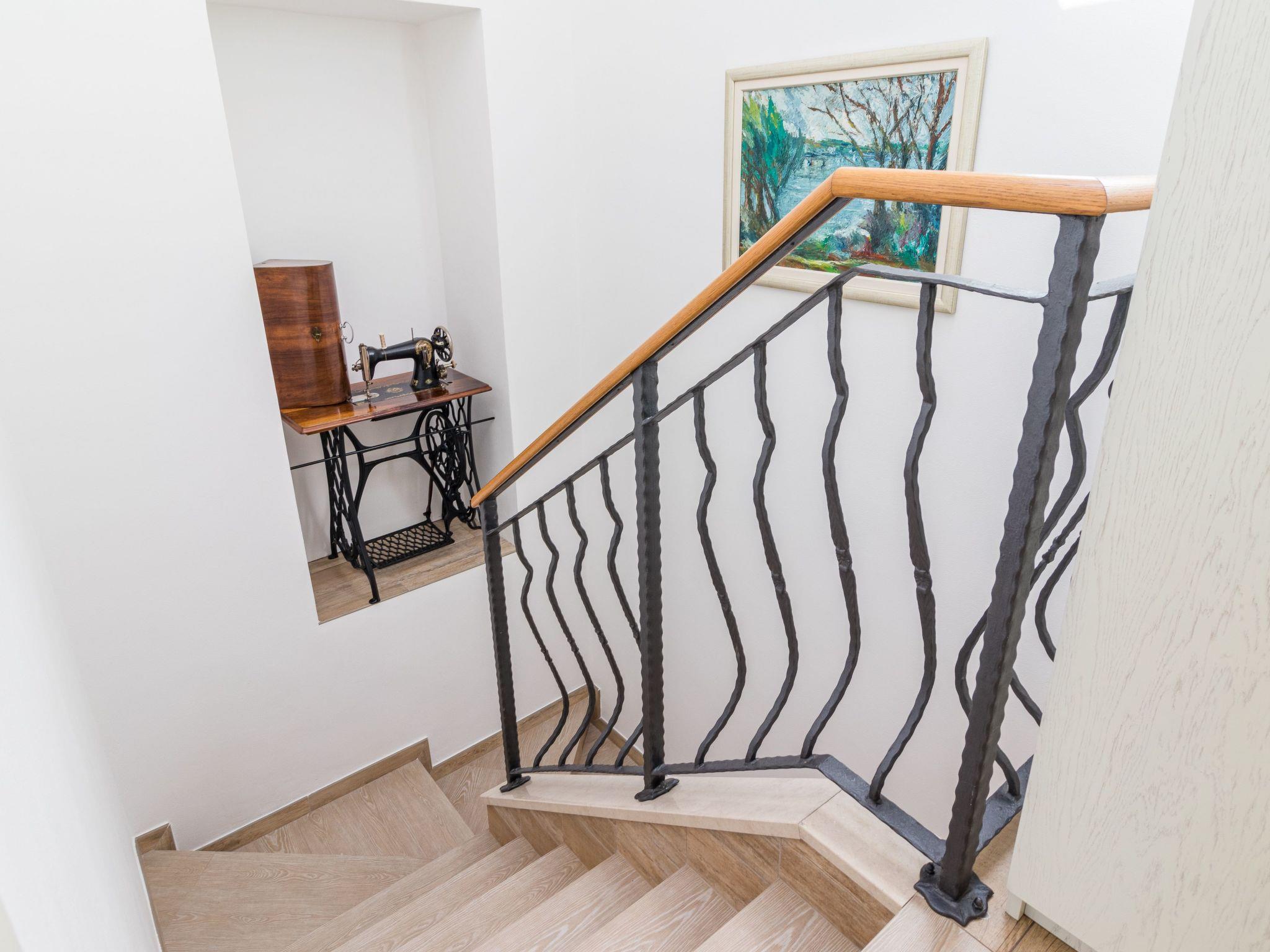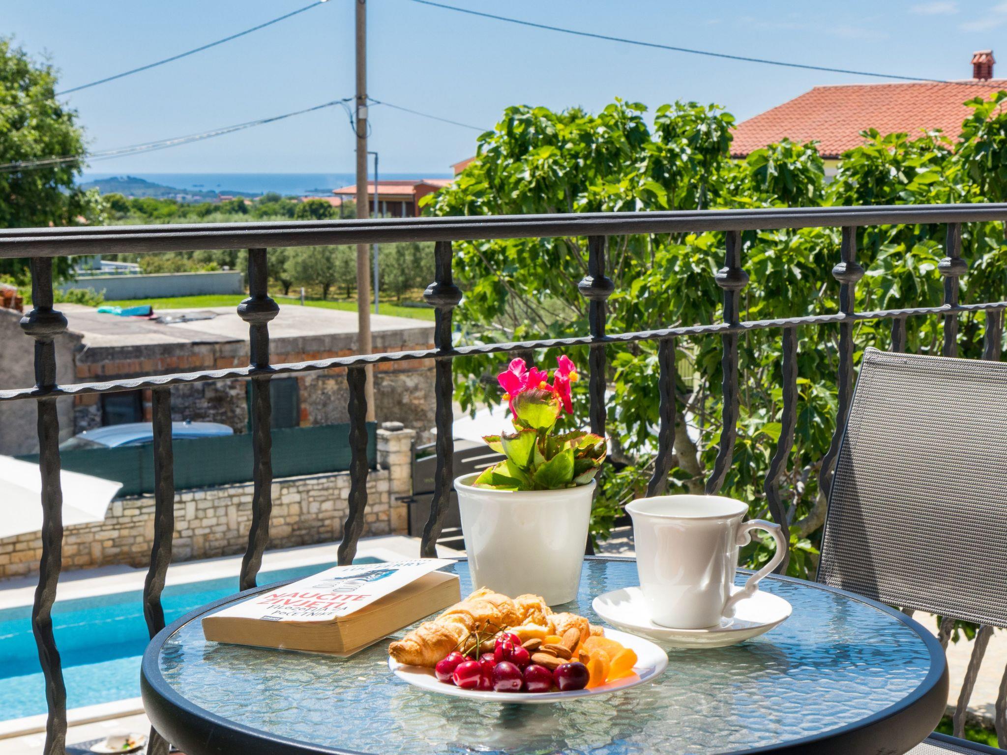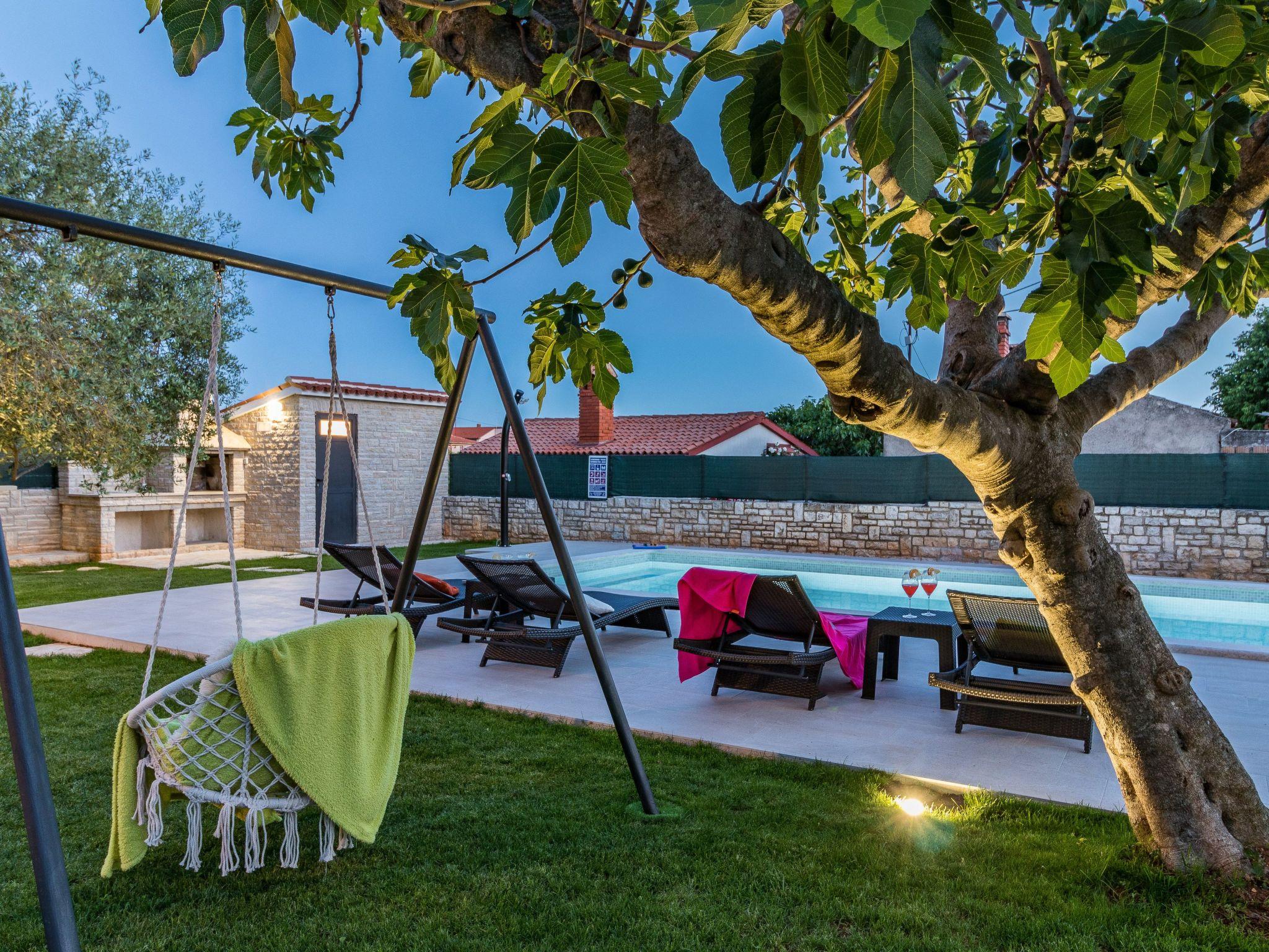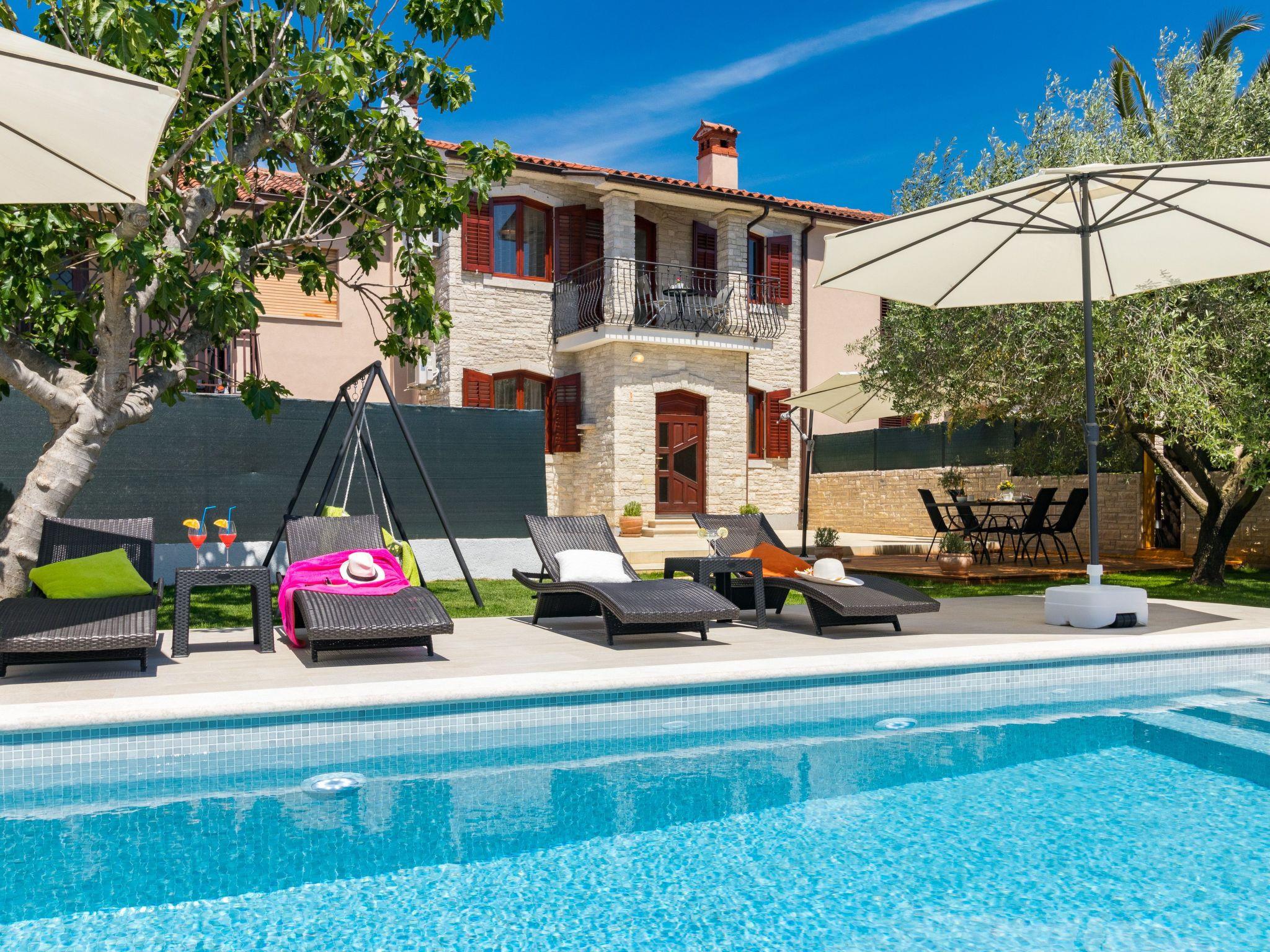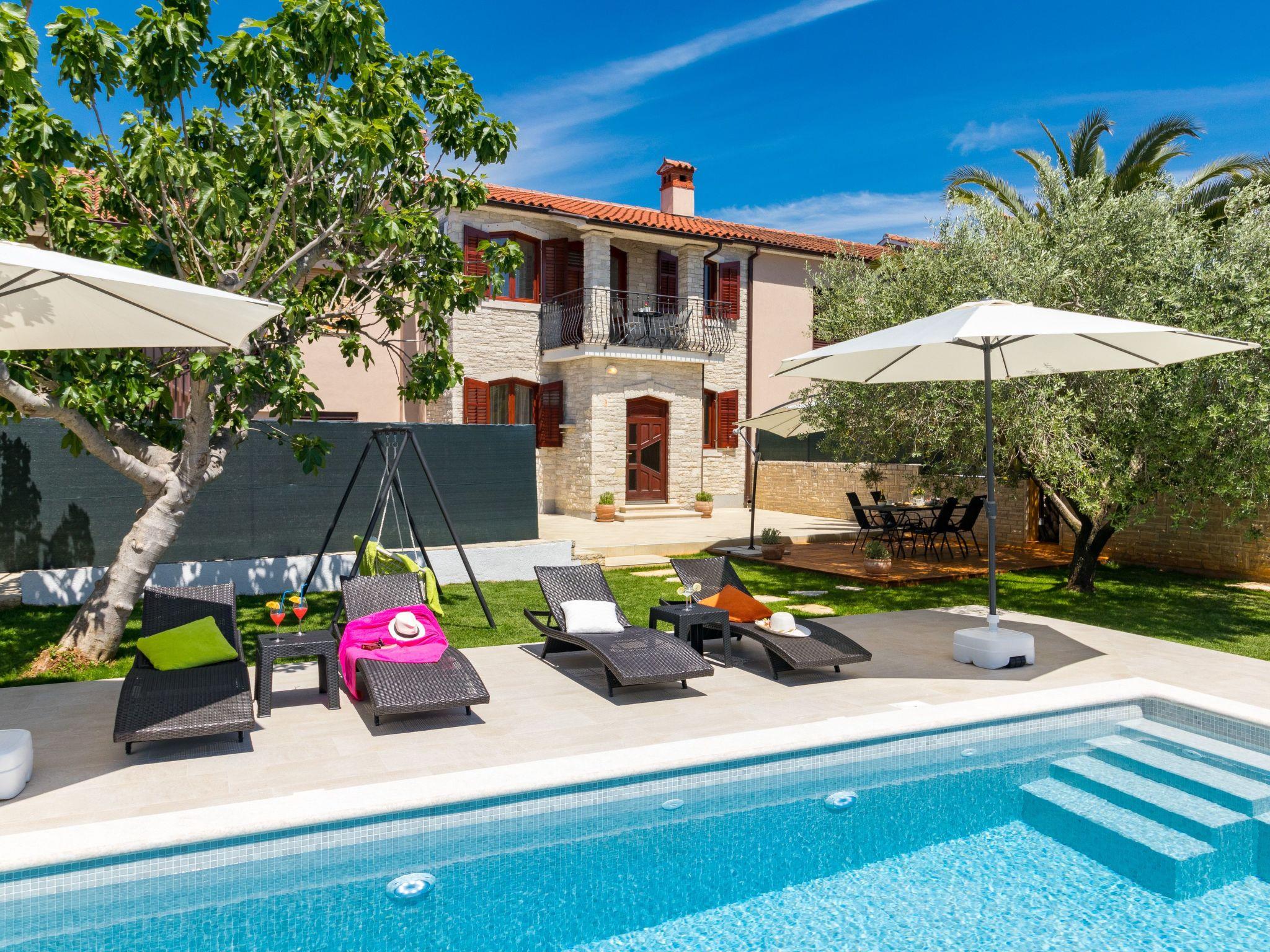 From the bedroom on the upper floor, you step out onto the balcony, which overlooks the garden and from which you can enjoy the view of the island of Brijuni and the sea. From the living room you can access the terrace, which is furnished with a table and chairs and a barbecue for al fresco dining. Adjacent to this is the large garden, where you will find the approx. 3.5 x 7 metre pool with a depth of approx. 1.3 metres. On the enclosed plot in front of the house there is another terrace, as well as the two parking spaces, which are for your private use. 1-3 pets are allowed on request.