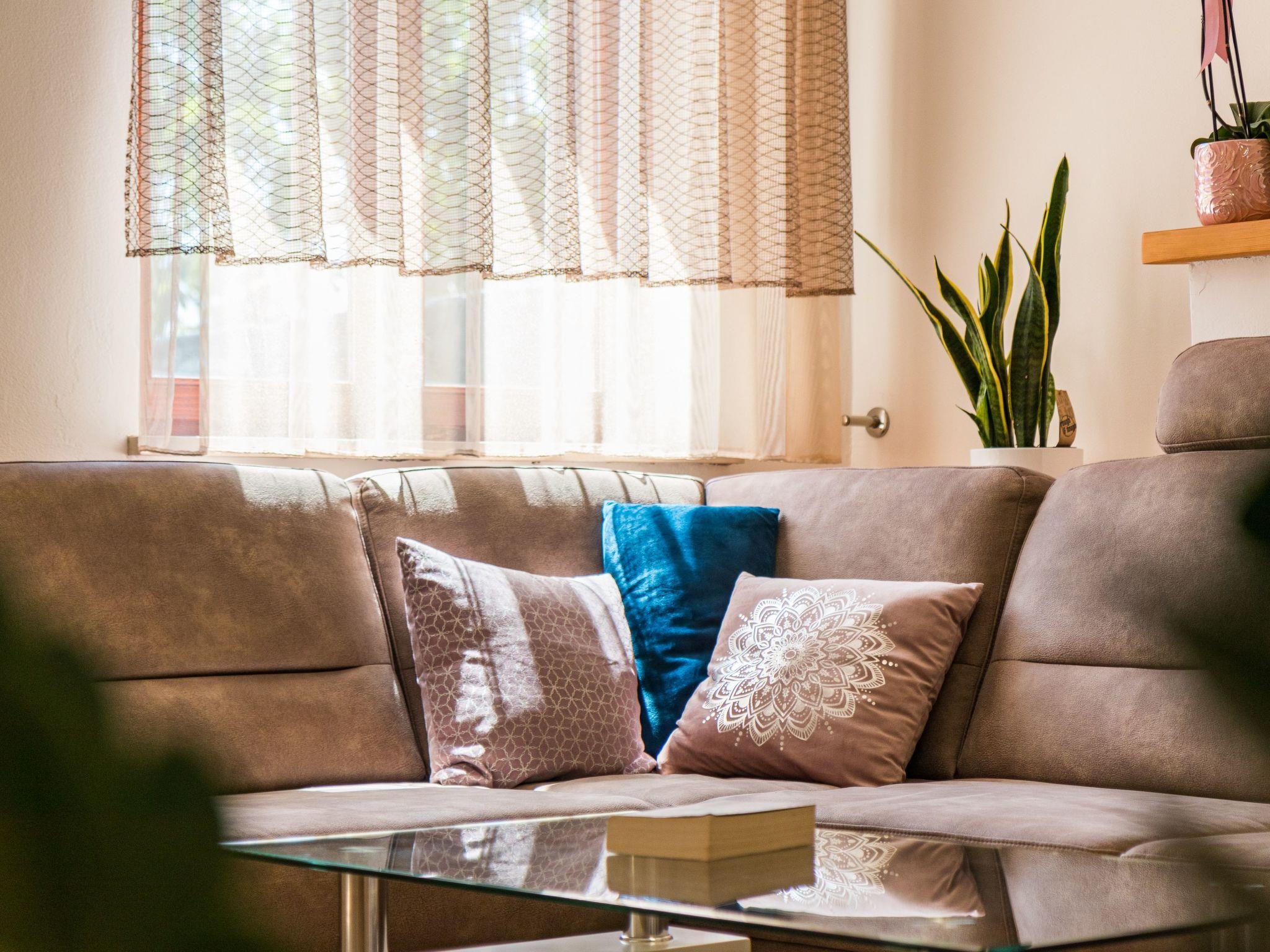 The air-conditioned holiday home on the ground floor has 80m² of living space spread over two floors. The large living room is furnished with a cosy corner sofa and a flat-screen TV with satellite channels. The fold-out sofa here can also be used as a bed (1.60 x 2m). The open-plan kitchen is separated by a breakfast bar and has a fridge with freezer compartment, gas hob, oven and all important electrical appliances such as microwave, kettle, toaster and coffee machine. There is also a guest WC. Upstairs you will find two bedrooms, one of which is furnished with a double bed (1.80m wide) and the other with two single beds (each 90cm wide). The owner will be happy to provide you with a baby cot and a high chair free of charge. The large bathroom is equipped with towel heating, a large washbasin and a walk-in shower, WC, bidet and hairdryer. A washing machine is also available. WLAN is available free of charge throughout the house.