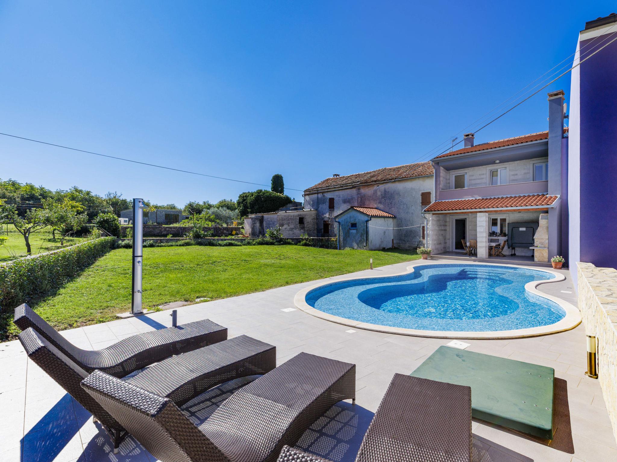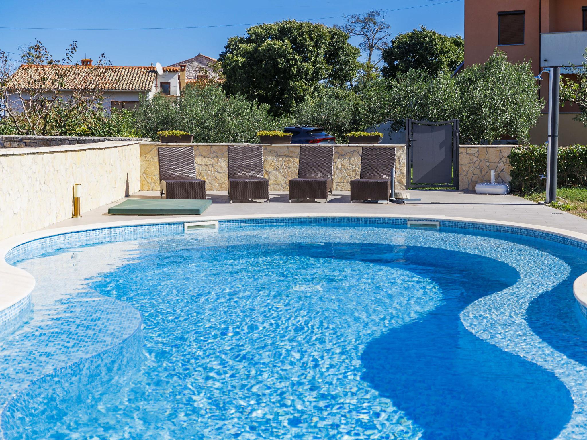 Krnica 22 km from Pula: Beautiful terraced house "Mario 2", 2 storeys. In the hamlet Bratulici 5 km from the centre of Krnica, in a quiet, sunny position, 7 km from the sea. Private: property 200 m2 (fenced), swimming pool (50 m2, depth 140 cm, seasonal availability: 02.May. - 26.Sep.) with internal staircase. Unconventional pool shape. Garden furniture, barbecue. In the house: internet access, central heating system, washing machine. Roofed, parking (for 2 cars) at the house on the premises. Shop 2 km, restaurant 100 m, bus stop 1.3 km, pebble beach 10 km, rocky beach 7 km. Tennis 10 km, riding stable 3 km.