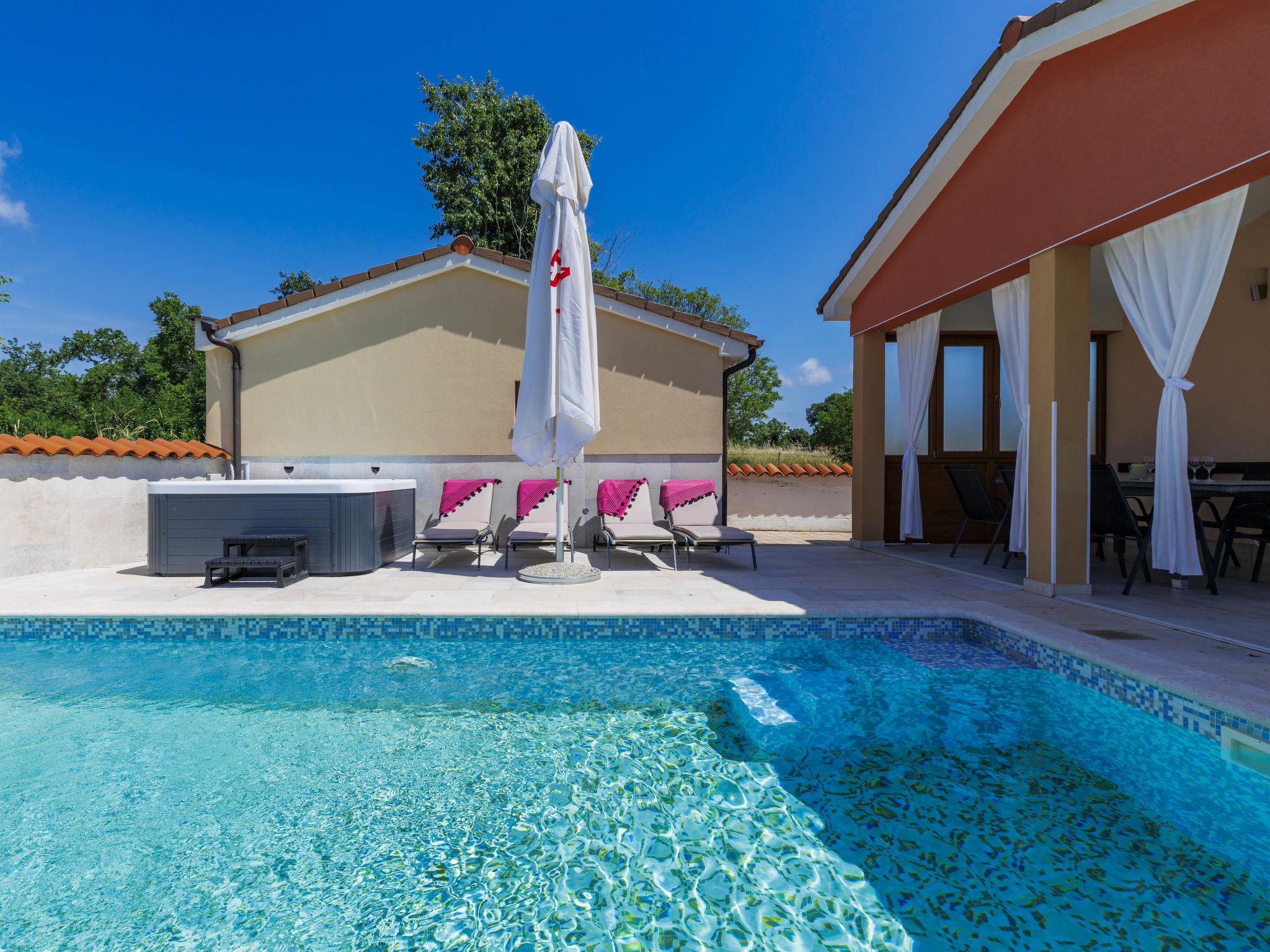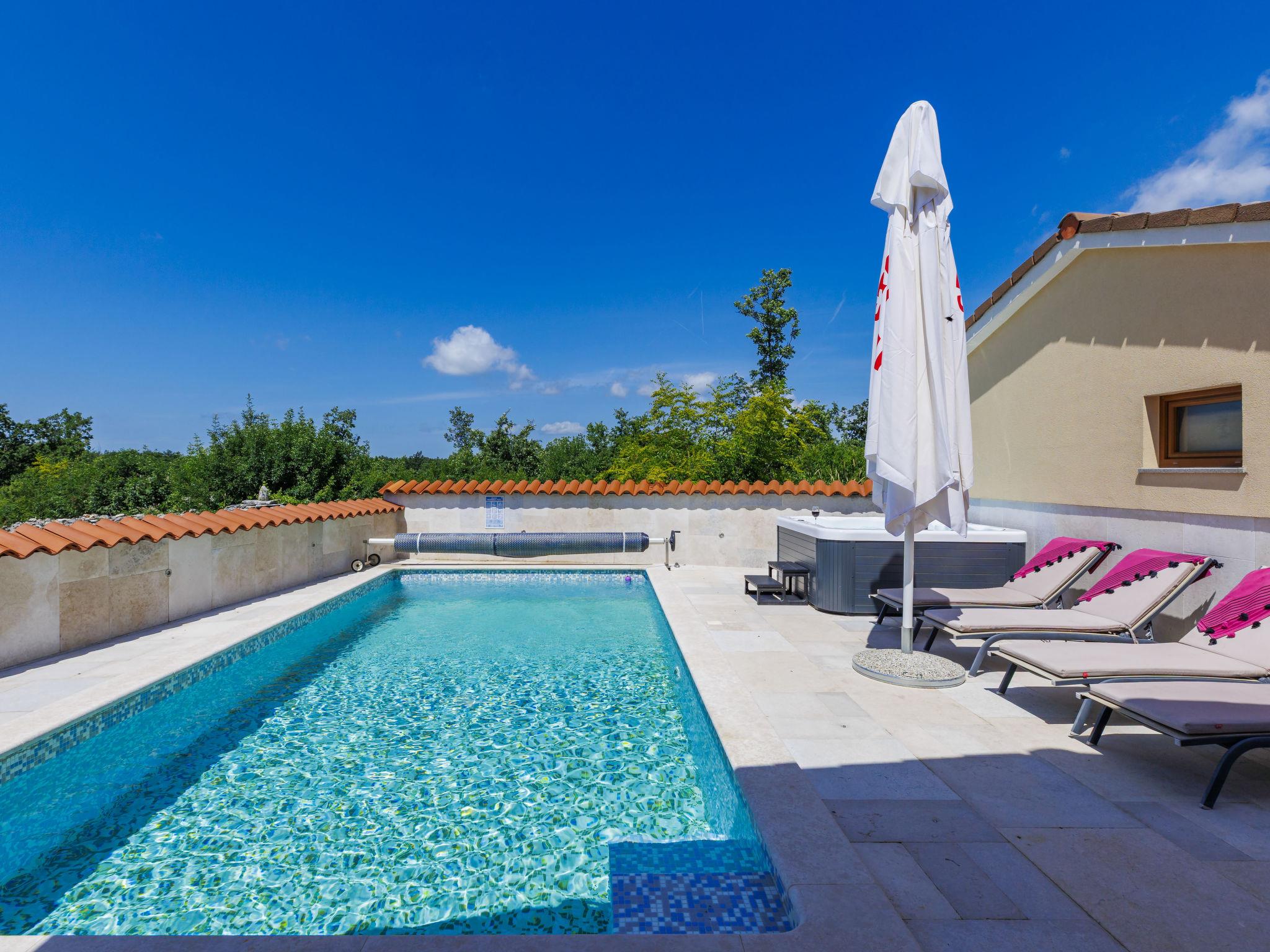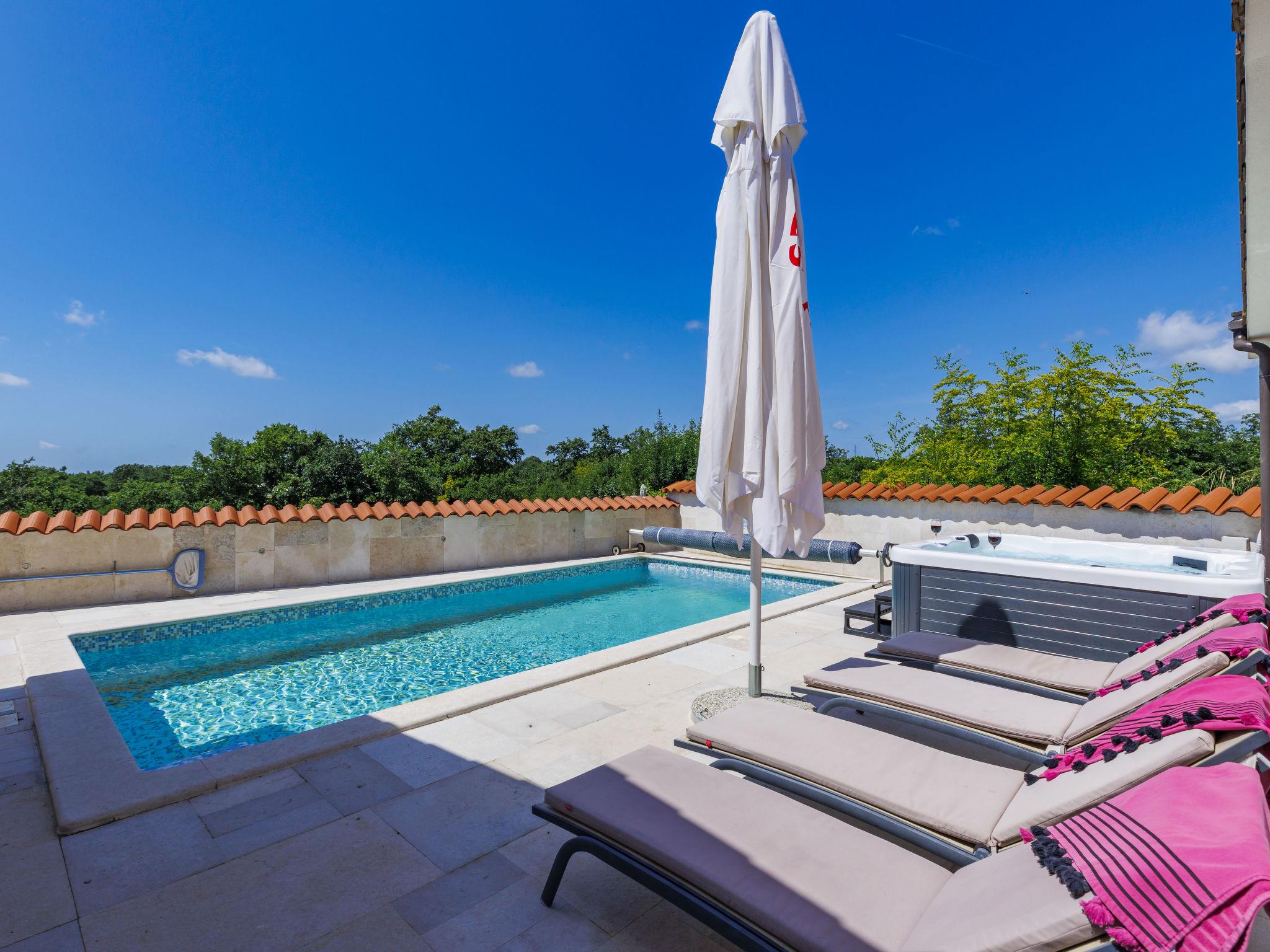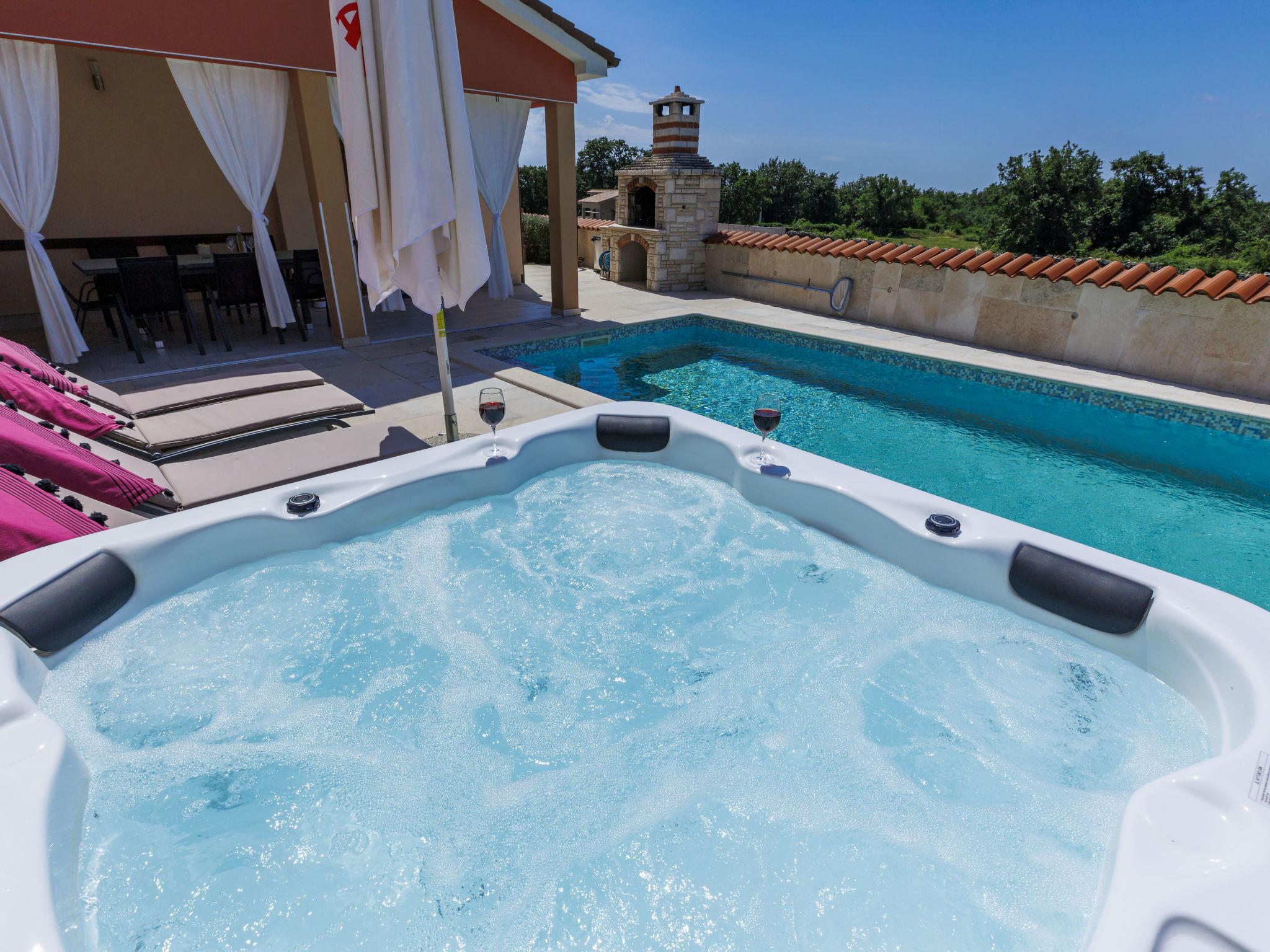 15 km from Pula: Cosy single-family house "Manera". In the hamlet Krvavici 3 km from the centre of Marcana, in a sunny position, 10 km from the sea. Private: property 400 m2 (fenced), small garden with lawn, swimming pool angular, heated (8 x 4 m, depth 140 cm, seasonal availability: 01.Mar. - 01.Dec.) with internal staircase. Outdoor shower, hot tub, terrace (20 m2), barbecue, pool maintenance by the owner/gardener. In the house: internet access. Parking (for 4 cars) at the house on the premises. Shop 3 km, restaurant 3 km, bus stop 3 km, pebble beach 10 km, rocky beach 10 km.