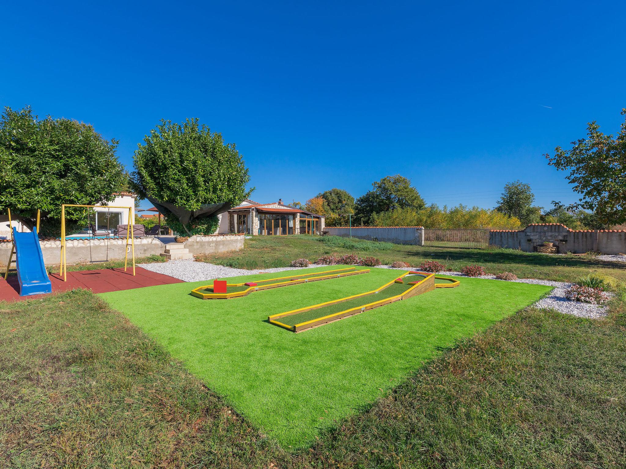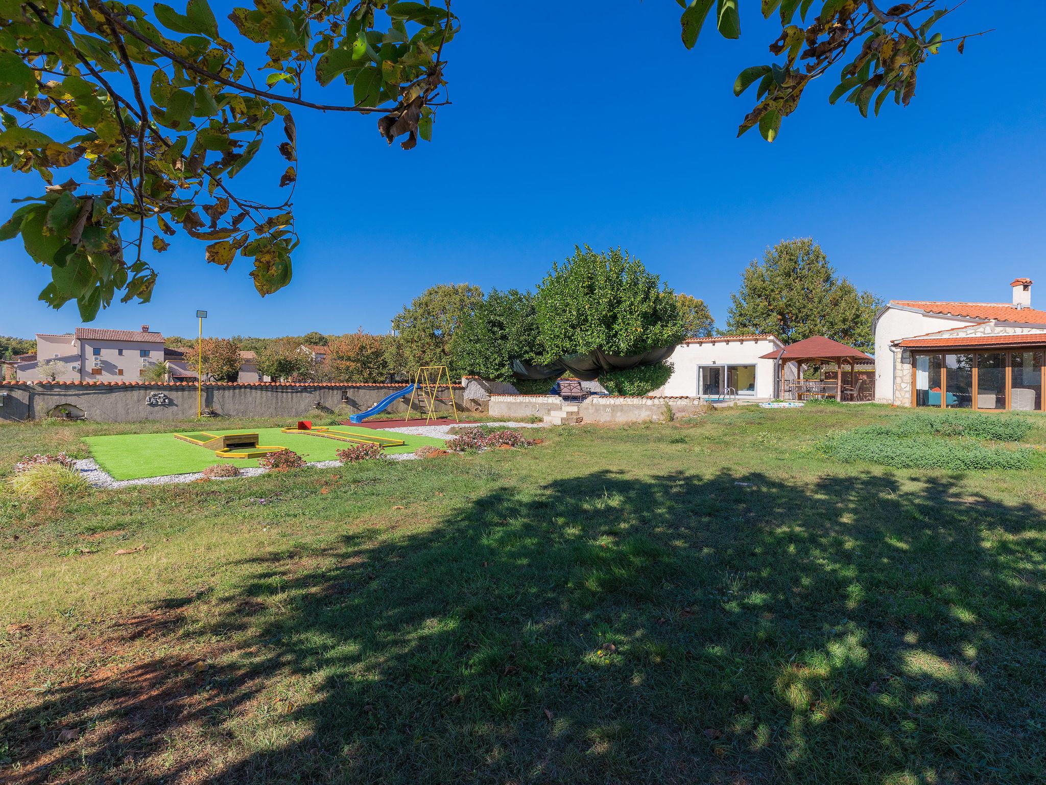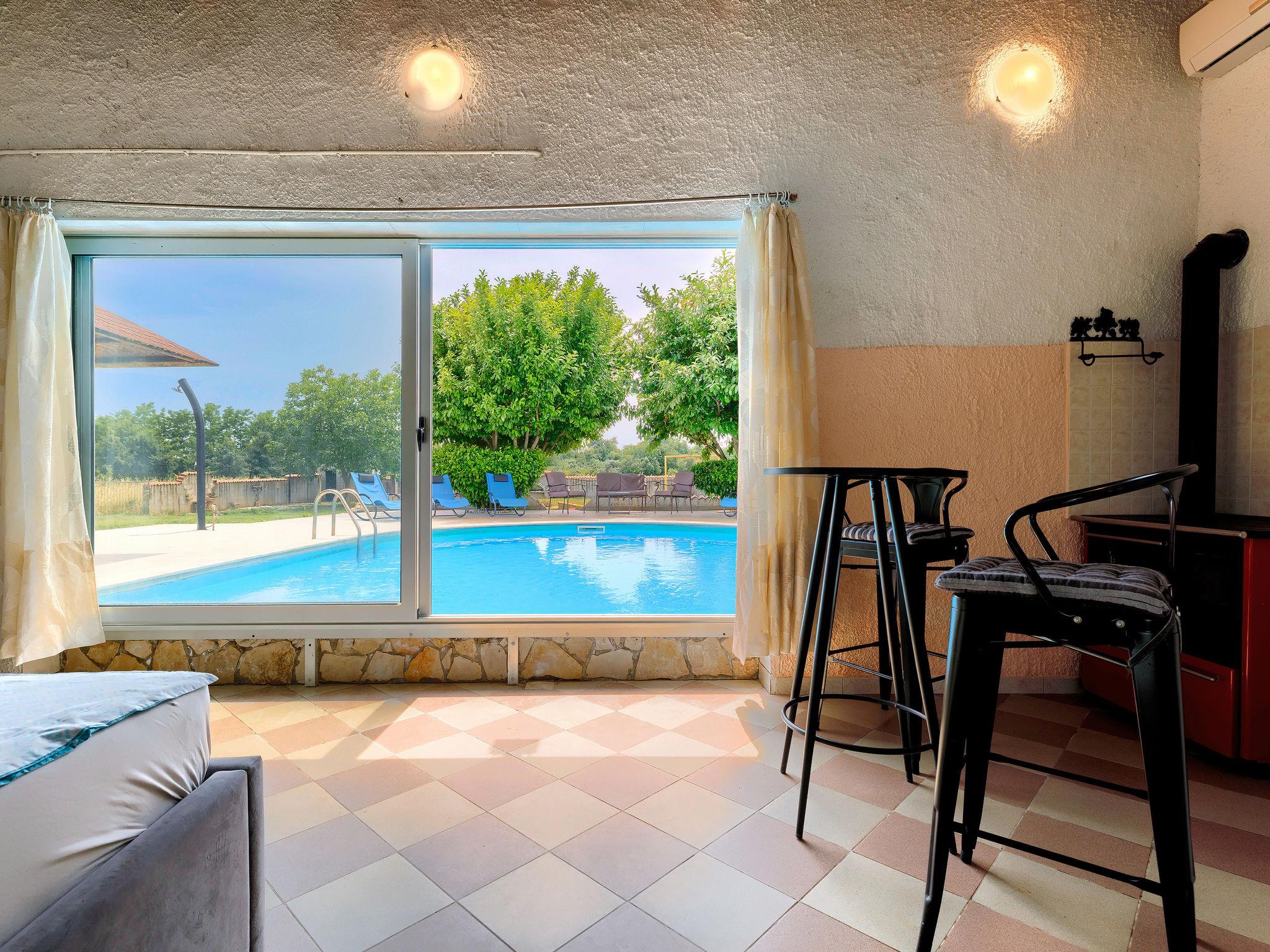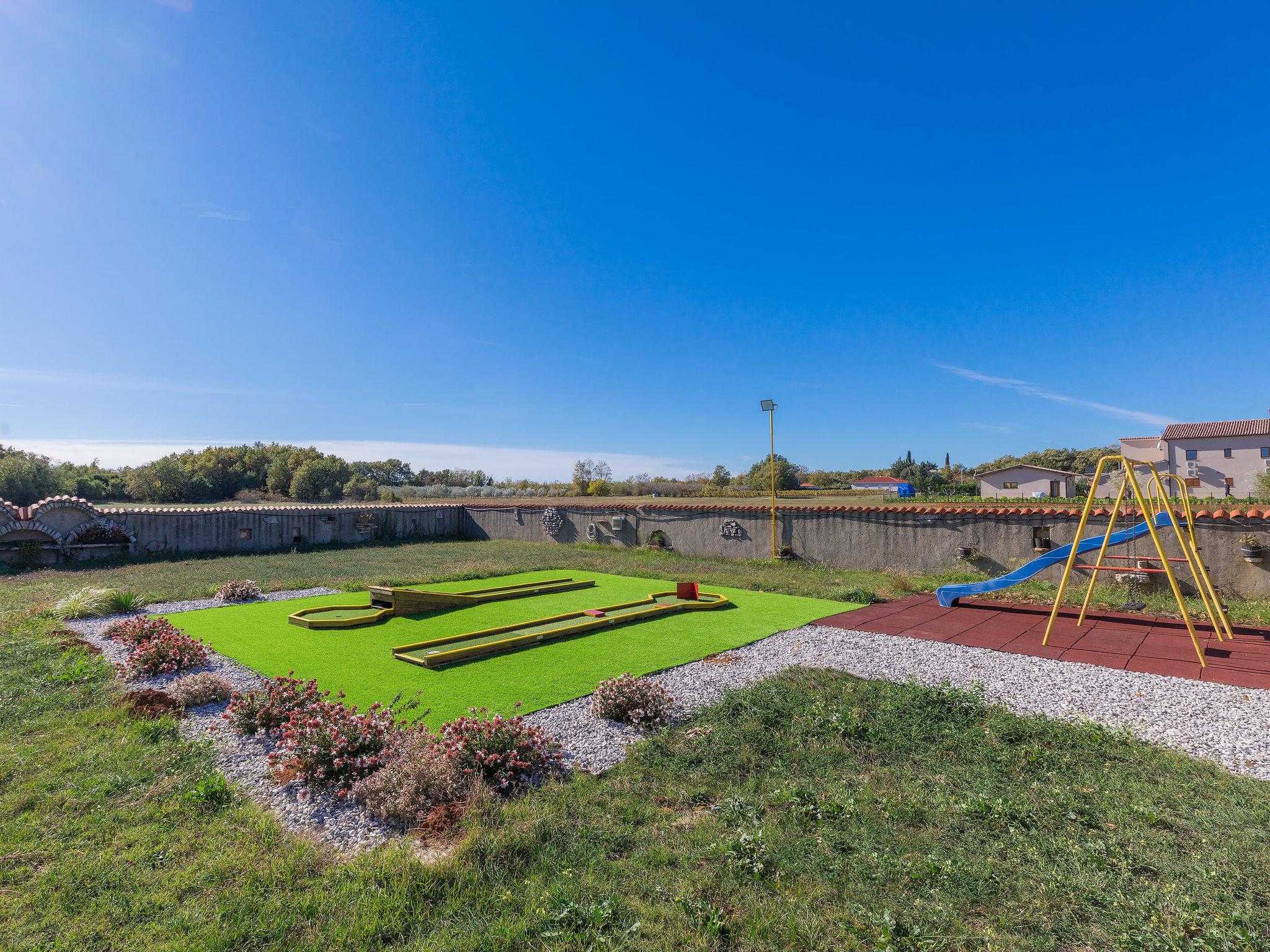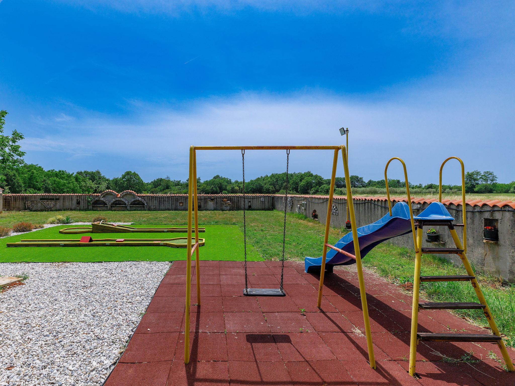 House "Jadranka", 2 storeys. Property composed of main house and outbuilding, in the hamlet Radeki-Glavica 6 km from the centre of Marcana, 10 km from the centre of Pula, 20 km from the centre of Medulin, 15 km from the sea. Private: property 1'300 m2 (fenced) with lawn and trees, swimming pool (46 m2, depth 150 cm, seasonal availability: 13.May. - 30.Sep.). Unconventional pool shape. Outdoor shower, arbour, terrace, garden furniture (slide, swing). In the house: internet access, washing machine. Motor access to the house (100 m via unmade road). Parking (for 3 cars) at the house. Shop 2.5 km, supermarket 10 km, restaurant 6 km, bus stop 2 km, pebble beach 15 km. Marina 15 km, minigolf 20 m. Please note: airfield 3 km from the property. The unit consists of a bungalow and the main house rented as one unit.