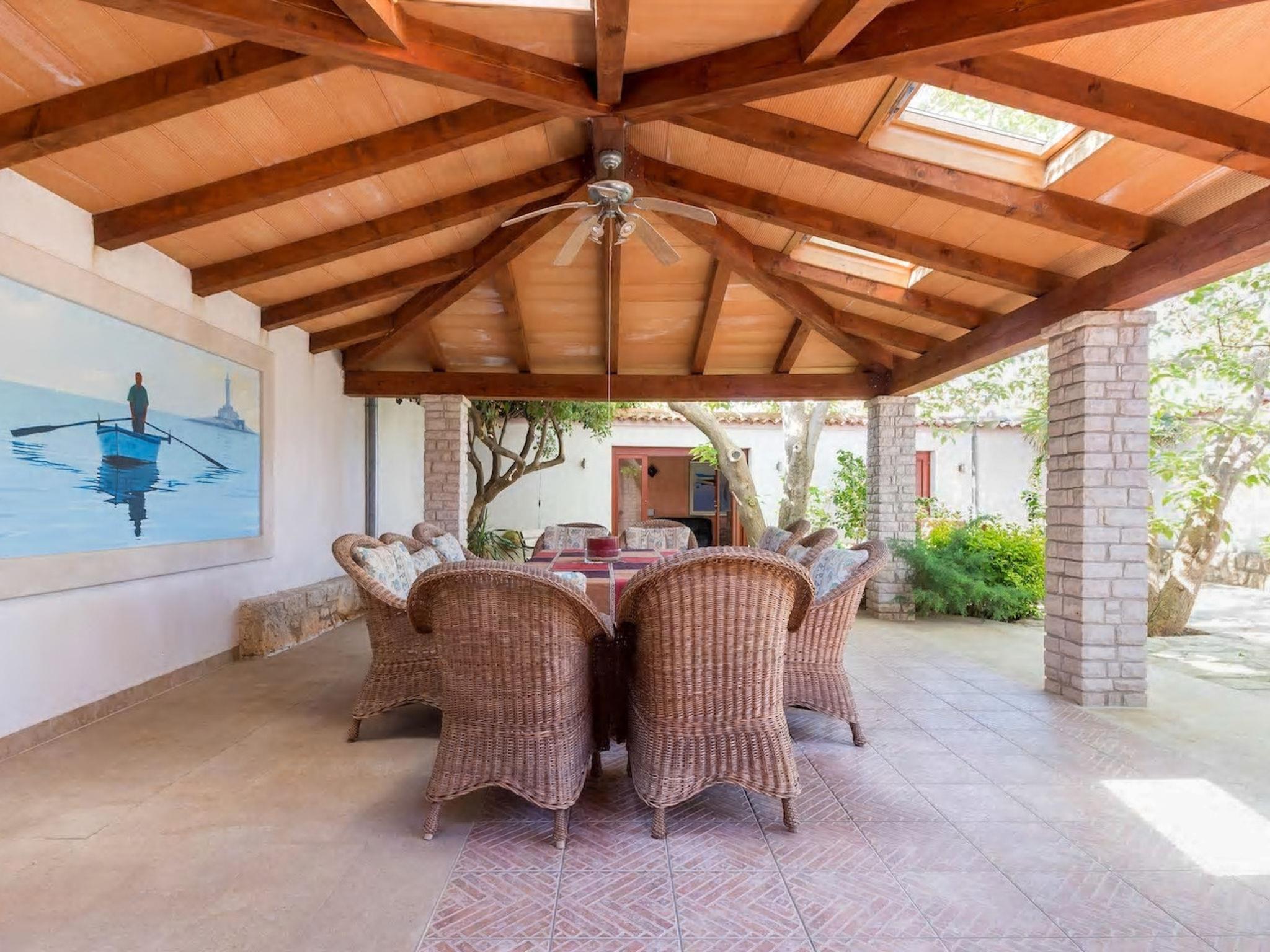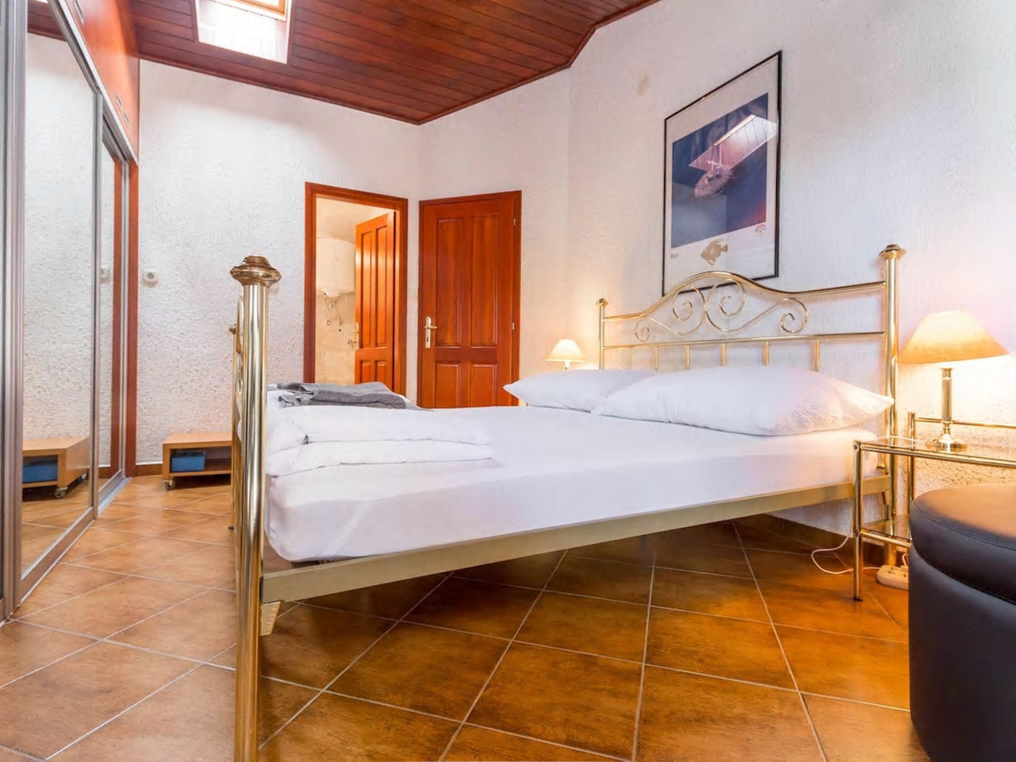 3-room house 90 m2, on the ground floor. Entrance hall with air conditioning. 1 room 12 m2 with 1 french bed (160 cm, length 200 cm), satellite TV. 1 room 10 m2 with 2 beds (90 cm, length 200 cm). Kitchenette (2 ceramic glass hob hotplates, kettle, freezer, electric coffee machine). Shower/WC. No heating option. Terrace 50 m2, roofed. Terrace furniture, deck chairs (4). Outdoor kitchen (2 gas rings, refrigerator, freezer).