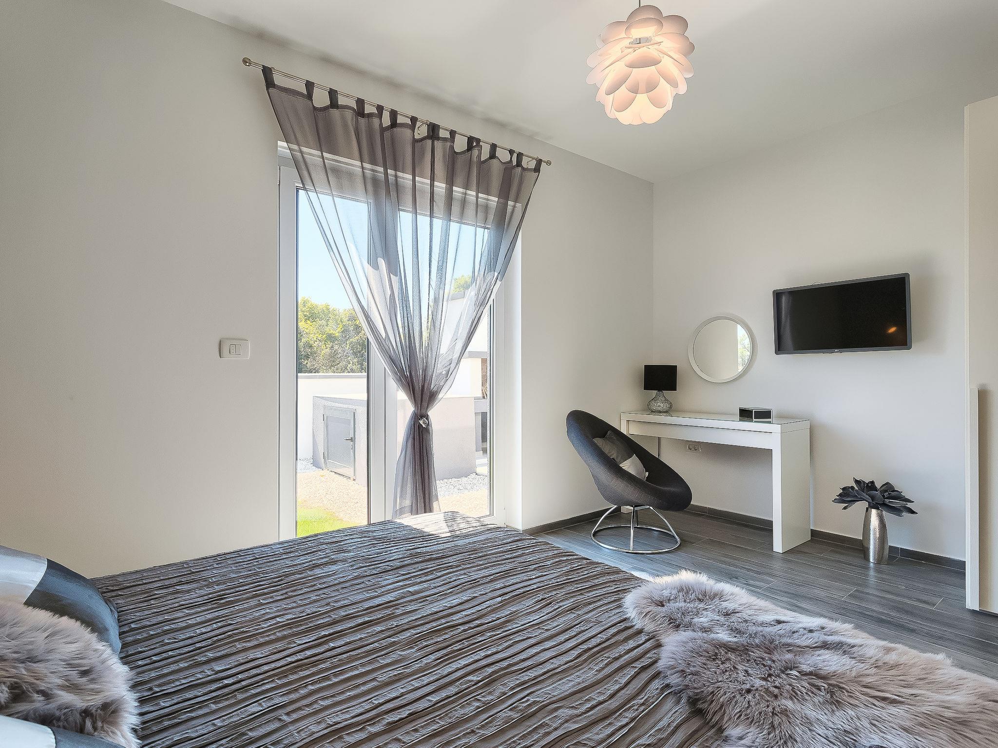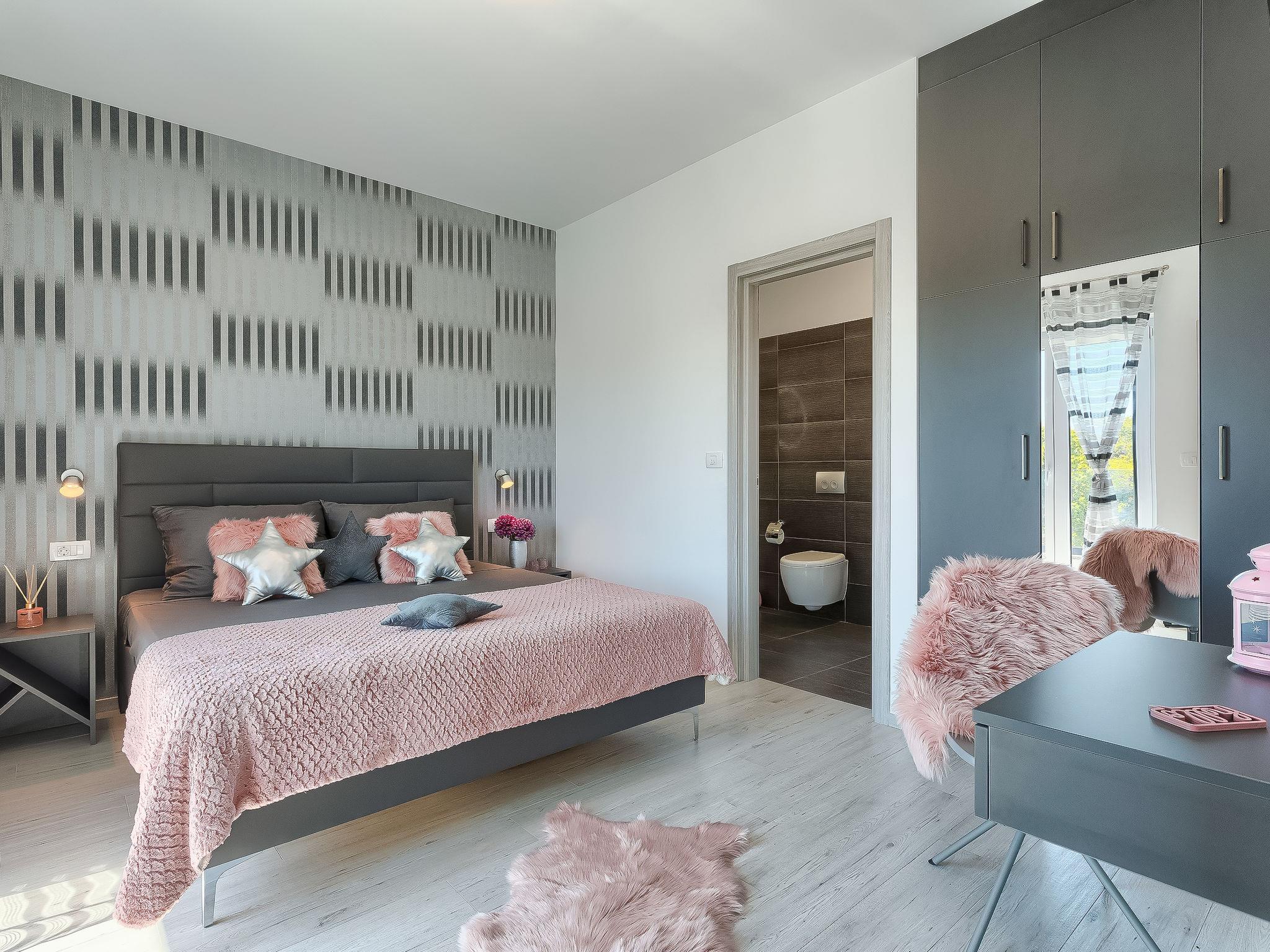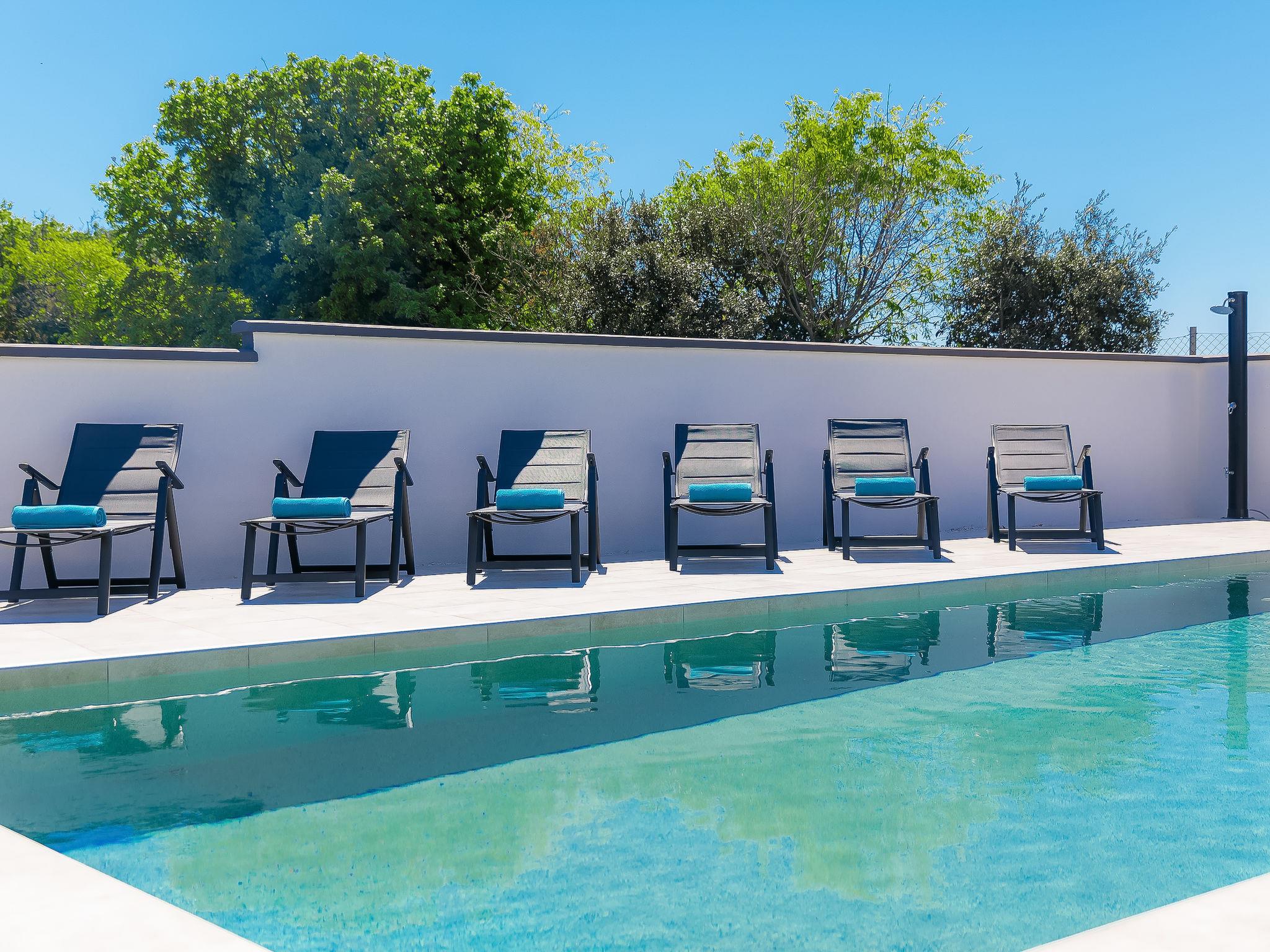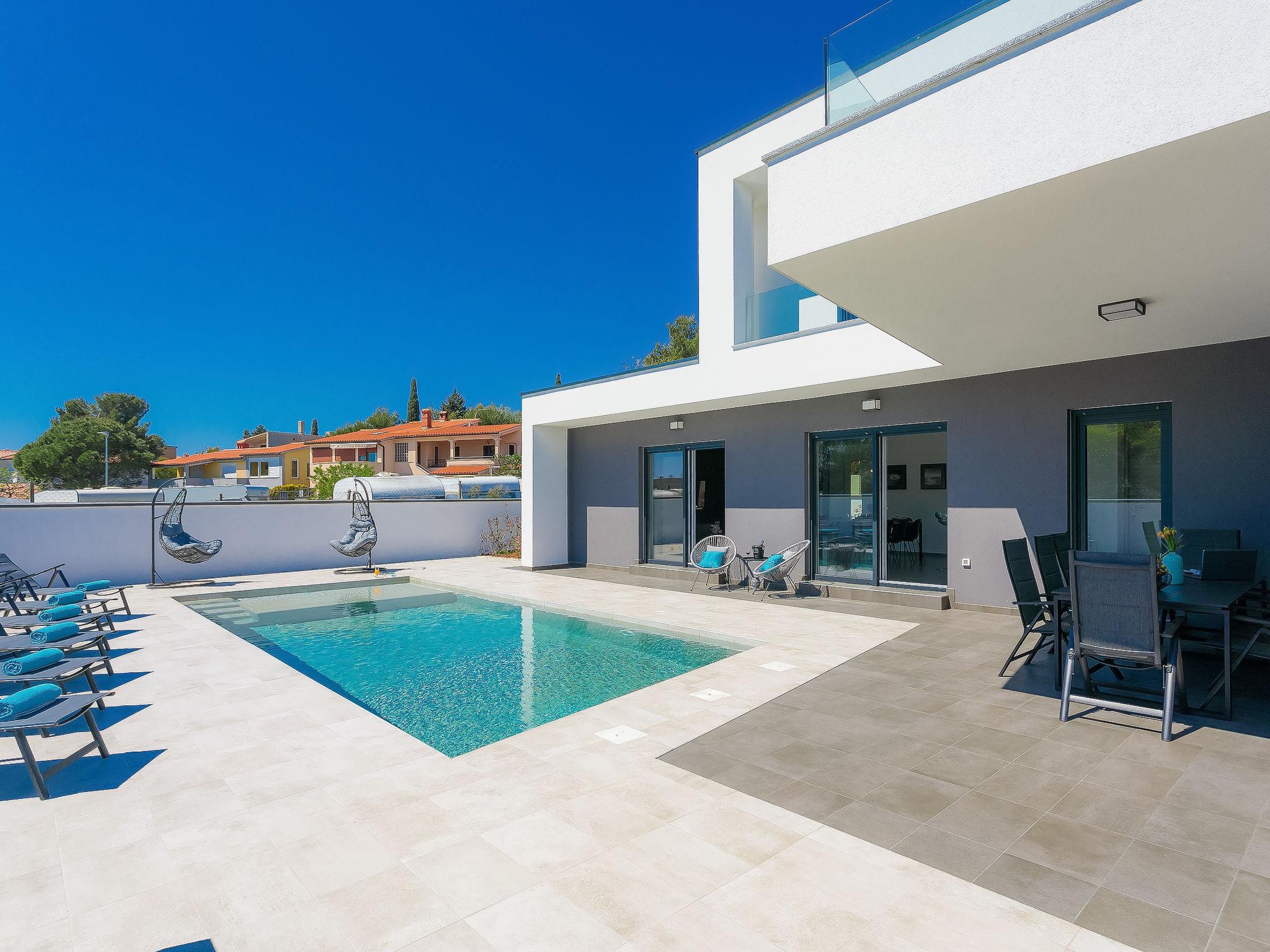 Premantura 11 km from Pula: Beautiful villa "Ella Premantura", 2 storeys, built in 2018. 250 m from the centre of Premantura, in a sunny position, 500 m from the sea, 500 m from the beach. Private: property 600 m2 (fenced), beautiful garden with lawn, swimming pool angular (8 x 4 m, depth 140 cm, seasonal availability: 04.Apr. - 10.Oct.) with internal staircase. Outdoor shower, barbecue. In the house: internet access, washing machine. Parking (for 2 cars) at the house on the premises. Shop 250 m, supermarket 4.5 km, restaurant 50 m, bus stop 220 m, pebble beach 2.5 km, rocky beach 500 m. Surf school 2.5 km, tennis 750 m, riding stable 10 km, walking paths from the house 100 m, cycle lane 150 m. Nearby attractions: Nature park Kamenjak 650 m. Groups of teenagers on request only. Neighbourhood highly sensitive to noise. Quietness and good behaviour expected. Swimming pool with hydromassage.