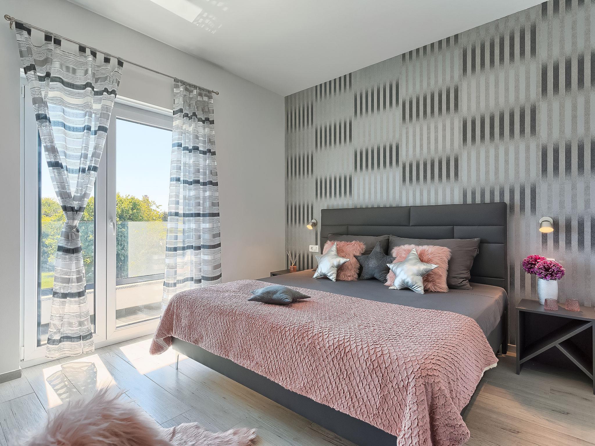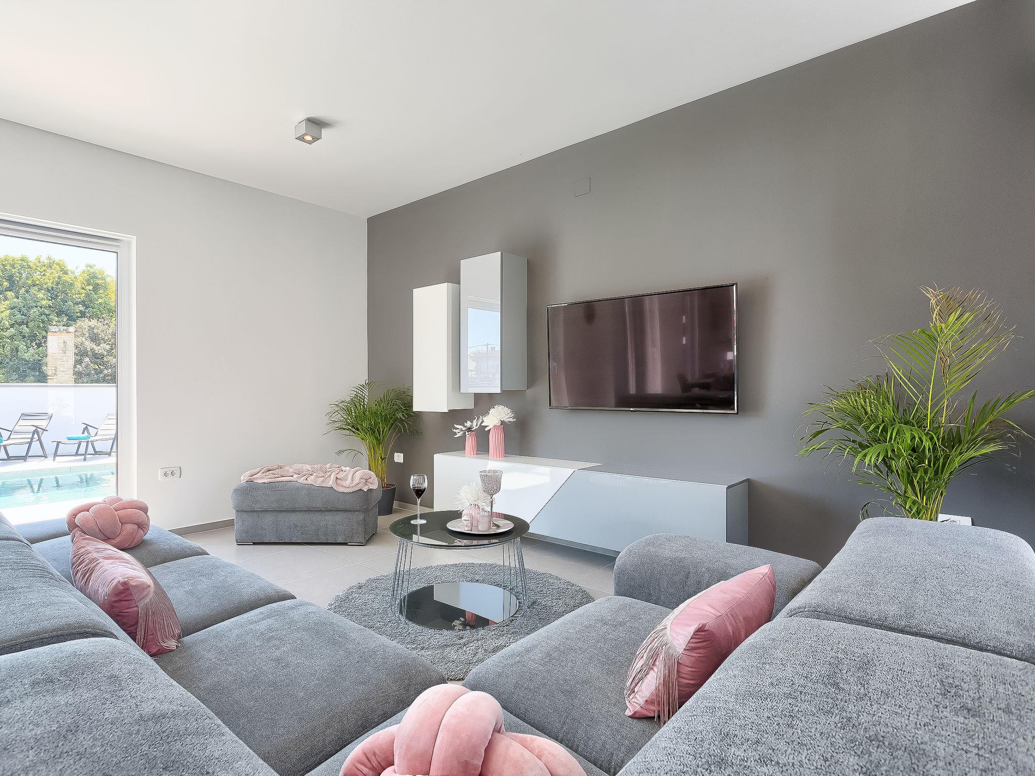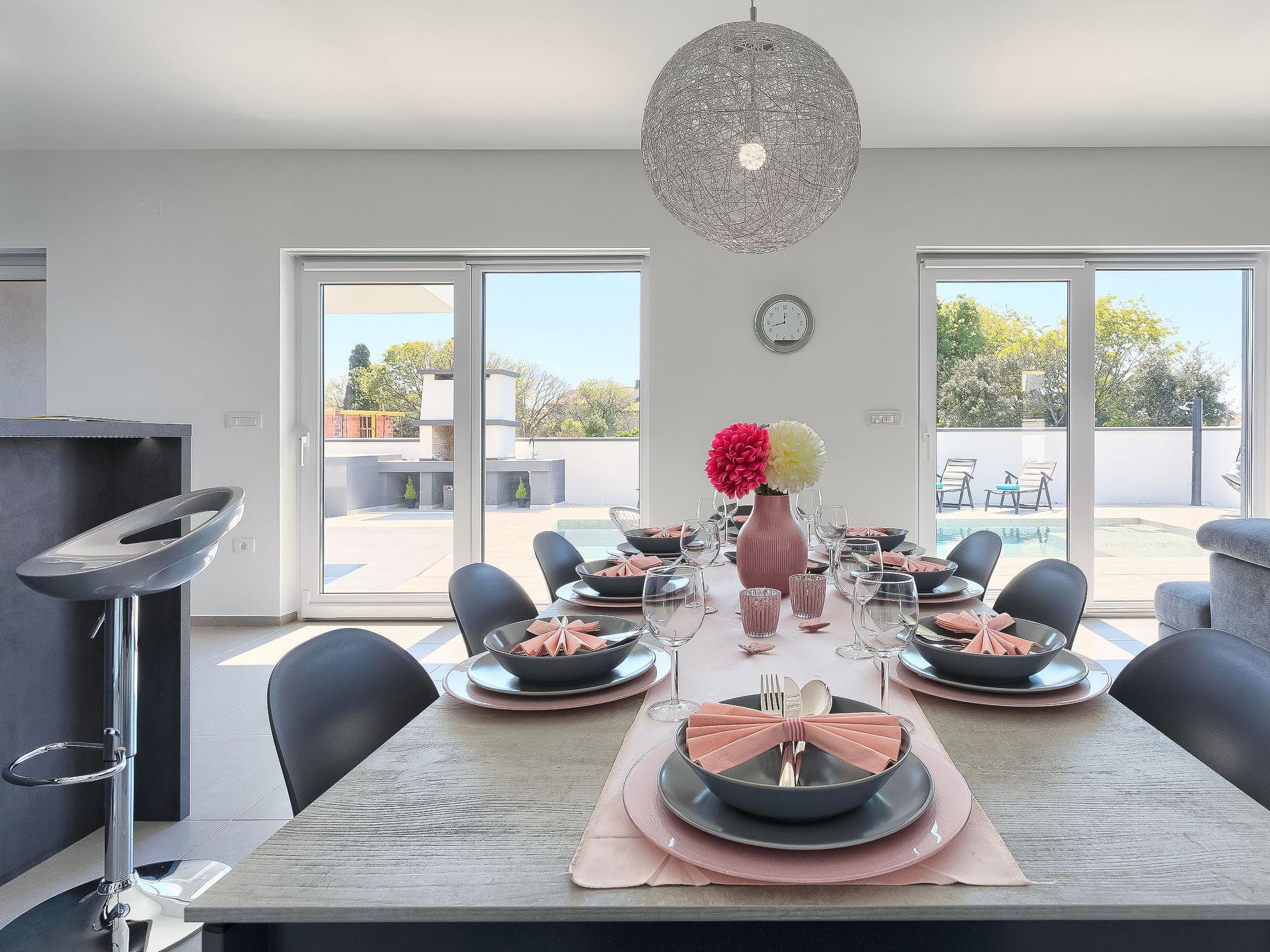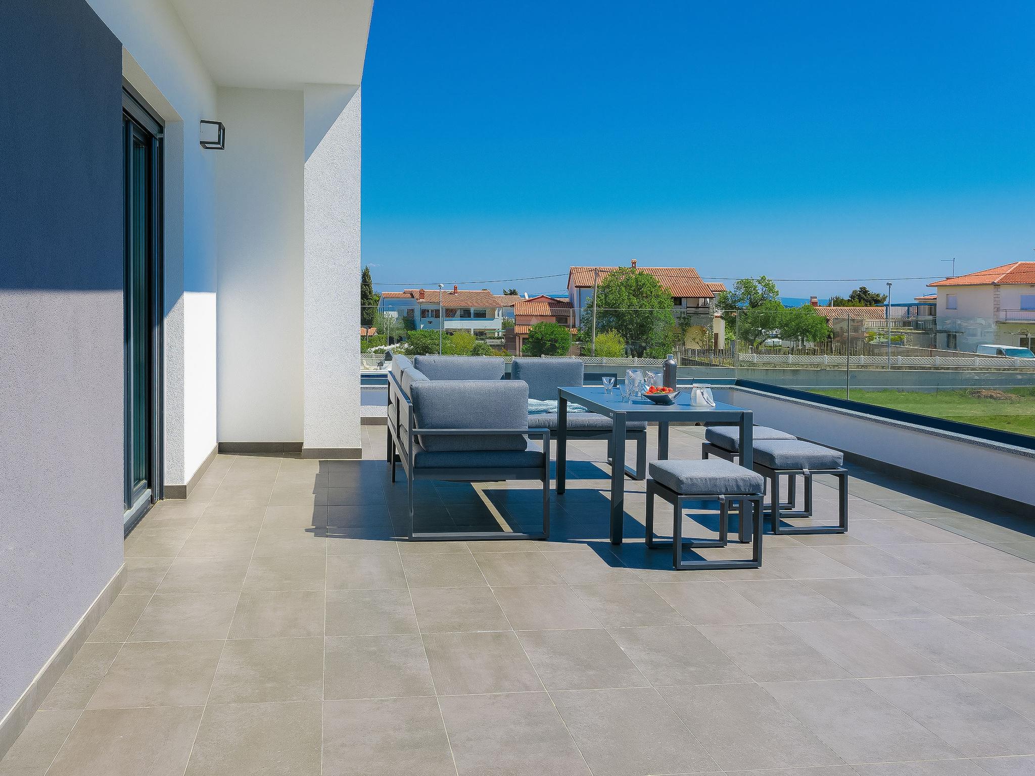 Premantura 11 km from Pula: Beautiful villa "Ella Premantura", 2 storeys, built in 2018. 250 m from the centre of Premantura, in a sunny position, 500 m from the sea, 500 m from the beach. Private: property 600 m2 (fenced), beautiful garden with lawn, swimming pool angular (8 x 4 m, depth 140 cm, seasonal availability: 04.Apr. - 10.Oct.) with internal staircase. Outdoor shower, barbecue. In the house: internet access, washing machine. Parking (for 2 cars) at the house on the premises. Shop 250 m, supermarket 4.5 km, restaurant 50 m, bus stop 220 m, pebble beach 2.5 km, rocky beach 500 m. Surf school 2.5 km, tennis 750 m, riding stable 10 km, walking paths from the house 100 m, cycle lane 150 m. Nearby attractions: Nature park Kamenjak 650 m. Groups of teenagers on request only. Neighbourhood highly sensitive to noise. Quietness and good behaviour expected. Swimming pool with hydromassage.