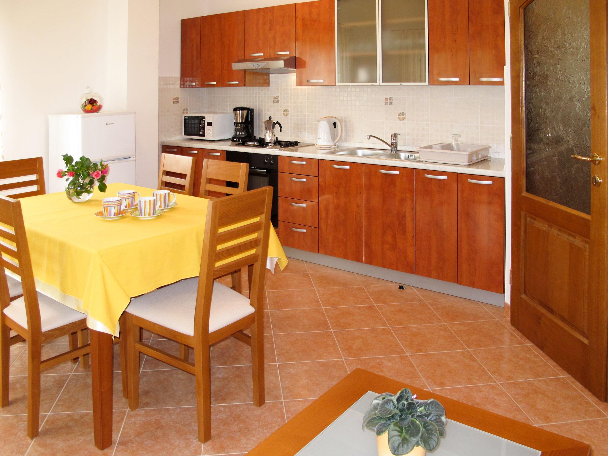 "Martina", 3-room apartment 75 m2, on the ground floor. Living/dining room with 1 double sofabed, satellite TV and air conditioning. Exit to the terrace. 1 room with 1 french bed (160 cm, length 200 cm). 1 room with 1 french bed (160 cm, length 200 cm). Exit to the terrace. Open kitchen (1 hot plate, oven, 3 gas rings, toaster, kettle, microwave, freezer, electric coffee machine). Shower/WC. Gas heating. Terrace 11 m2, terrace. Terrace furniture. Facilities: Internet (WiFi, free). Please note: non-smoking house.