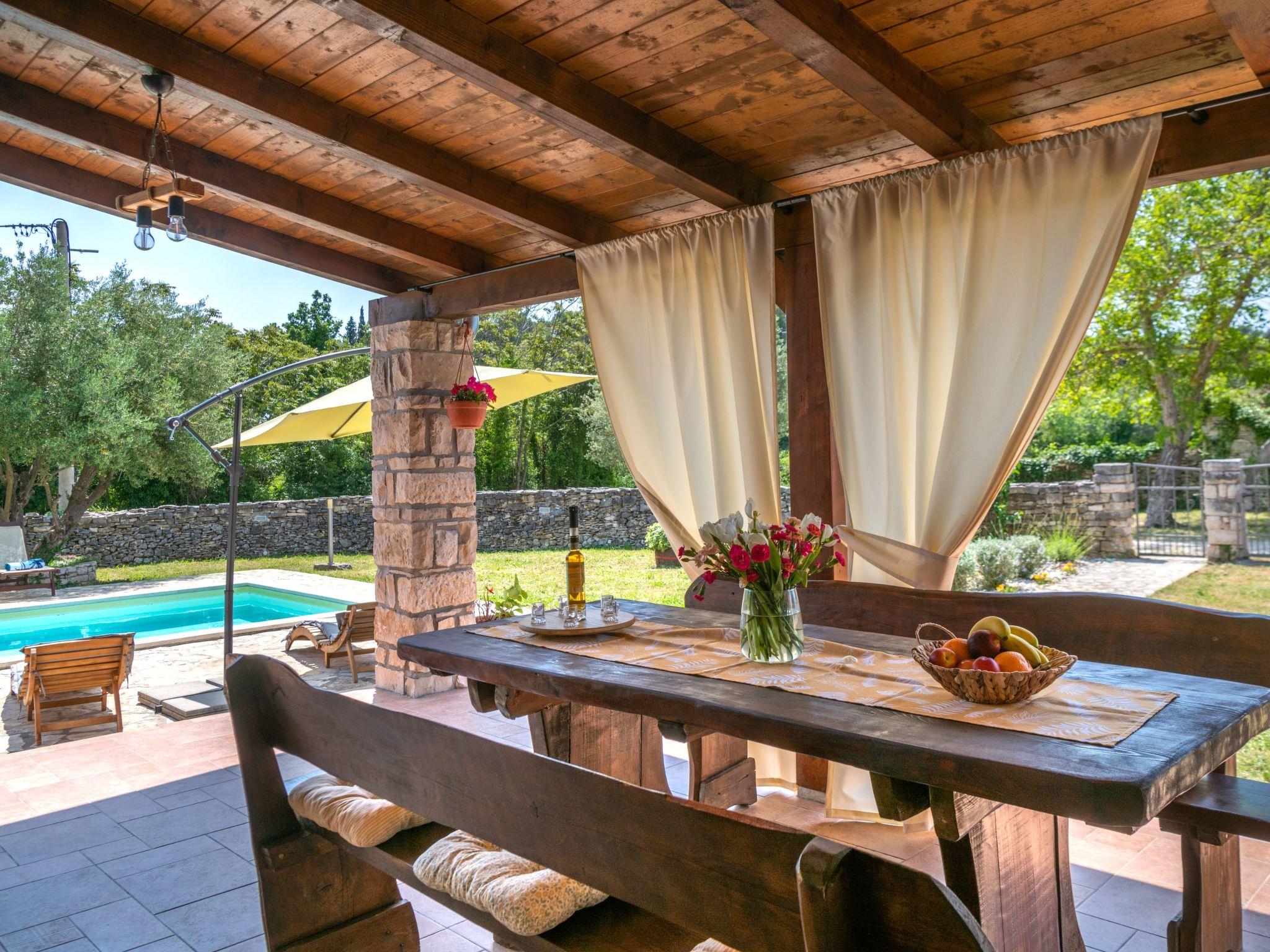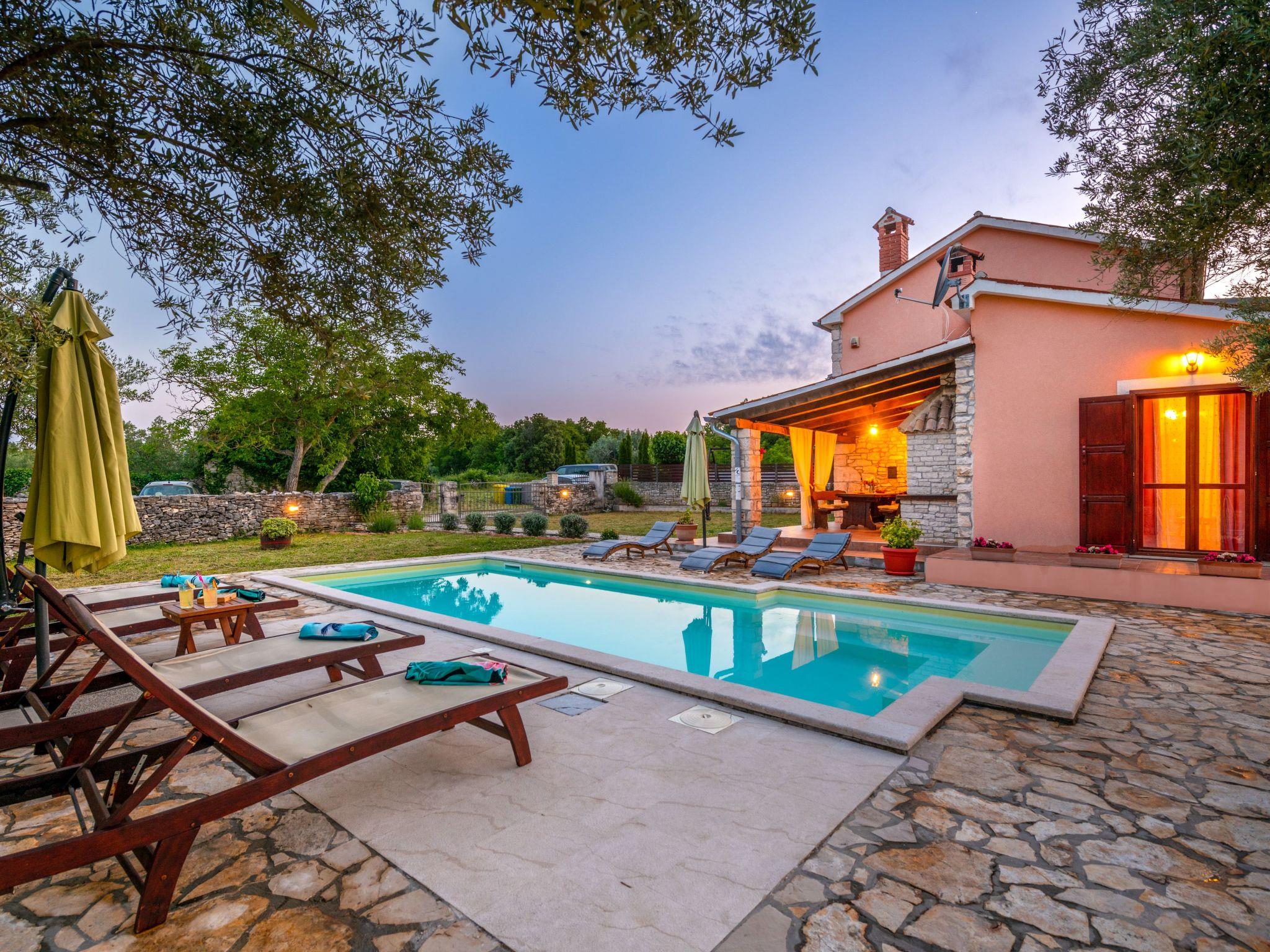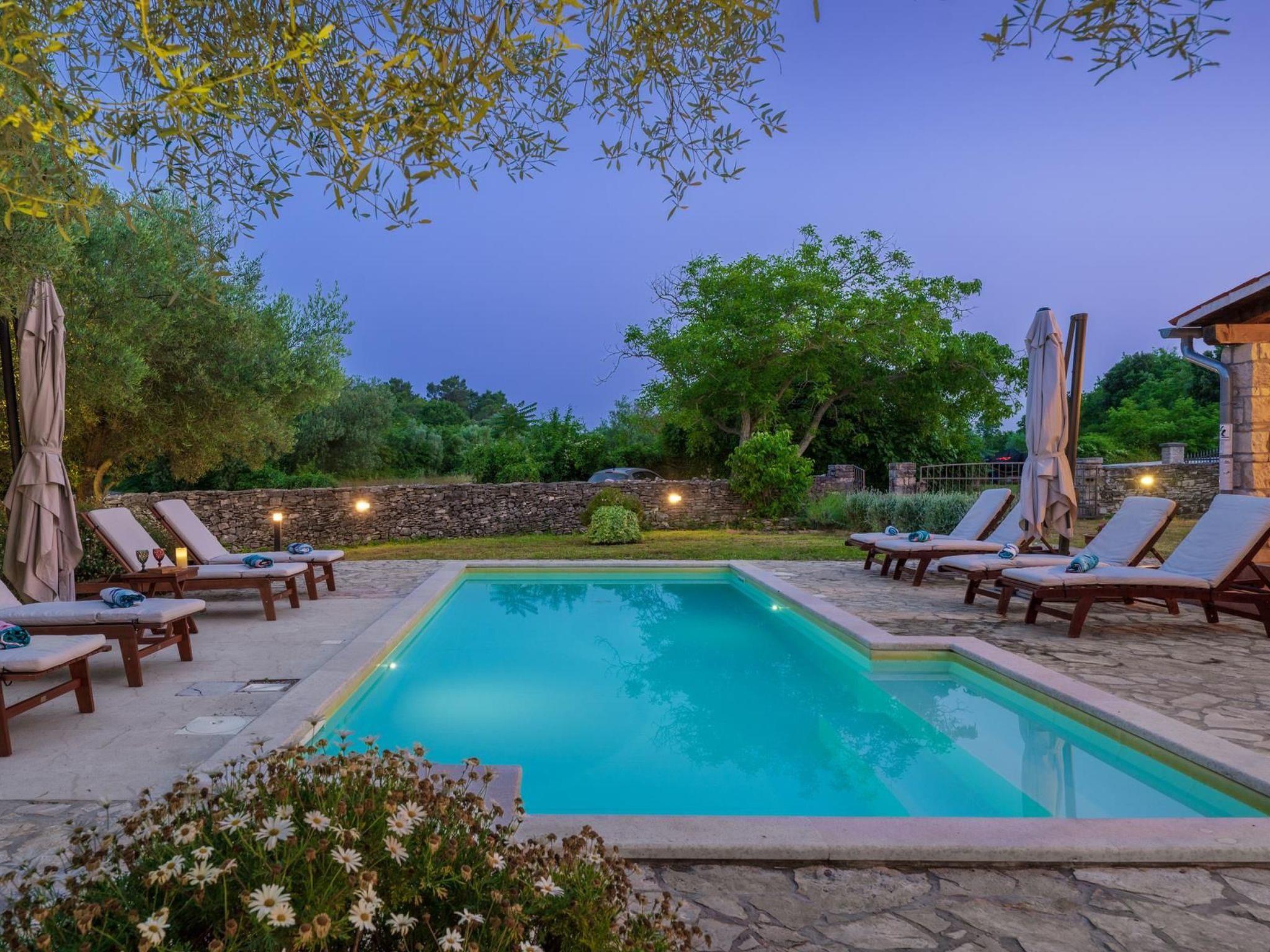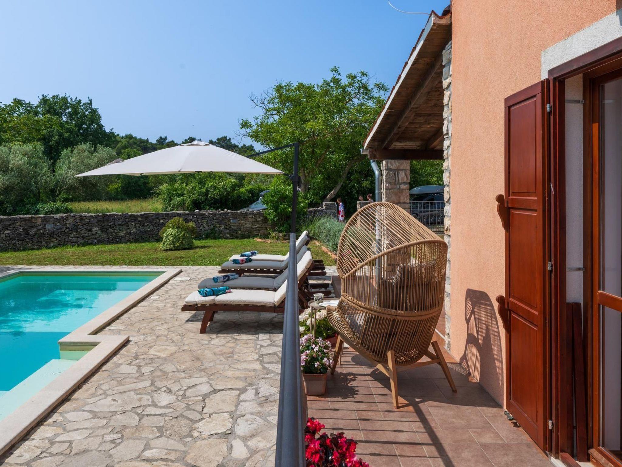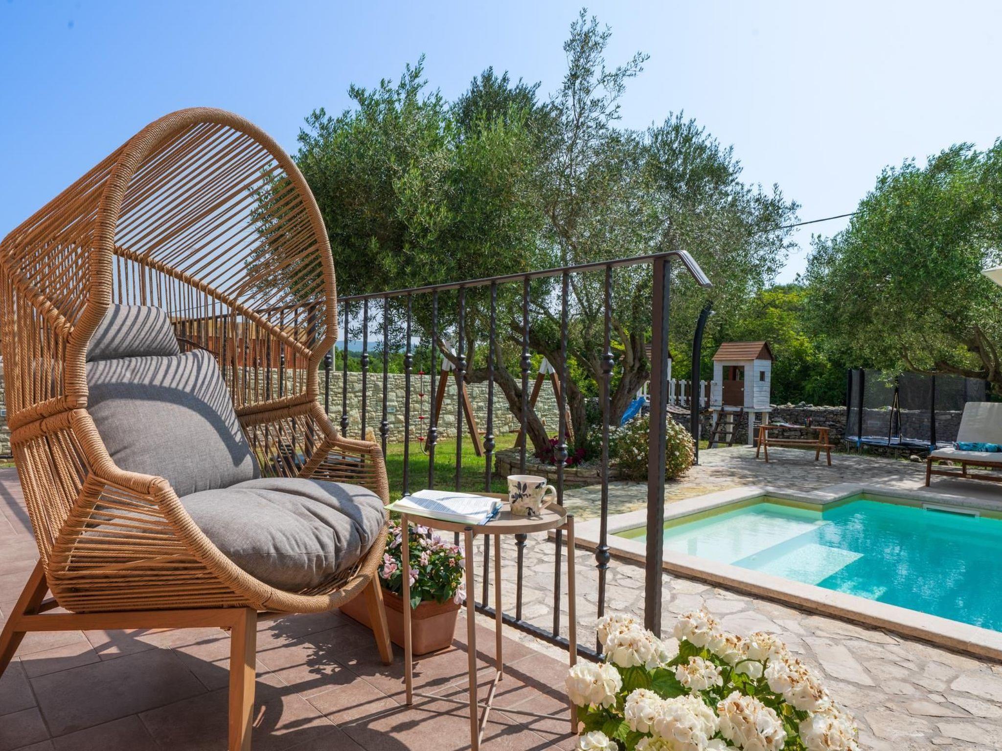 Charming semi – detached holiday house is located on the green spot at the end of the quiet village of Rakalj. The villa is surrounded by a spacious (2000m2) fenced garden with carefully maintained lawn and private swimming pool (27m2). House has been completely renovated where special attention is devoted to the preservation of traditional Istrian architecture and original interior design. Because of its position, the house offers complete peace and a relaxing atmosphere. Swings, playground and trampoline are on disposal for the recreation. Outdoor space provides guests privacy and children security. It is perfect for get - together, barbecue parties or just relaxed book reading. Guests can enjoy leisure time on the covered shaded terrace. Pebble and rocky beach is only 1 km distance ( possible to go only by foot) walking distance. Beach reachable with car is at 2,5 km distance.