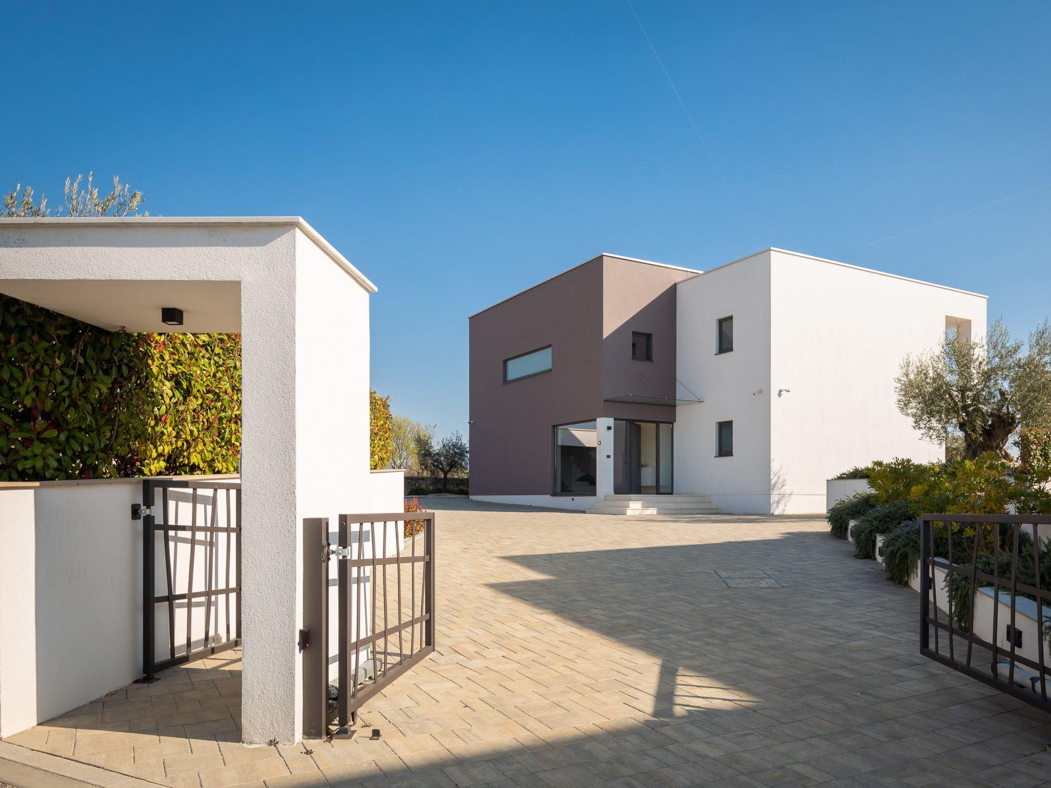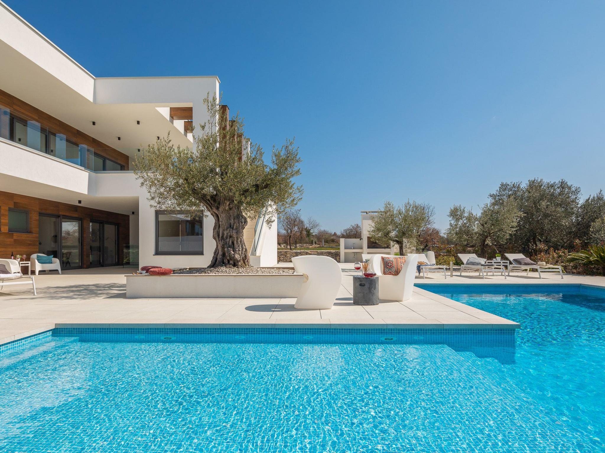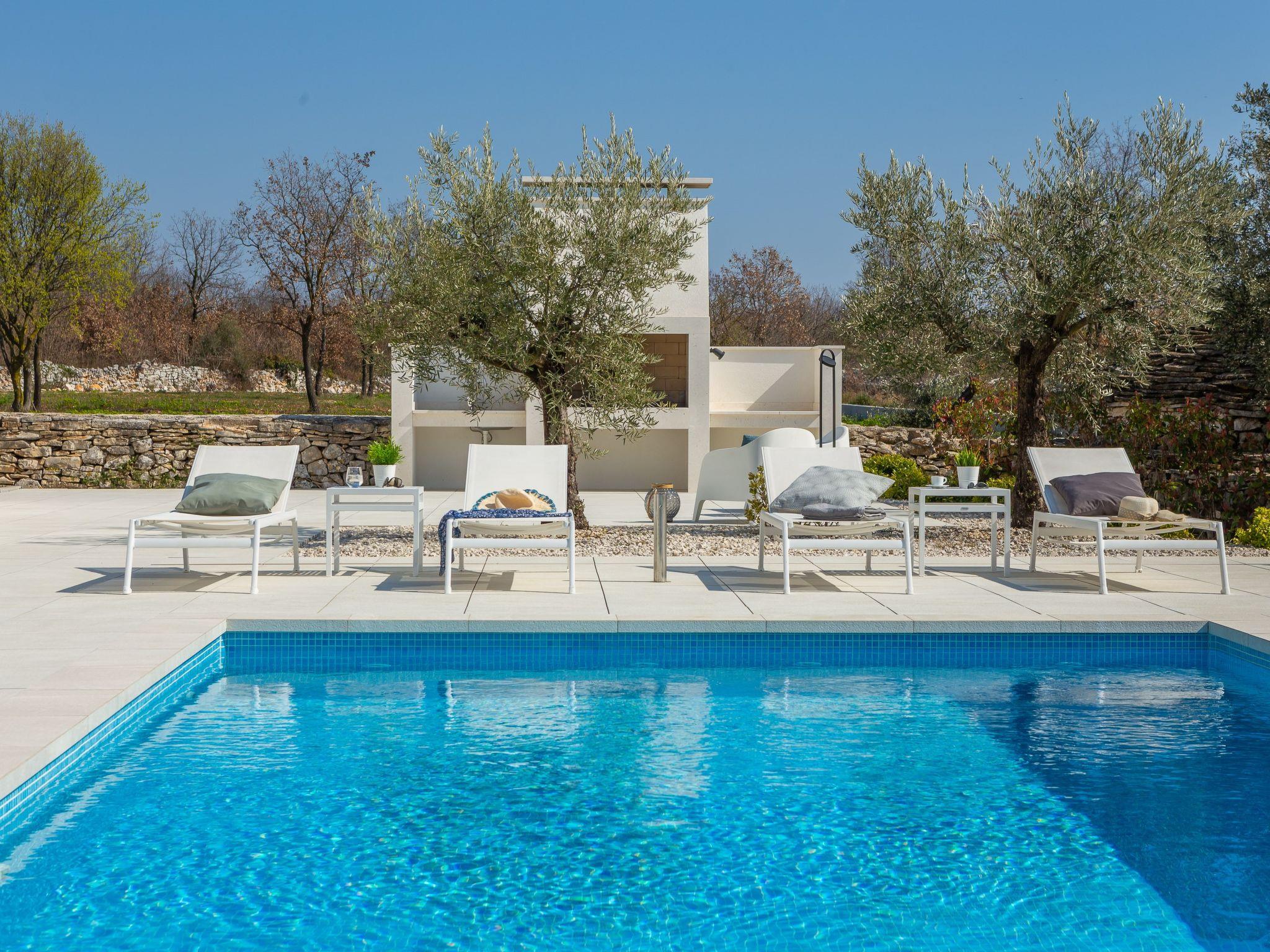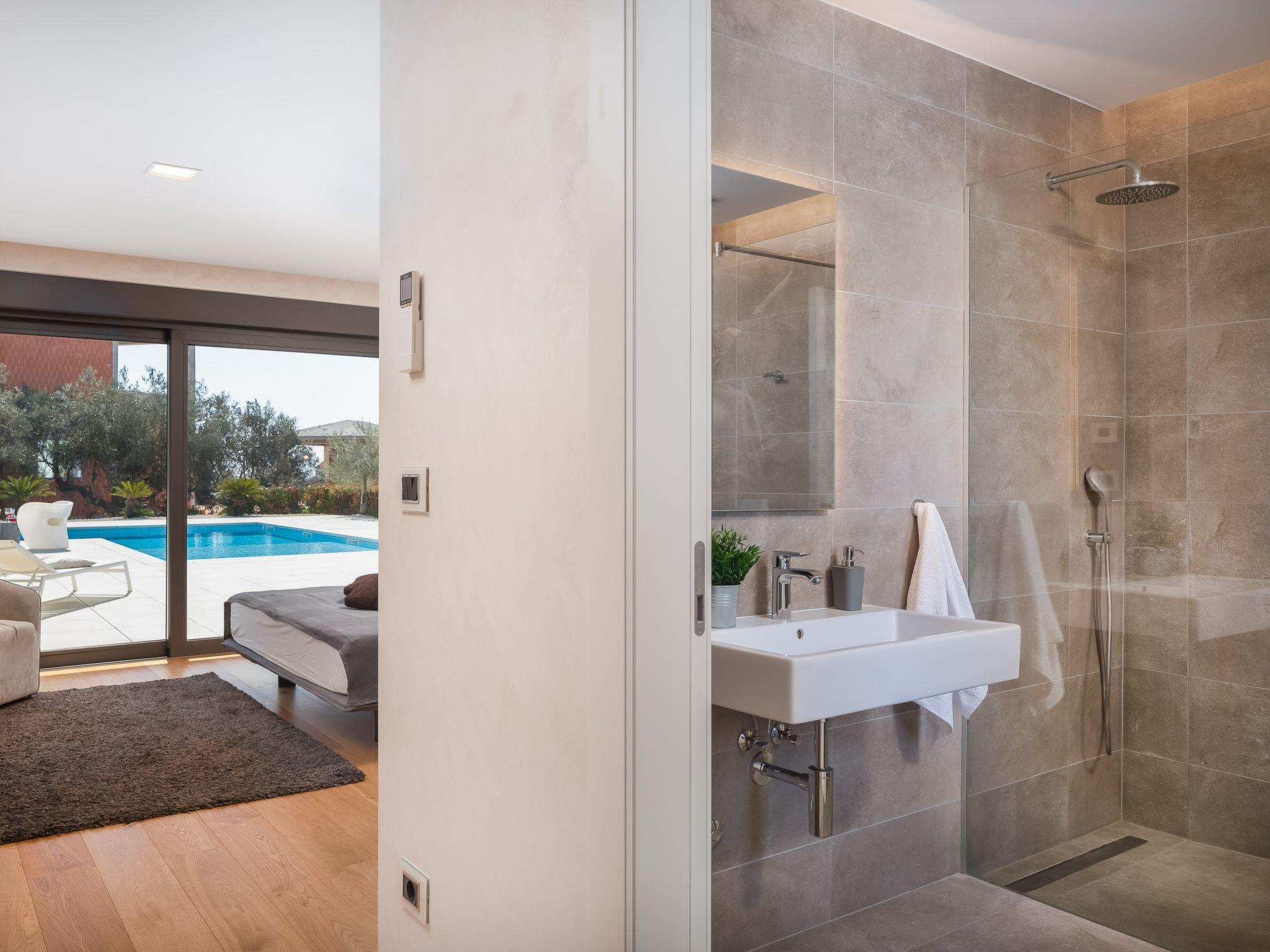 Vodnjan: Modern villa "Old Olive VIII", 3 storeys. In the hamlet Salvela 1 km from the centre of Vodnjan, 7 km from the centre of Fažana, 10 km from the centre of Pula, in a sunny position, 7 km from the sea. Private: property 1'000 m2 (fenced), garden with wildlife garden and trees, swimming pool (65 m2, depth 30 - 140 cm, seasonal availability: 01.Mar. - 01.Nov.) with internal staircase. Unconventional pool shape. Outdoor shower, hot tub, barbecue. In the house: internet access, sauna, table tennis, billiard table, table football, washing machine, tumble dryer. Parking (for 3 cars) at the house on the premises. Shop 1 km, supermarket 1 km, restaurant 1.5 km, bus stop 1.3 km, pebble beach 7 km, public bathing area 7 km. Golf course (18 hole) 7 km, tennis 2 km. Nearby attractions: NP Brijuni 7 km, Amphitheater 11 km. Groups of teenagers on request only.