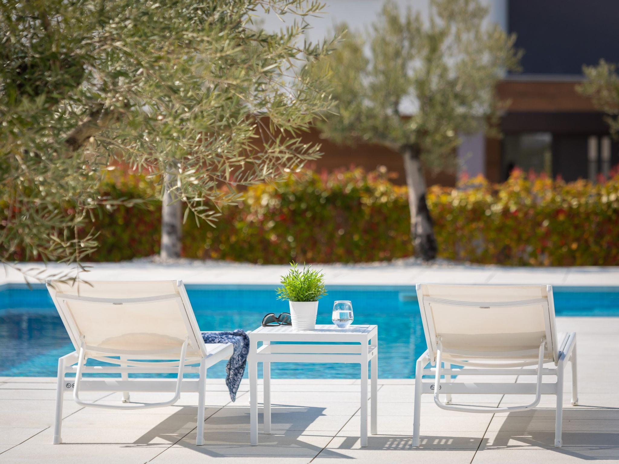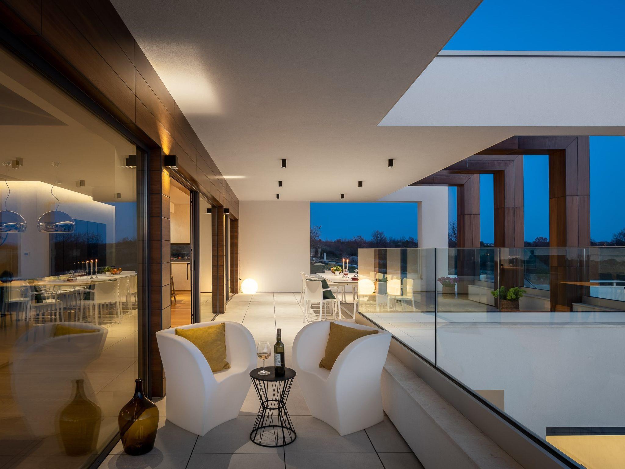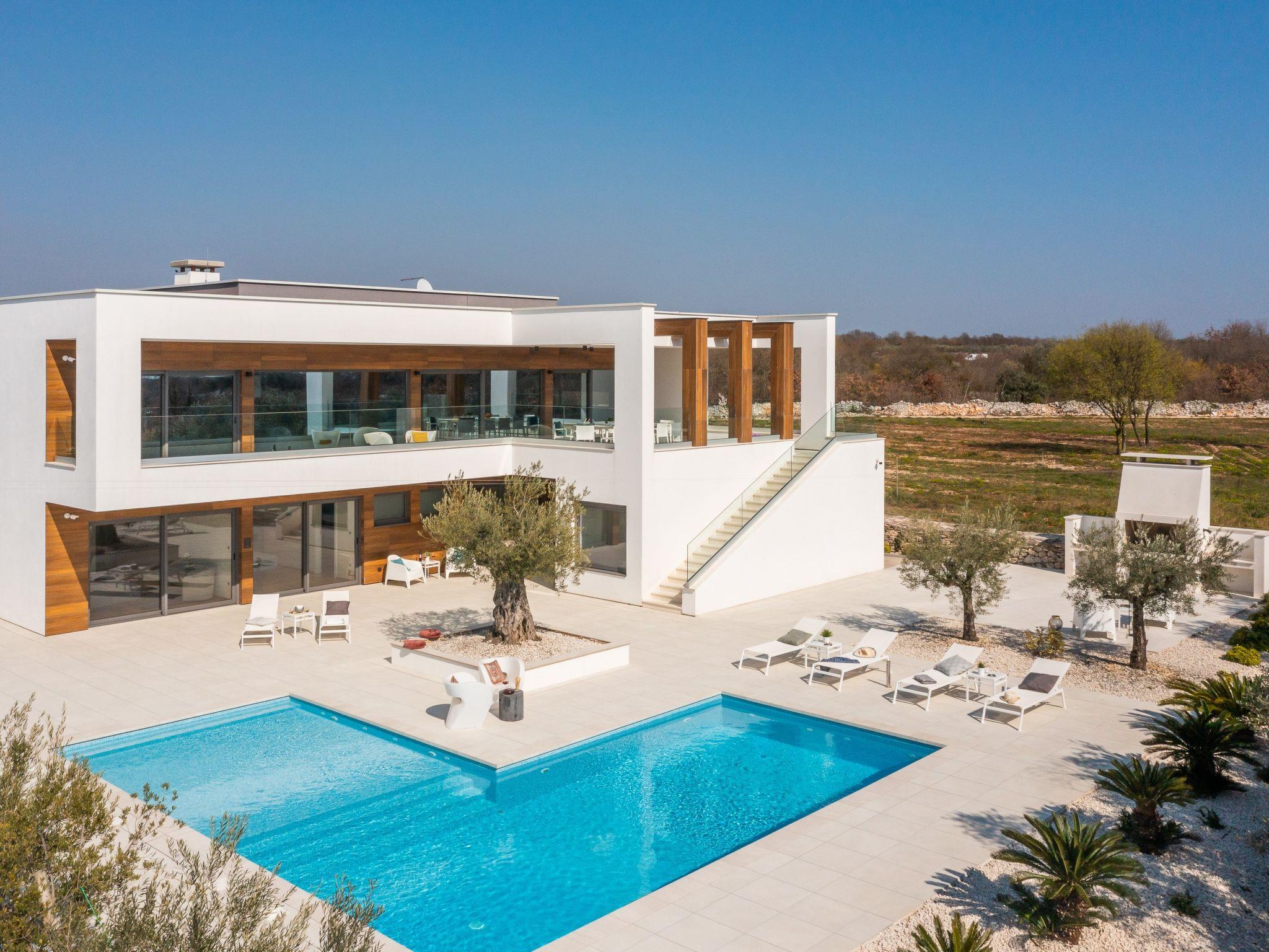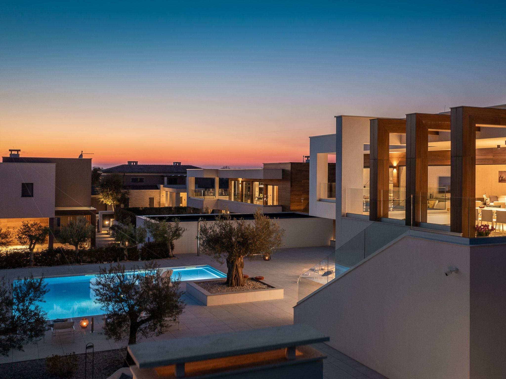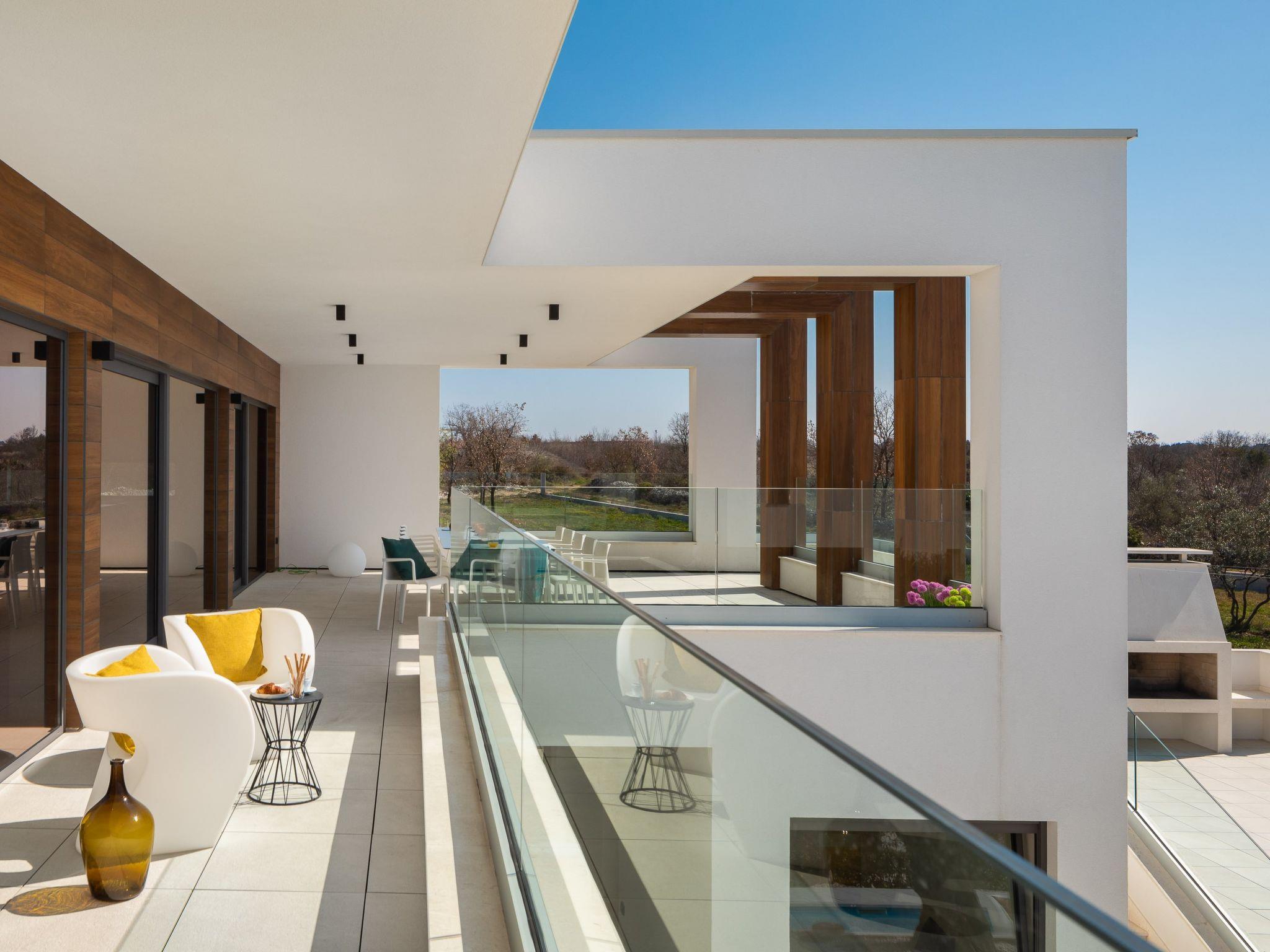 Vodnjan: Modern villa "Old Olive VIII", 3 storeys. In the hamlet Salvela 1 km from the centre of Vodnjan, 7 km from the centre of Fažana, 10 km from the centre of Pula, in a sunny position, 7 km from the sea. Private: property 1'000 m2 (fenced), garden with wildlife garden and trees, swimming pool (65 m2, depth 30 - 140 cm, seasonal availability: 01.Mar. - 01.Nov.) with internal staircase. Unconventional pool shape. Outdoor shower, hot tub, barbecue. In the house: internet access, sauna, table tennis, billiard table, table football, washing machine, tumble dryer. Parking (for 3 cars) at the house on the premises. Shop 1 km, supermarket 1 km, restaurant 1.5 km, bus stop 1.3 km, pebble beach 7 km, public bathing area 7 km. Golf course (18 hole) 7 km, tennis 2 km. Nearby attractions: NP Brijuni 7 km, Amphitheater 11 km. Groups of teenagers on request only.