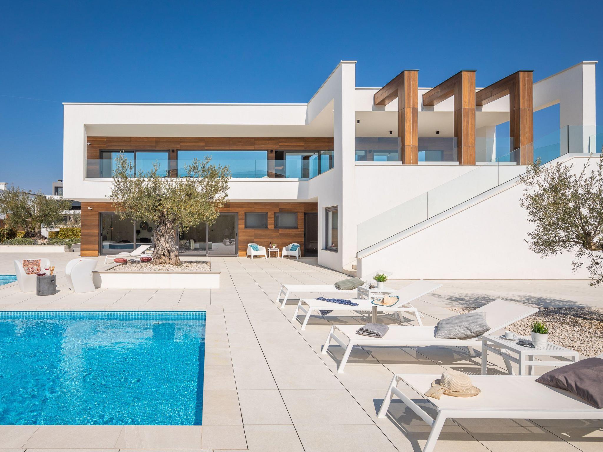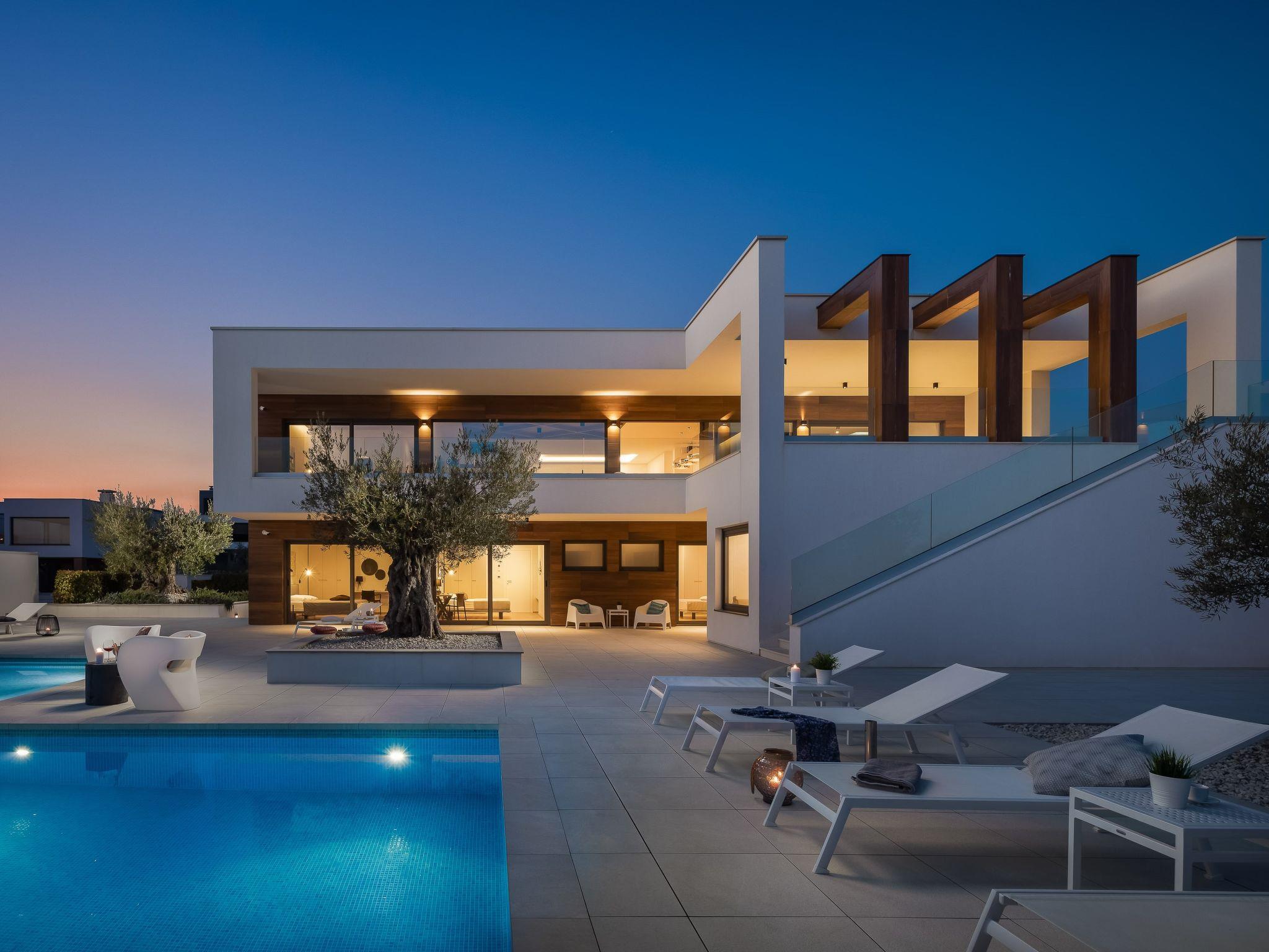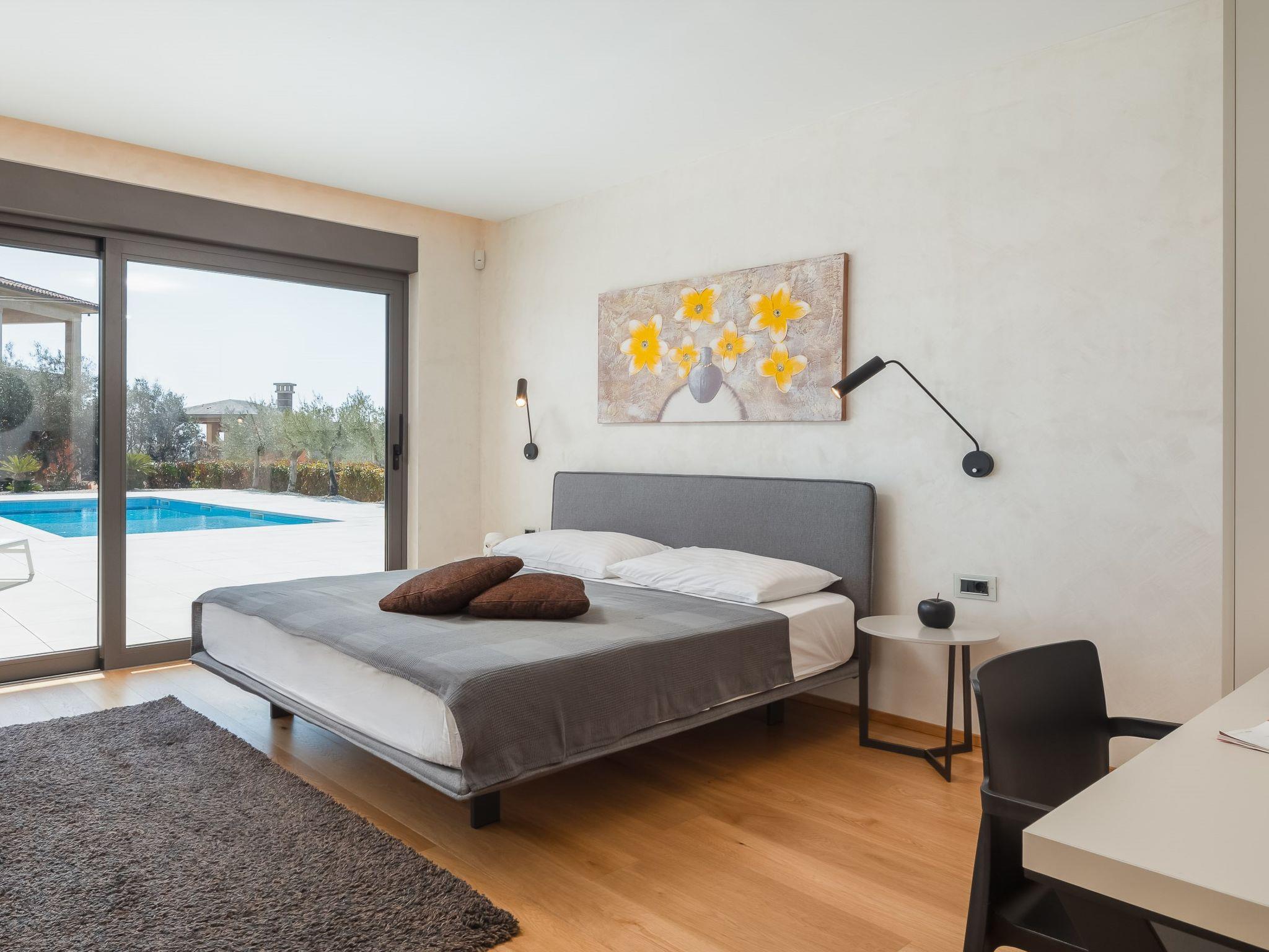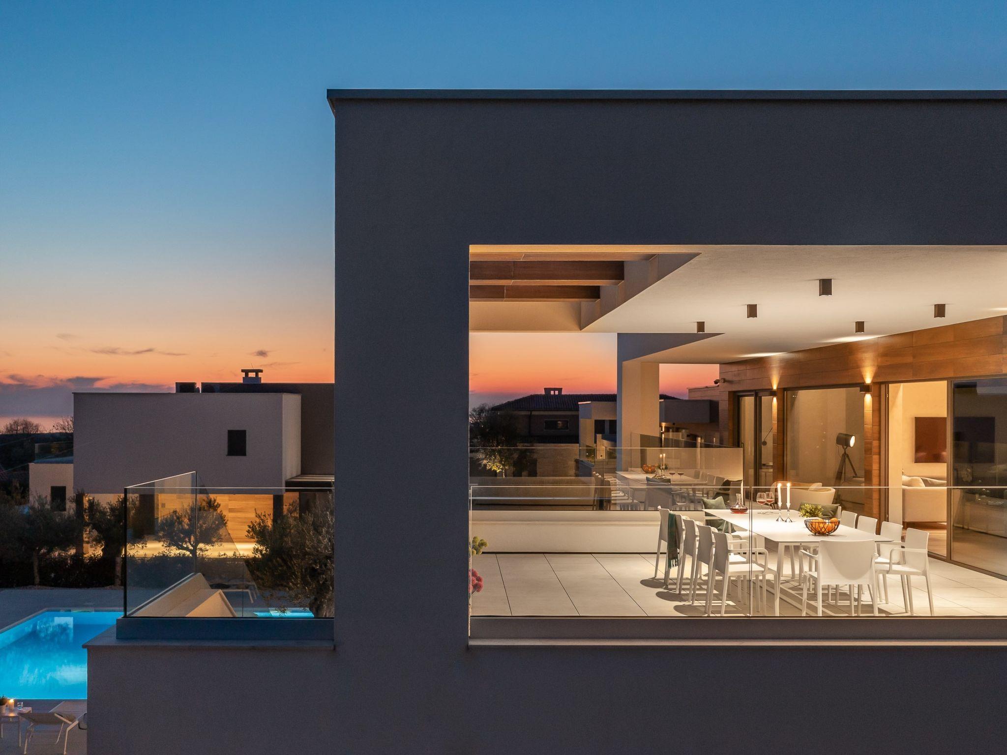 Vodnjan: Modern villa "Old Olive VIII", 3 storeys. In the hamlet Salvela 1 km from the centre of Vodnjan, 7 km from the centre of Fažana, 10 km from the centre of Pula, in a sunny position, 7 km from the sea. Private: property 1'000 m2 (fenced), garden with wildlife garden and trees, swimming pool (65 m2, depth 30 - 140 cm, seasonal availability: 01.Mar. - 01.Nov.) with internal staircase. Unconventional pool shape. Outdoor shower, hot tub, barbecue. In the house: internet access, sauna, table tennis, billiard table, table football, washing machine, tumble dryer. Parking (for 3 cars) at the house on the premises. Shop 1 km, supermarket 1 km, restaurant 1.5 km, bus stop 1.3 km, pebble beach 7 km, public bathing area 7 km. Golf course (18 hole) 7 km, tennis 2 km. Nearby attractions: NP Brijuni 7 km, Amphitheater 11 km. Groups of teenagers on request only.