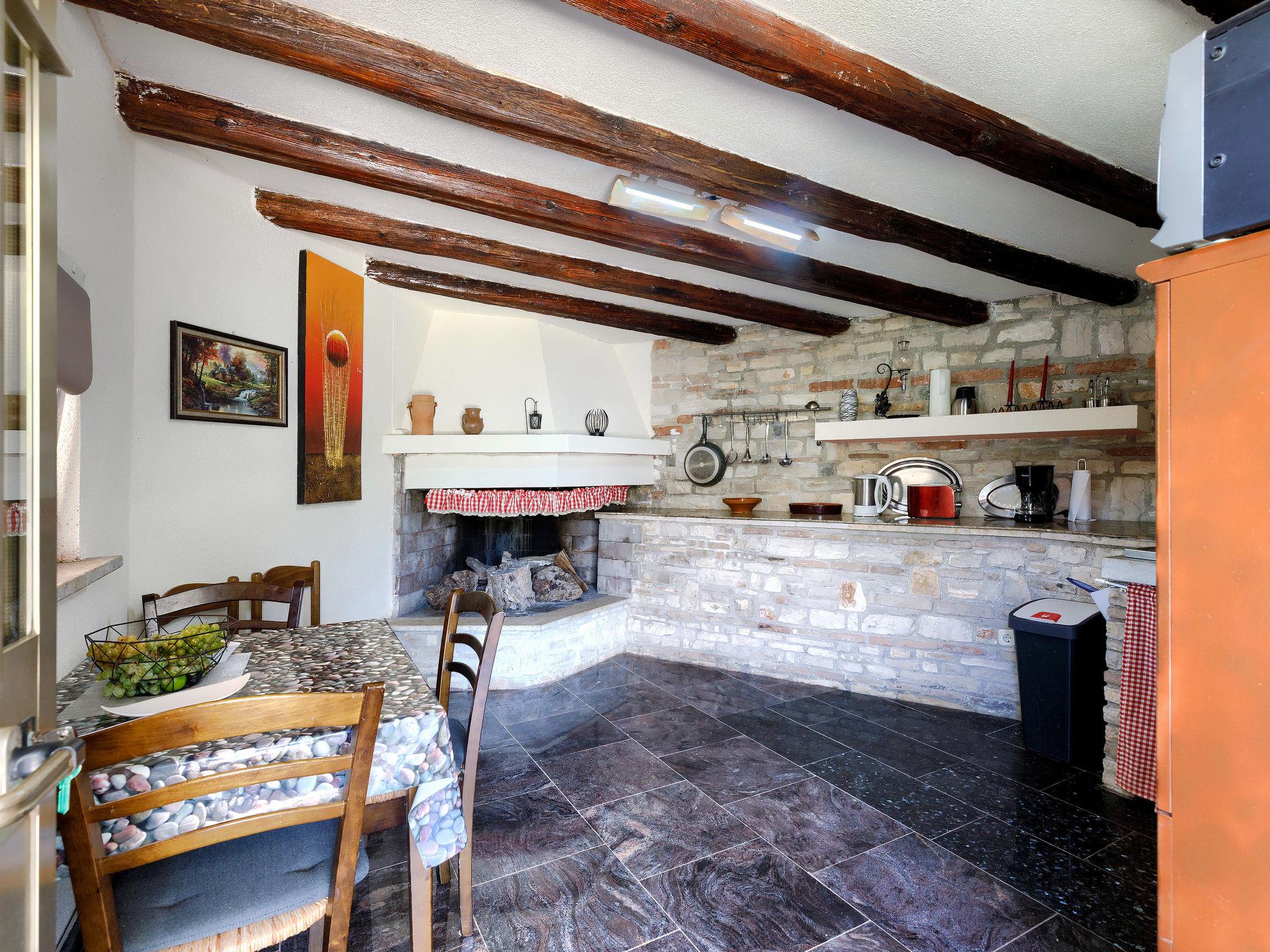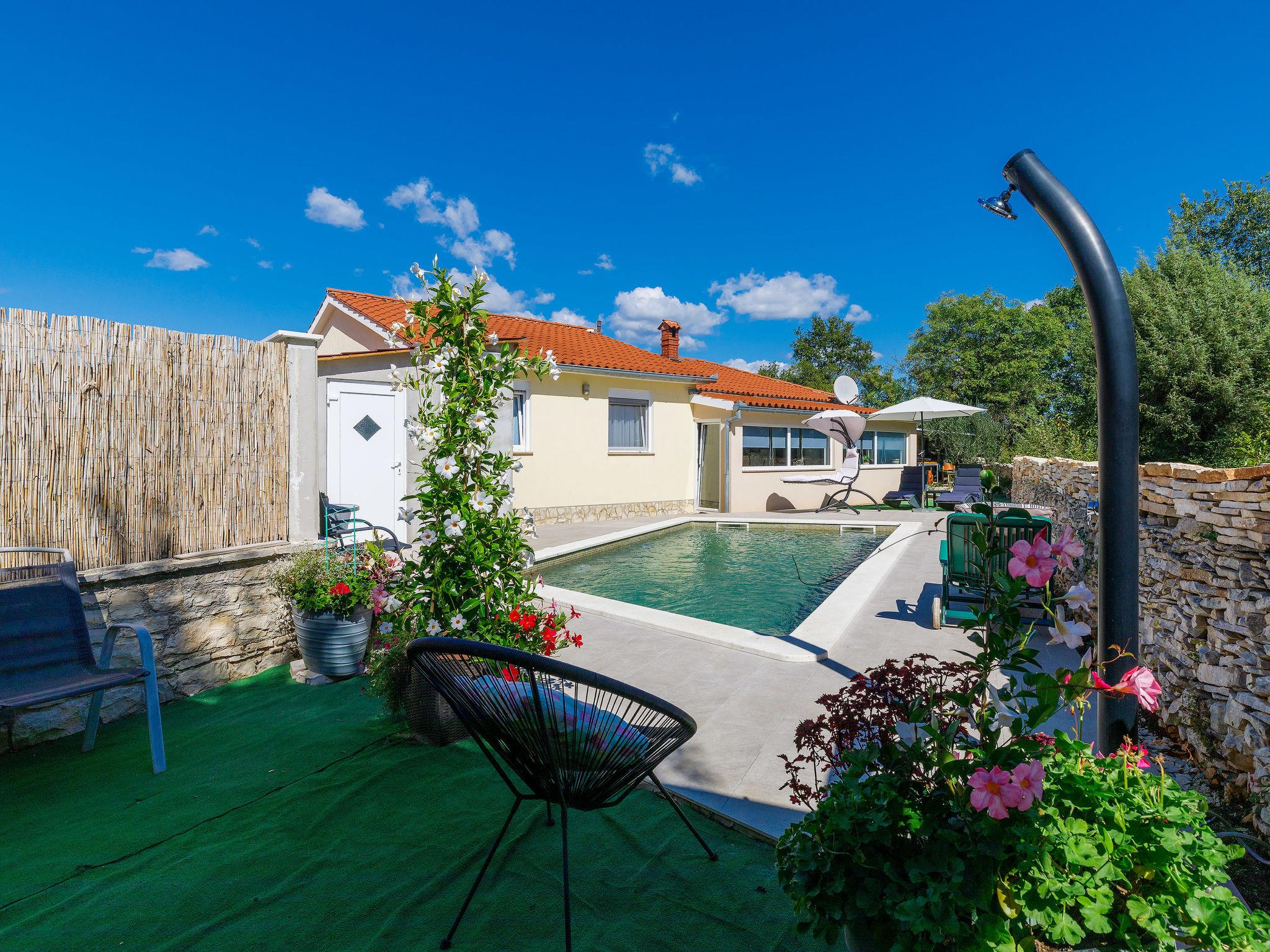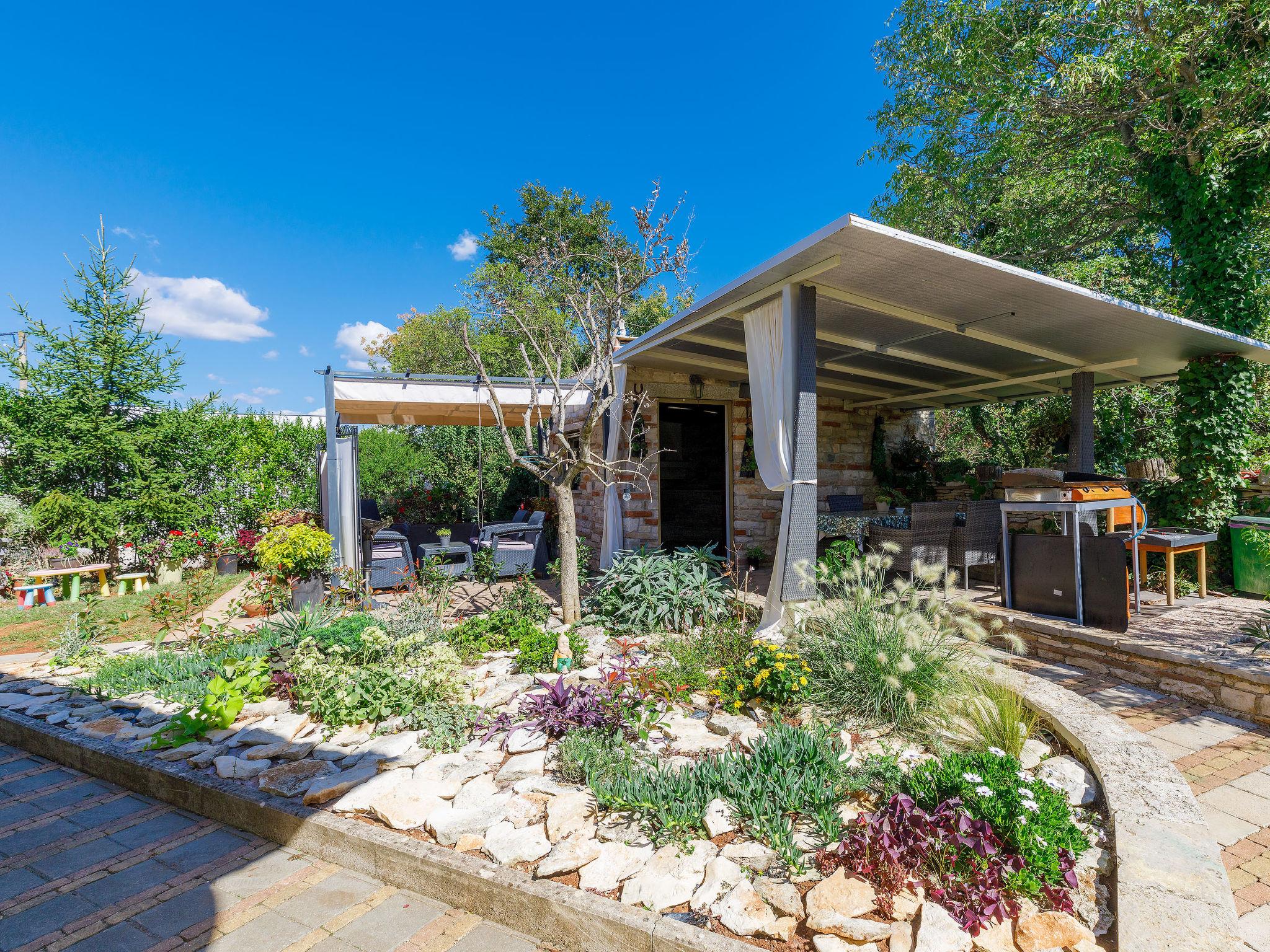 Single-family house "Marija". In the hamlet Kacana 3.5 km from the centre of Vodnjan, 10 km from the centre of Pula, 10 km from the sea. Private: property 600 m2 (fenced), wildlife garden and flowers, swimming pool (28 m2, depth 135 - 140 cm, seasonal availability: 13.May. - 13.Oct.) with internal staircase. Unconventional pool shape. WC in the pool area, outdoor shower, table tennis, terrace, garden furniture, pool maintenance by the owner/gardener. In the house: internet access, billiard table, washing machine. Motor access to the house (100 m via unmade road). Parking (for 3 cars) at the house on the premises. Shop 3.5 km, shopping centre 10 km, restaurant 3.5 km, café 3.5 km, bus stop 2.8 km, pebble beach 10 km. Groups of teenagers on request only. Please note: airfield 15 km from the property. For privately use: tavern with fridge, dishwasher, dining table, cooking stove with 2 hot plates.