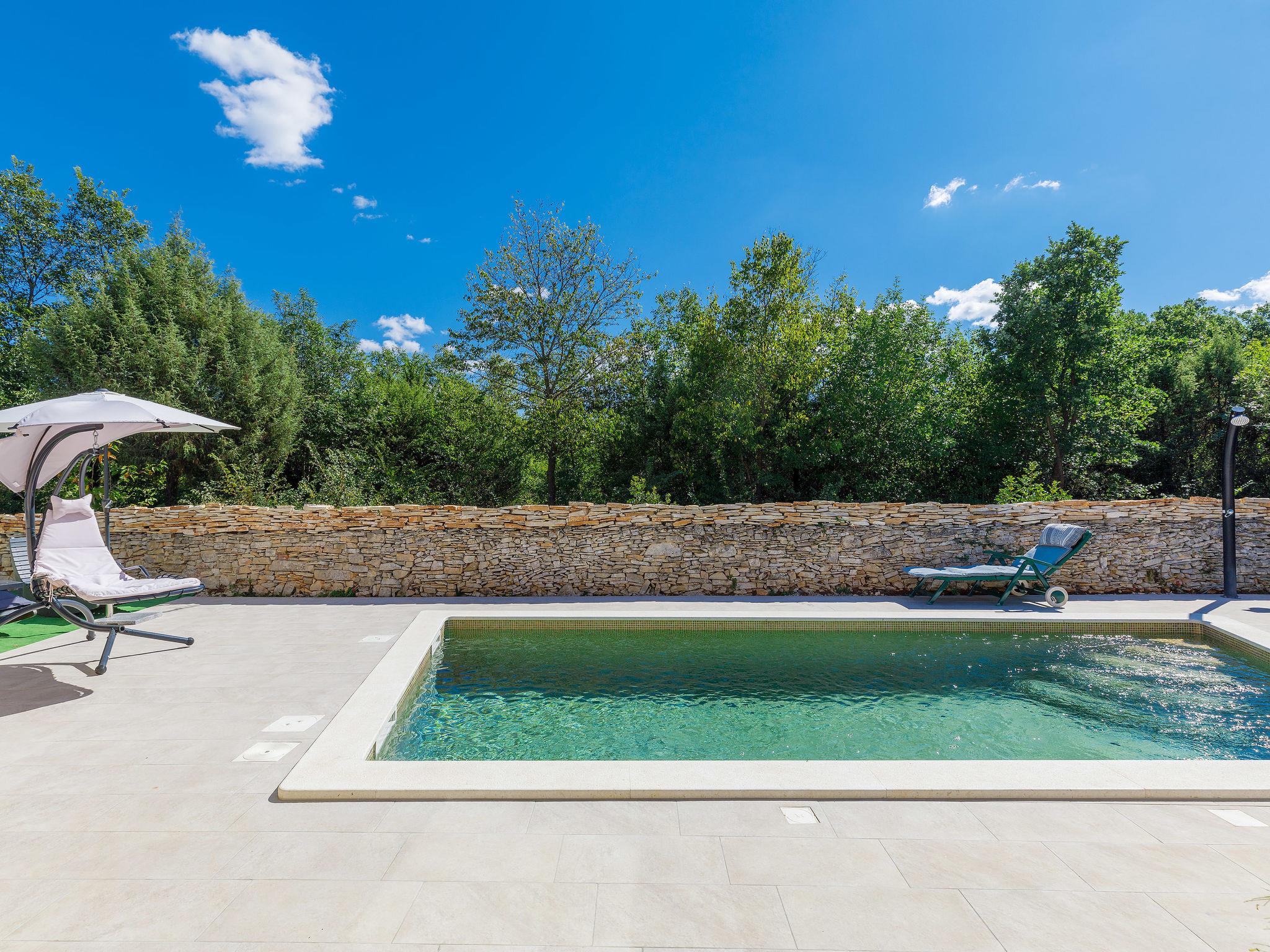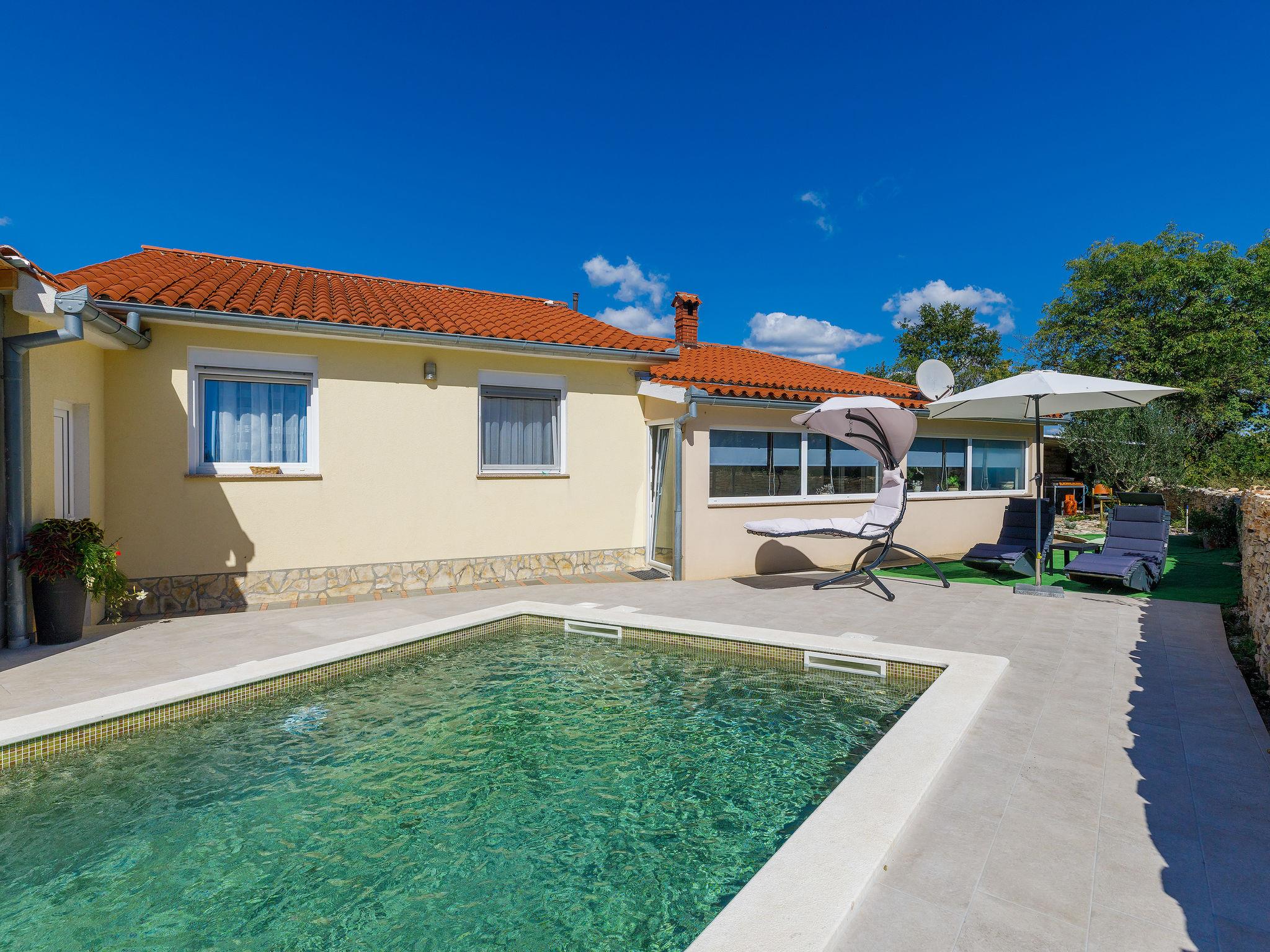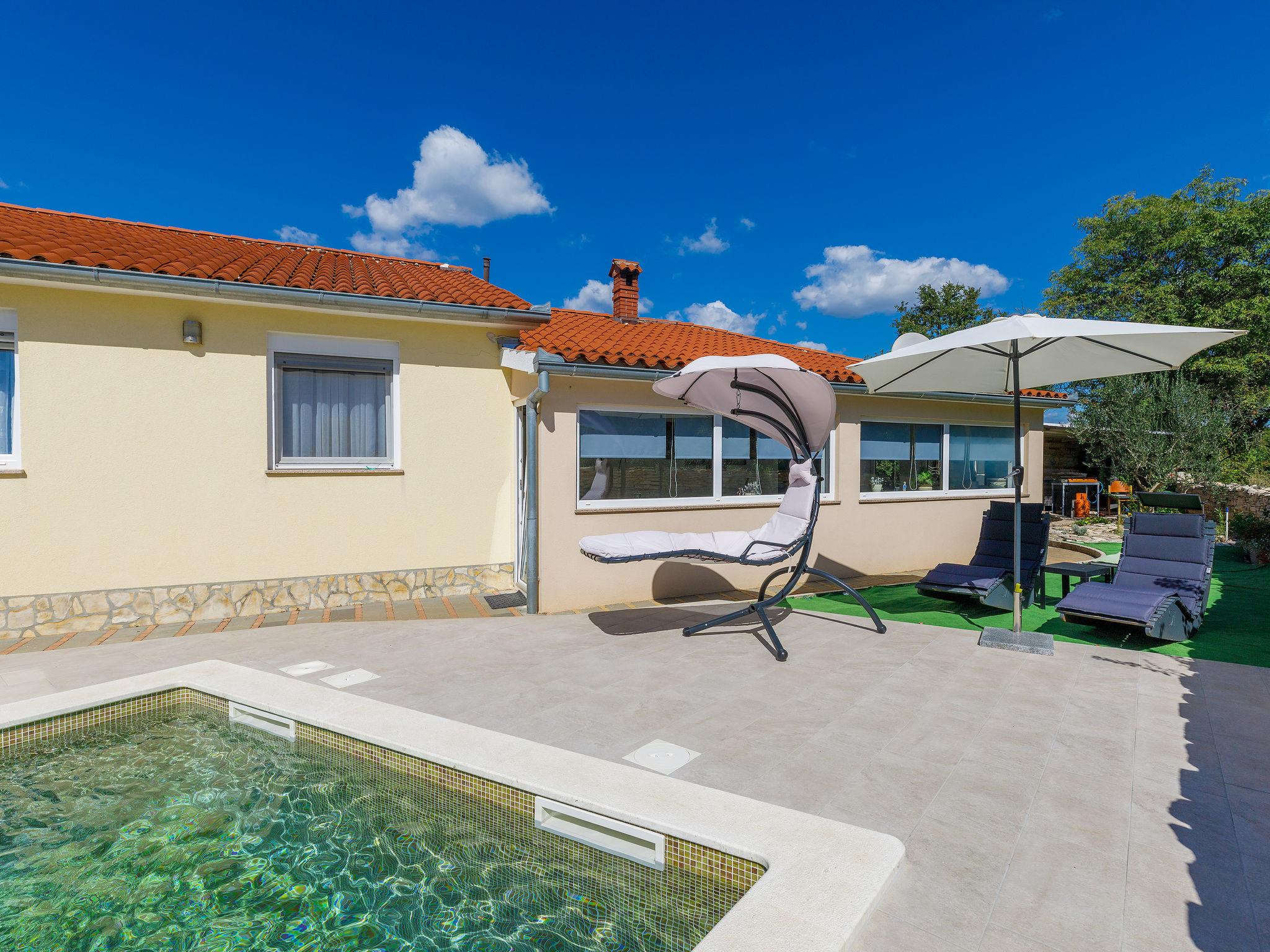 Single-family house "Marija". In the hamlet Kacana 3.5 km from the centre of Vodnjan, 10 km from the centre of Pula, 10 km from the sea. Private: property 600 m2 (fenced), wildlife garden and flowers, swimming pool (28 m2, depth 135 - 140 cm, seasonal availability: 13.May. - 13.Oct.) with internal staircase. Unconventional pool shape. WC in the pool area, outdoor shower, table tennis, terrace, garden furniture, pool maintenance by the owner/gardener. In the house: internet access, billiard table, washing machine. Motor access to the house (100 m via unmade road). Parking (for 3 cars) at the house on the premises. Shop 3.5 km, shopping centre 10 km, restaurant 3.5 km, café 3.5 km, bus stop 2.8 km, pebble beach 10 km. Groups of teenagers on request only. Please note: airfield 15 km from the property. For privately use: tavern with fridge, dishwasher, dining table, cooking stove with 2 hot plates.
